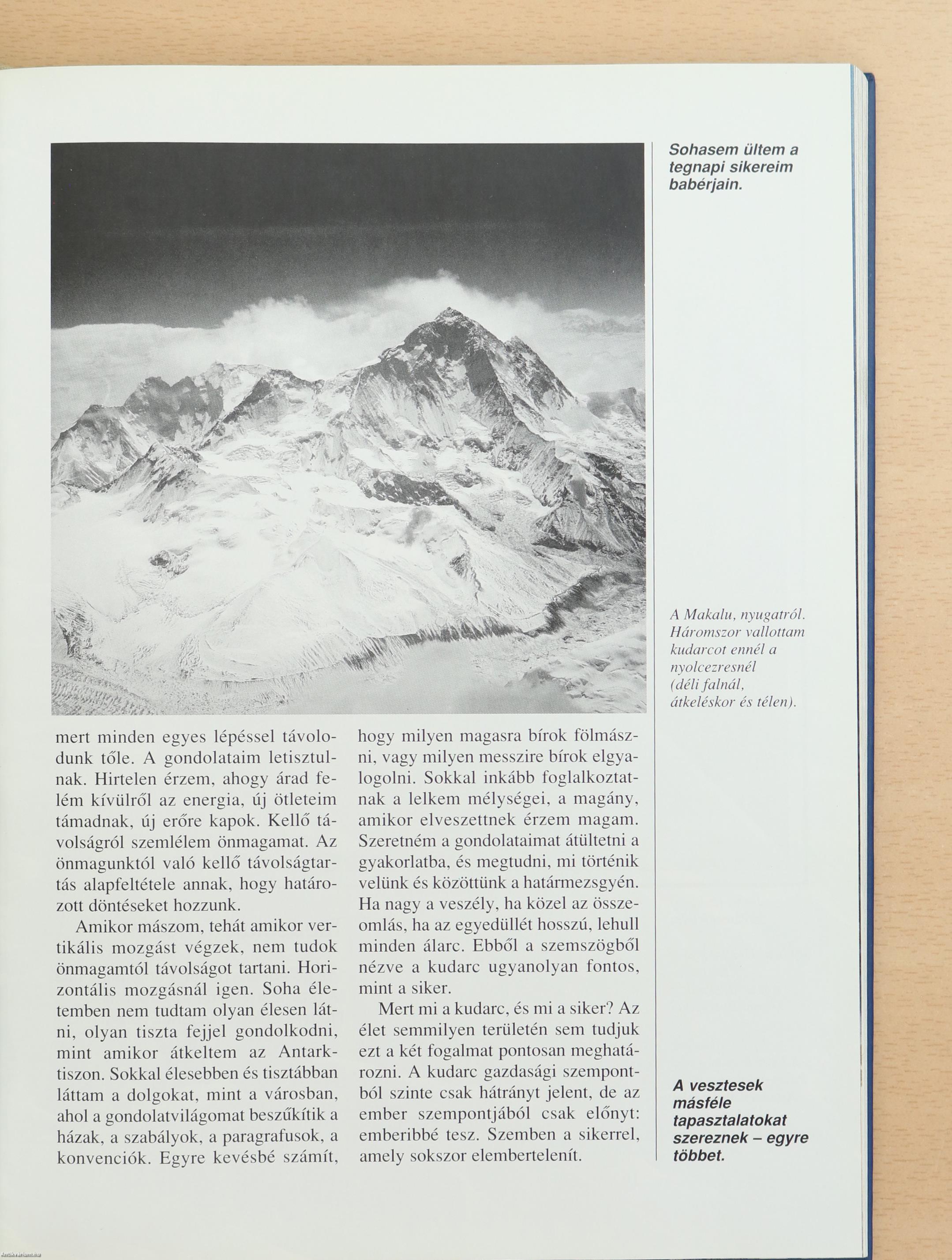 Legalább húsz évvel fiatalabbnak látszott koránál. Azon tűnődtem, milyen géneket örökölhetett szüleitől ez a dél-tiroli férfi, egyáltalán a gének milyen szerencsés kombinációja tette őt képessé szinte felfoghatatlan fizikai teljesítményekre, akár a magashegységek, akár a sarkvidékek jégvilágában. Vagy a fizikumánál fontosabb különleges lelkiereje, a lehetetlen határain állandóan túllépő pszichikuma? Avagy egyszerűen a sors kegyeltje-e, hogy annyi életveszélyes kaland után még egyáltalán életben van? Mert hiába a legkiválóbb testi-lelki adottság, a jégvilágban - ahol mindennaposak a lavinák, a jégomlások - állandóan ott leselkedik a halál. A vén kaszás gyermekkora óta ott settenkedett körülötte, anélkül, hogy Messner gondolt volna erre. Csak akkor szembesült vele, amikor 1970-ben a Nanga Parbatról visszatérőben öccse életét vesztette. Nem tehető felelőssé testvére haláláért, hiszen Günther saját elhatározásából indult bátyja után. Mást nyilván egész életére elriasztana a hegymászástól egy ilyen tragédia - az én családomban is volt erre példa-, Reinhold Messner fanatizmusát azonban nem törte meg a haláleset, sőt, egyre nagyobb célok elérésére sarkallta.