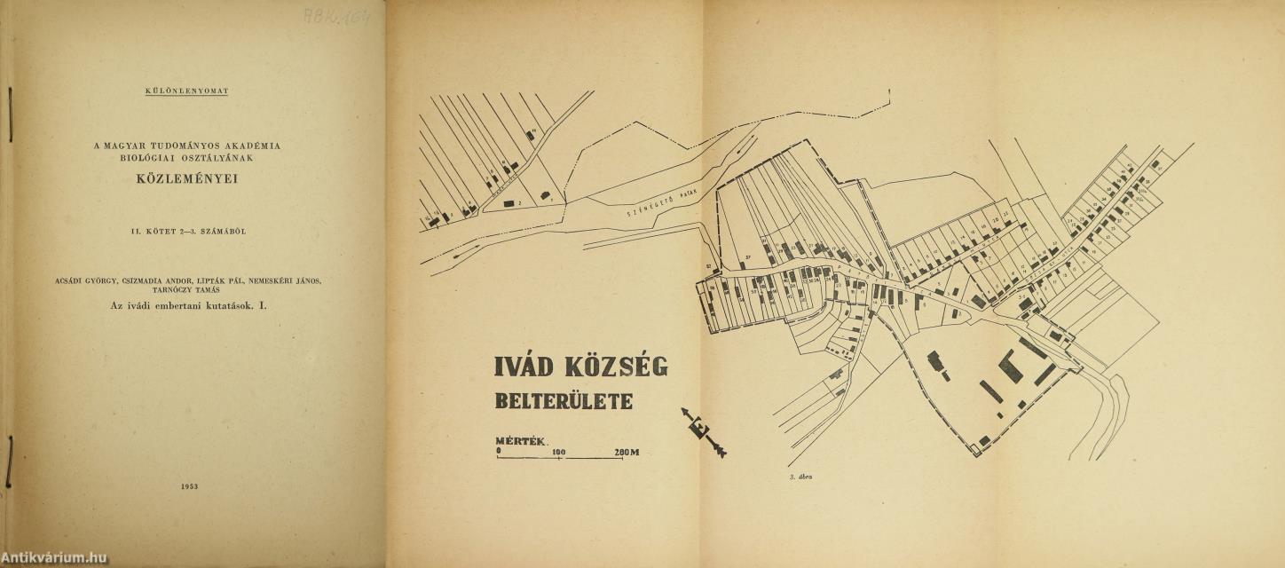 Első kiadás. Az ivádi embertani kutatások I. Különlenyomat a Magyar Tudományos Akadémia Biológia Osztályának Közleményei II. kötet 2-3. számából. Írta: Acsádi György, Csizmadia Andor, Lipták Pál, Nemeskéri János, Tarnóczy Tamás. Bevezetéssel, szöveg közti, képaláírással kiegészített, fekete-fehér illusztrációkkal, csillagozott lábjegyzetekkel, irodalomjegyzékekkel, kihajtható mellékletekkel, tartalomjegyzékkel ellátott könyv. Néhány lapon ceruzával írt bejegyzés és egykori tulajdonosi bélyegzés látható. A könyvet az Akadémiai nyomda nyomtatta Budapesten. Kiadói papírkötésben lévő példány feliratozott címfedéllel, feliratozatlan könyvgerinccel, tartalomjegyzékkel és kiadási adatokkal ellátott hátlappal, utólagosan áttűzött könyvtesttel, hiánytalan állapotban.