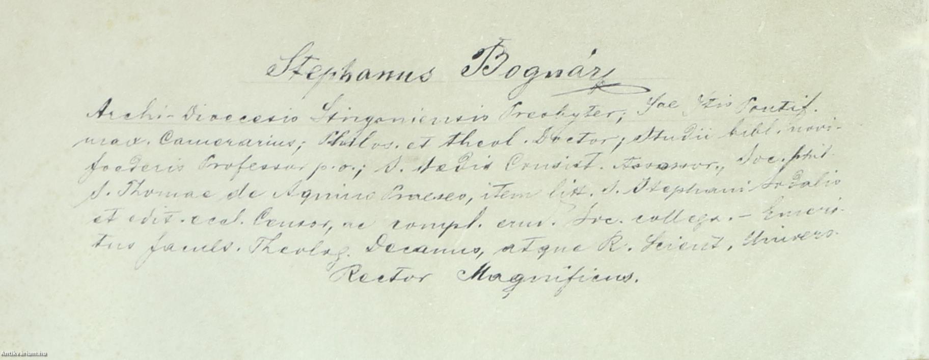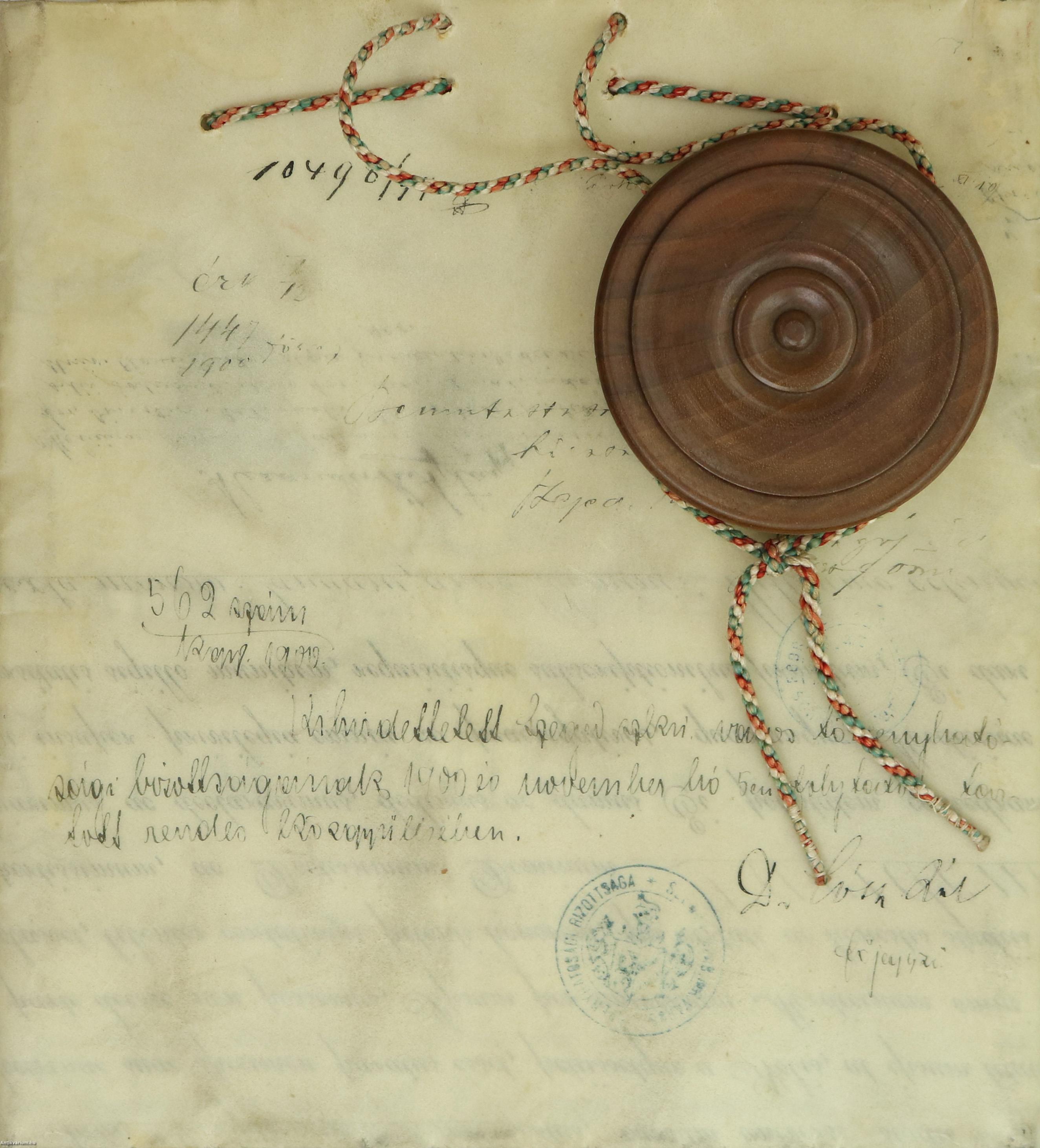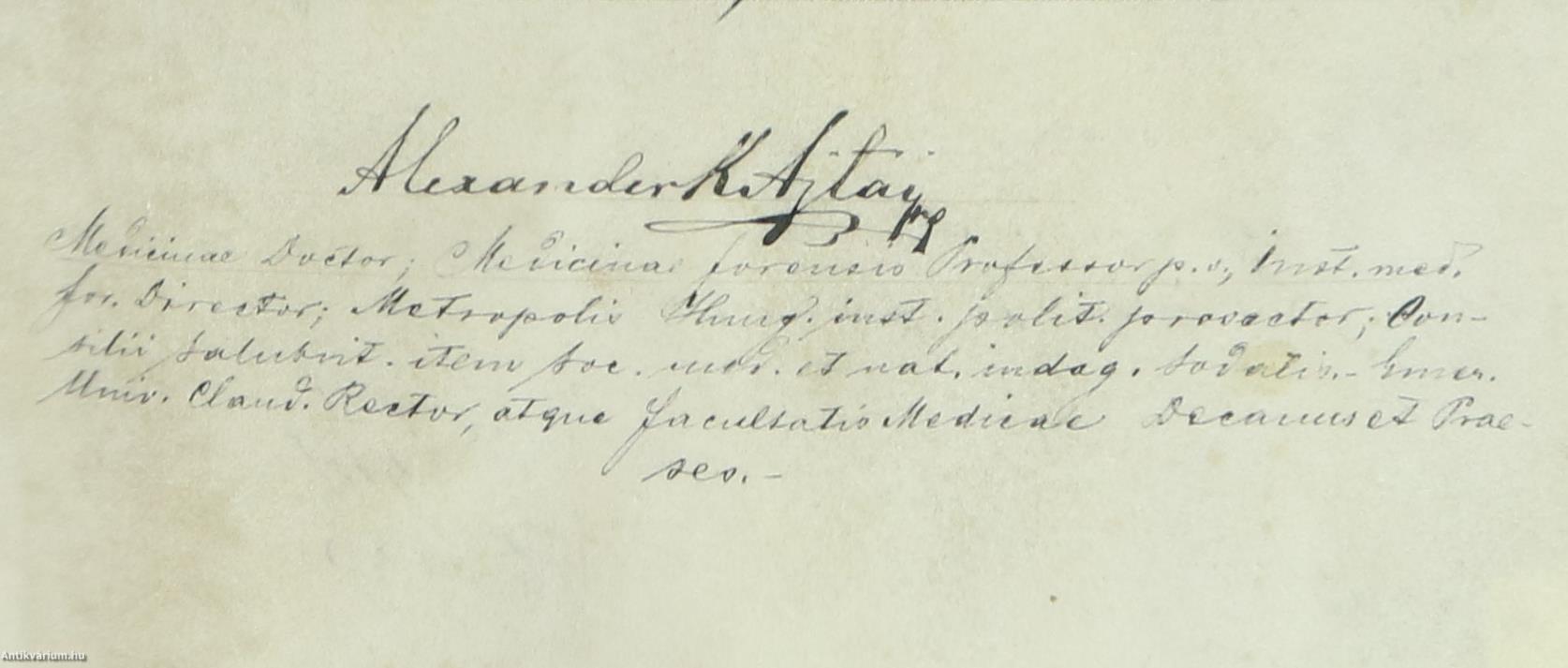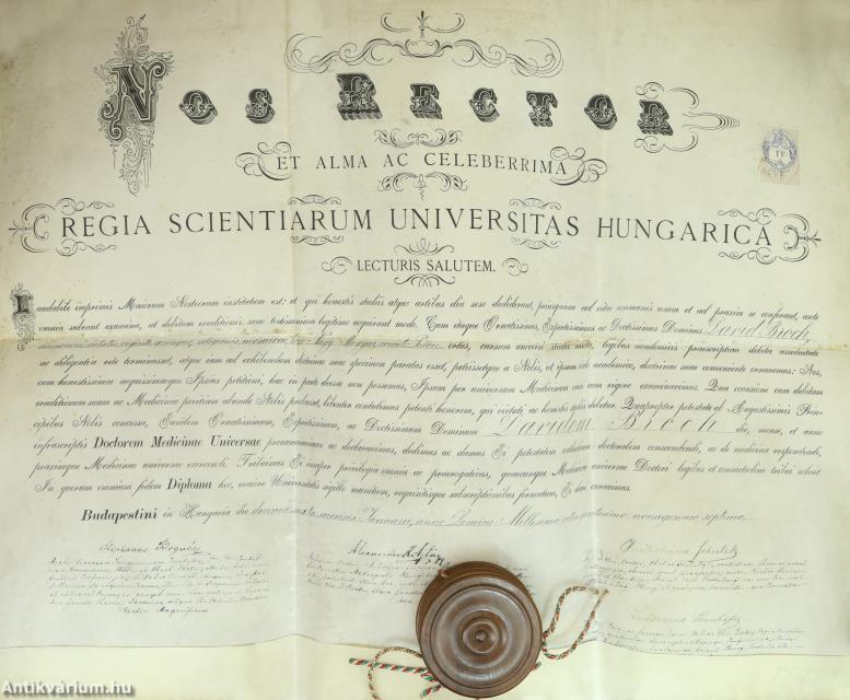 Bognár István, a Budapesti Tudományegyetem rektora, valamint Ajtay K. Sándor és Ludovicus Thanhoffer, az egyetem orvosi karának dékánjai által aláírt példány.Nos Rector Et Alma Ac Celeberrima Regia Scientiarum Universitas Hungarica – Latin nyelvű orvosi diploma, 1897.