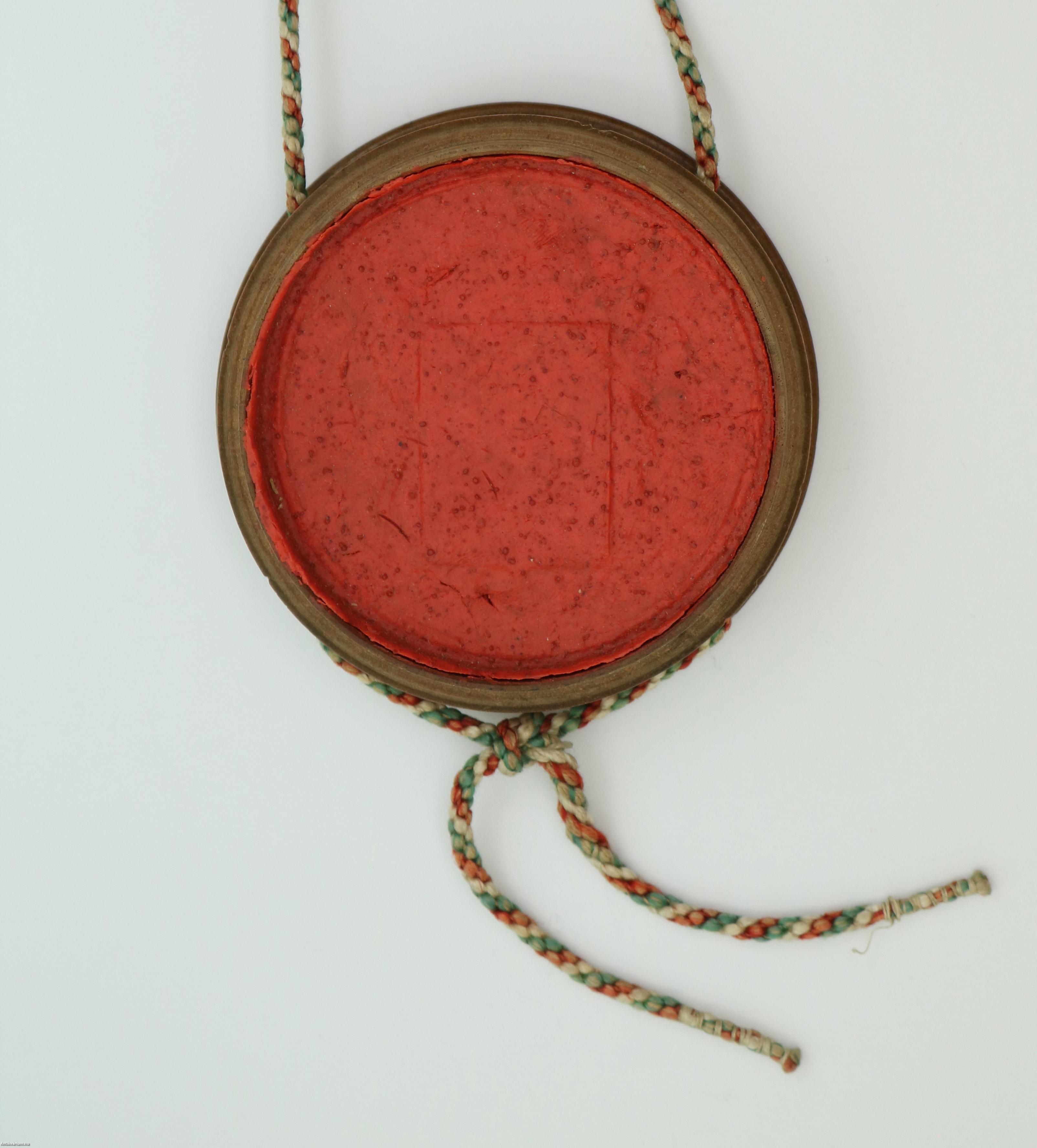 nemzetiszín zsinórral felfüggesztett, esztergált fatokban helyet kapó függőpecsét, melynek vörös pecsétviaszában egy mára erősen megkopott címer körvonalai látszanak. Az ábra a vonalvezetés helyenként felismerhető részletei nyomán nagy valószínűséggel a Budapesti Tudományegyetem pecsétje lehetett.