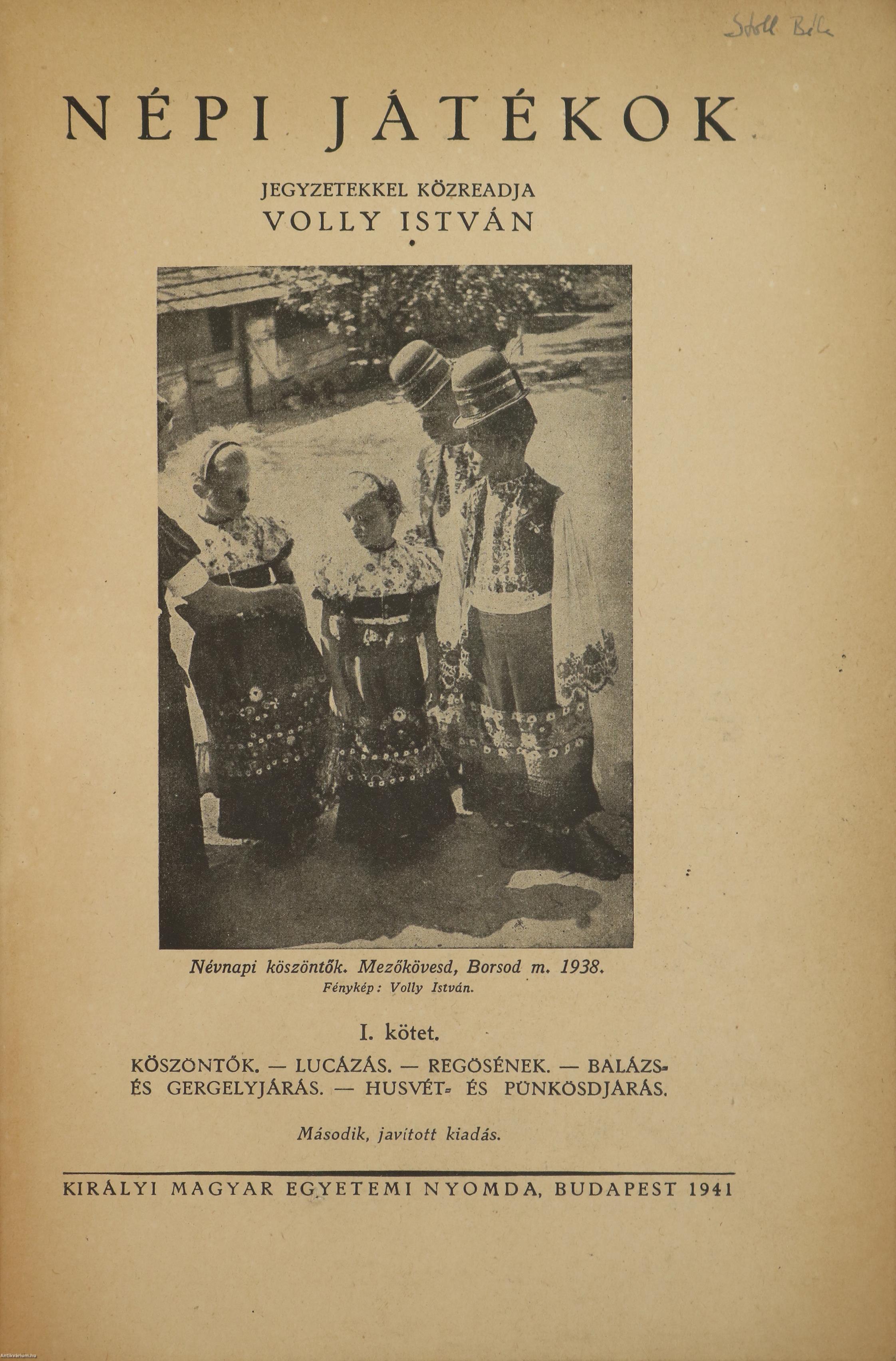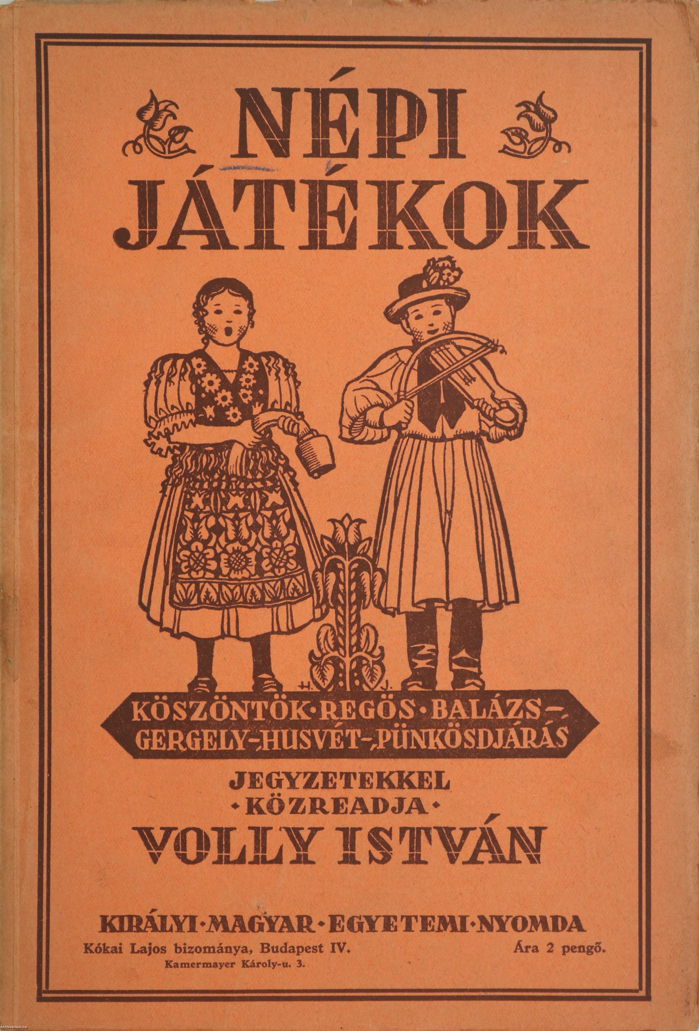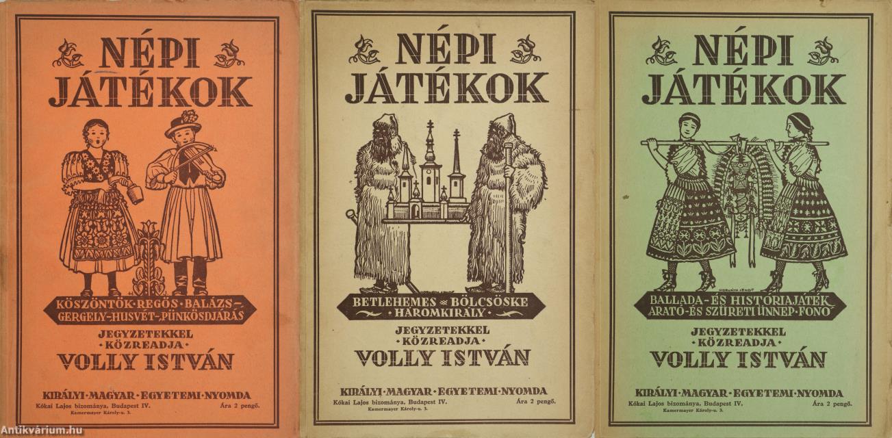 Nép játékok I-III. kötet (egységes külön kötetekben). Jegyzetekkel közreadja: Volly István. Második, javított kiadás. I. kötet. Köszöntők, Lucázás, Regősének, Balázs- és Gergelyjárás, Husvét- és Pünkösdjárás. 68 p. II. kötet. Betlehemes, Bölcsöske, Háromkirály. 88 p. III. kötet. Ballada- és Históriajátékok, Arató és Szüreti ünnep, Fonó. 72 p. Címlapon és a címlap hátoldalán fekete-fehér illusztrációval, címlapon tollal beírt tulajdonosi névbeírással, csillagozott lábjegyzetekkel, szöveg közti feliratozott, fekete-fehér illusztrációkkal, kottákkal és kötetenkénti tartalomjegyzékkel ellátott könyvek. A köteteket a Királyi Magyar Egyetemi Nyomda nyomtatta Budapesten. Kiadói fűzött papírkötésben lévő példányok színes, feliratozott, illusztrált címfedéllel, feliratozatlan könyvgerinccel, hátlapon, a hátlap belső oldalán és a védőlapon korabeli reklámokkal, néhány helyen ceruzával írt megjegyzéssel, tiszta belívekkel, hiánytalan állapotban.
