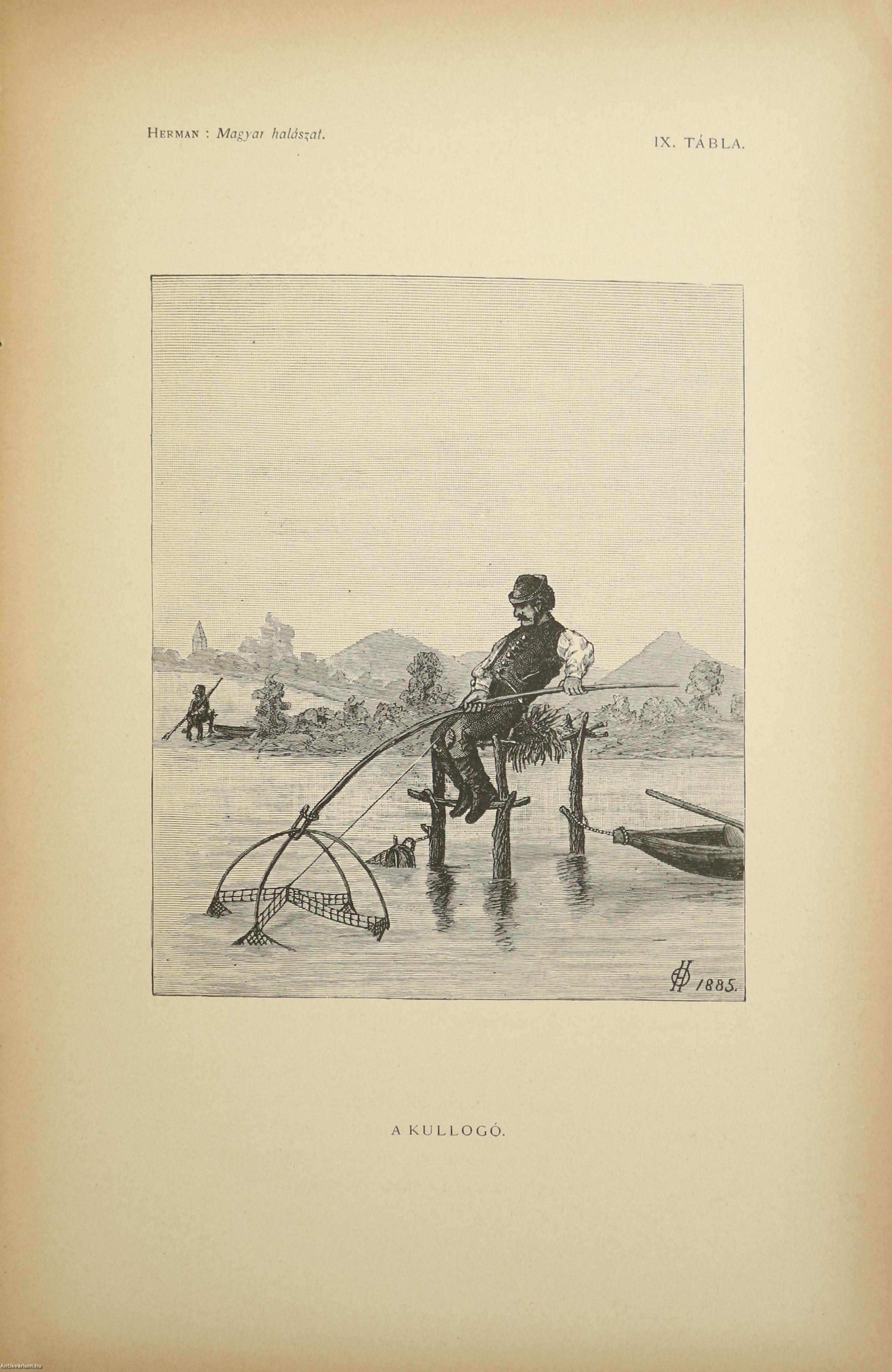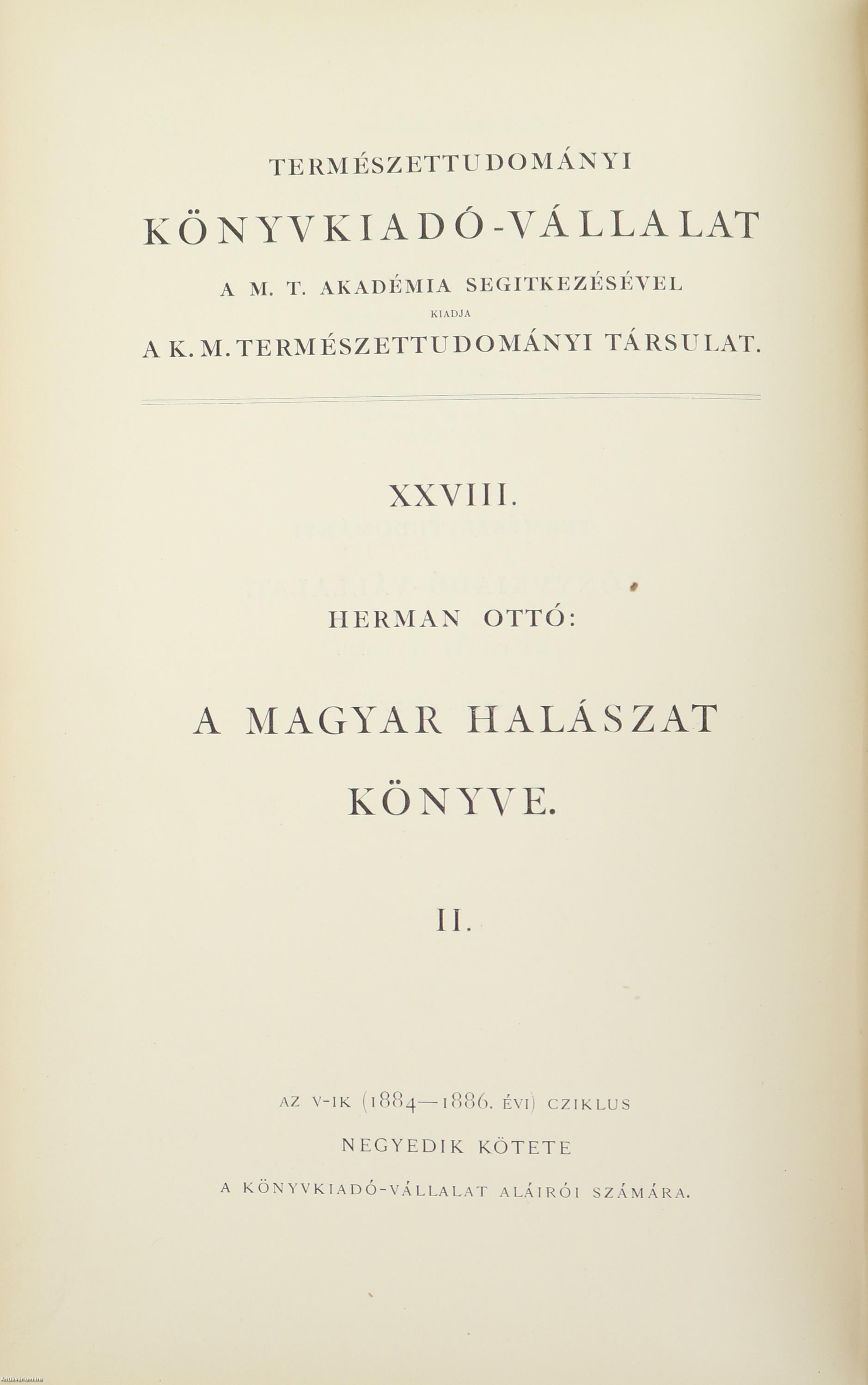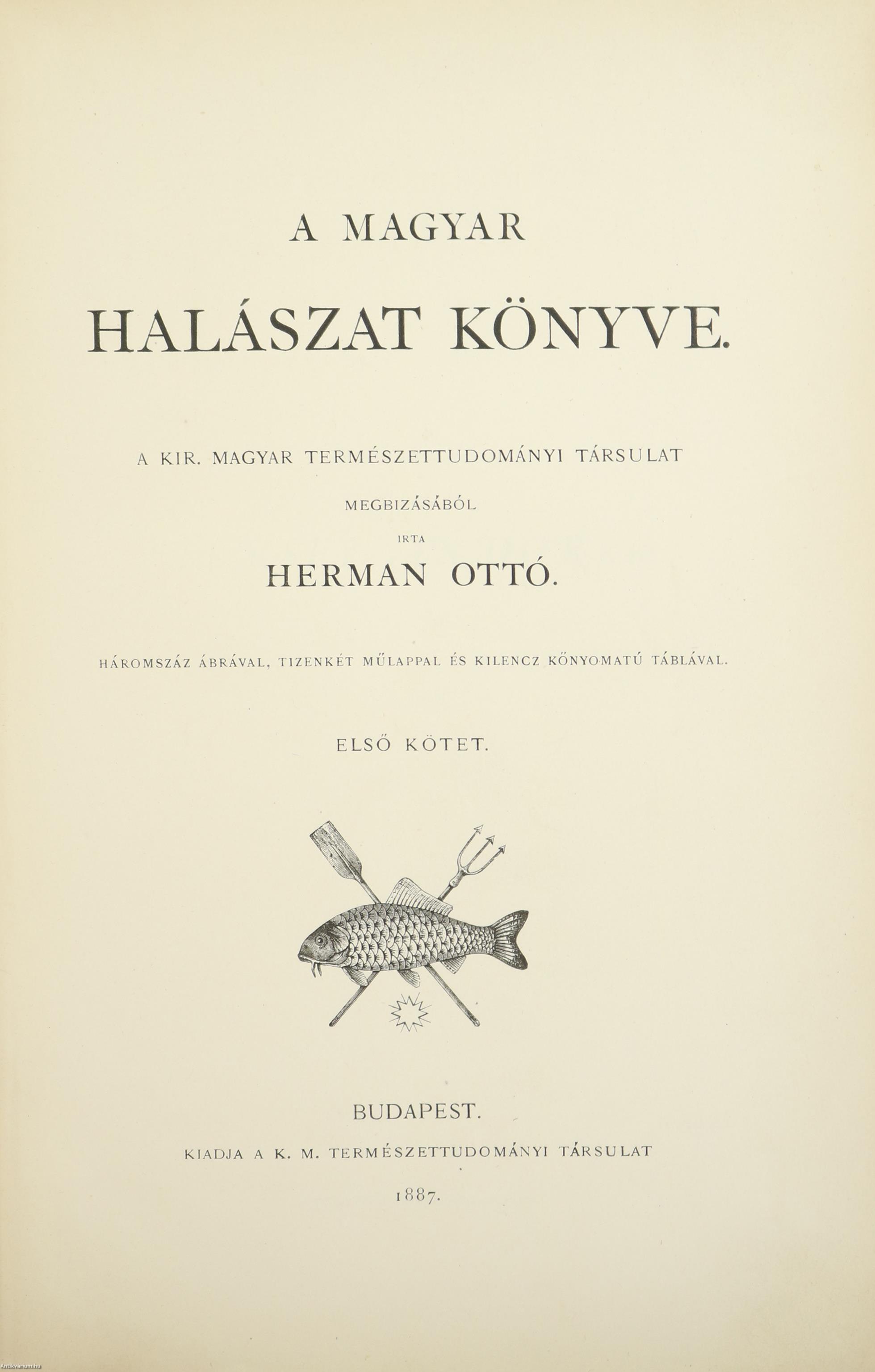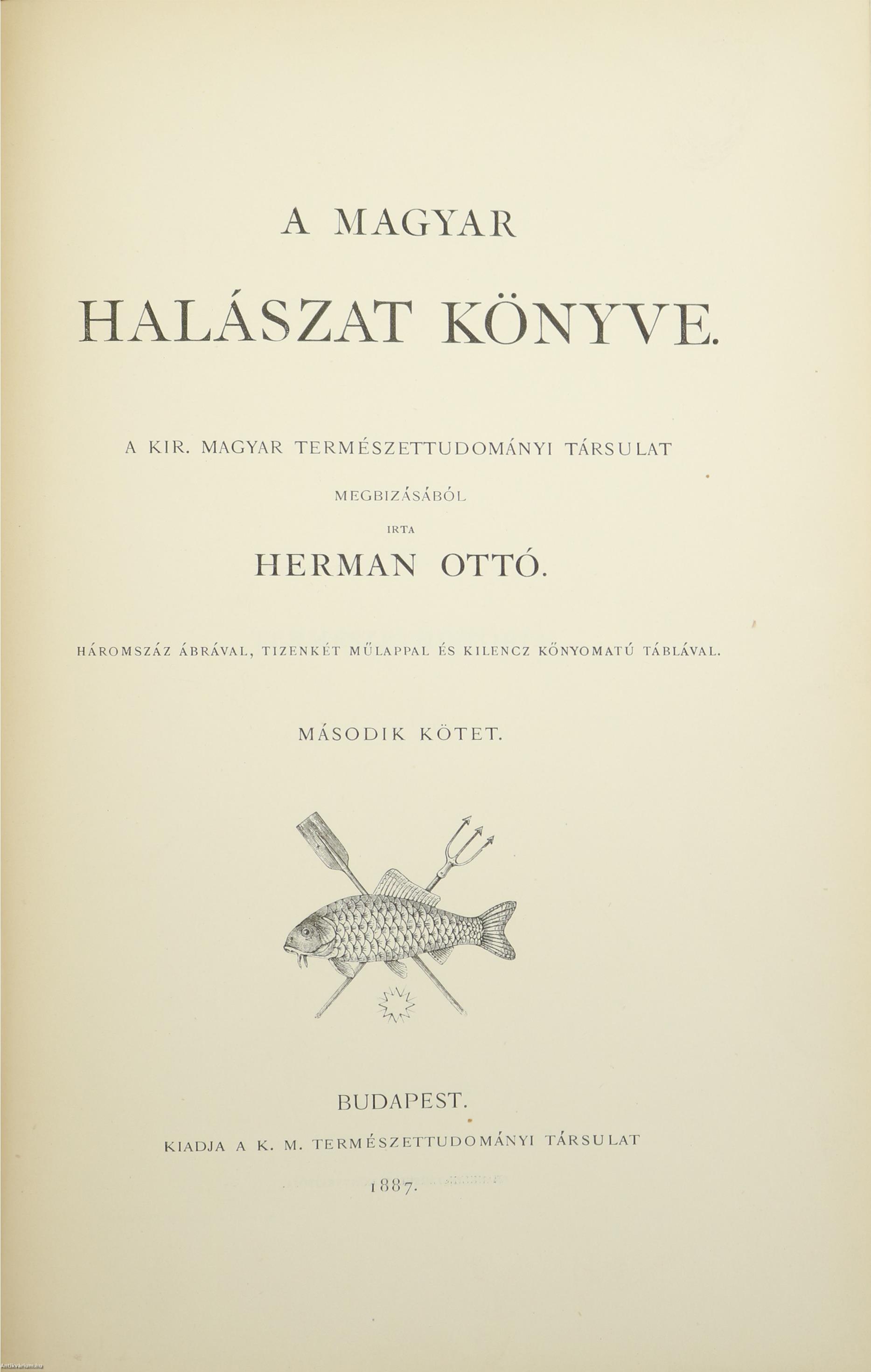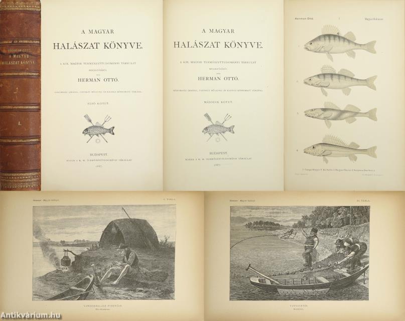 A Természettudományi Könyvkiadó-Vállalat könyvsorozatának XXVII. és XXVIII., a könyvkiadó-vállalat aláirói számára az V-ik (1884-1886. évi) cziklus harmadik és negyedik kötetei. Első kiadás. A magyar halászat könyve I-II. (Egységes külön kötetekben.) A Kir. Magyar Természettudományi Társulat megbízásából írta: Herman Ottó. Összesen háromszáz szöveg közti, fekete-fehér, feliratozott ábrával, továbbá az első kötetben 12 fekete-fehér, számozott műlappal, a második kötetben 9 számozott, kőnyomatú táblával illusztrált, a magyar népies halászat mesterszótárával, a Természettudományi Társulat kiadványainak listájával, betűrendes tárgymutatóval, valamint irodalom- és tartalomjegyzékkel kiegészített kiadás. A köteteket a Franklin-Társulat Könyvsajtója nyomtatta, Budapesten. Korabeli félbőr kötésben lévő példány feliratozatlan, mintás címfedéllel és hátlappal, aranyozott feliratozású, sérült könyvgerinccel, mintázott előzéklapokkal, mintázott lapélekkel, hiánytalan állapotban. A kötet szerzője, Herman Ottó (Breznóbánya, 1835. június 26. – Budapest, 1914. december 27.) természetkutató, zoológus, néprajzkutató, régész, politikus. Sokoldalú tudományos tevékenysége nyomán az utolsó magyar polihisztornak és a madarak atyjának is nevezték, ezernél is több tudományos publikáció fűződik a nevéhez. A magyar őskőkorszak-kutatás és a hazai tudományos barlangkutatás egyik elindítója volt. Termékeny természetrajzi írói munkássága mellett mint tudományszervező is jeleskedett. A Természettudományi Füzetek és az Aquila c. madártani folyóirat szerkesztője, a Magyar Ornitológiai Központ alapító-igazgatója, a Magyar Néprajzi Társaság alapítótagja és elnöke, a tudományos ismeretterjesztés műfajának egyik magyarországi megteremtője.