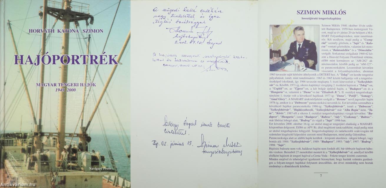 Horváth József, Katona Miklós és Szimon Miklós által dedikált példány. Hajóportrék. Magyar tengeri hajók 1945-2000. Írta: Horváth József, Katona Miklós és Szimon Miklós.