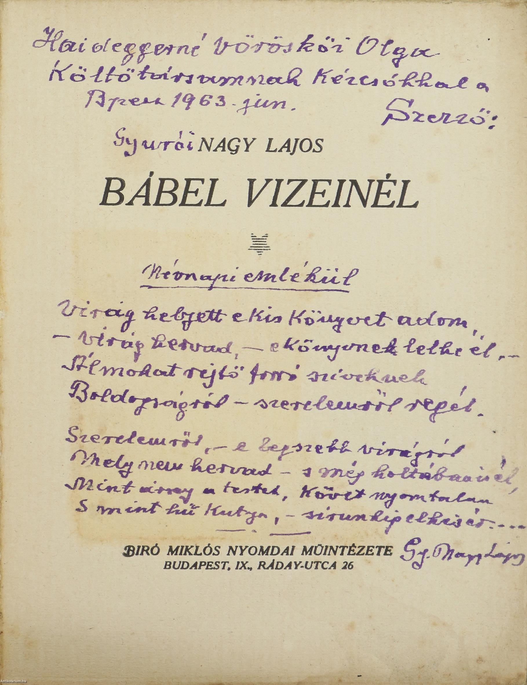 A fedlap hátoldalára ragasztva, címlapképként a szerző tollal aláírt, beragasztott, fekete-fehér fotójával, kötetvégi részletes tartalomjegyzékkel és a szerző eddig megjelent műveinek jegyzékével ellátott könyv. A címlapon a szerző, Nagy Lajos tollal beírt, névre szóló dedikációja: "Haideggerné Vöröskői Olga költőtársamnak kézcsókkal a Szerző" és a szerző "Névnapi emlékül" című versének a szerző által tollal beírt, aláírt szövege olvasható: