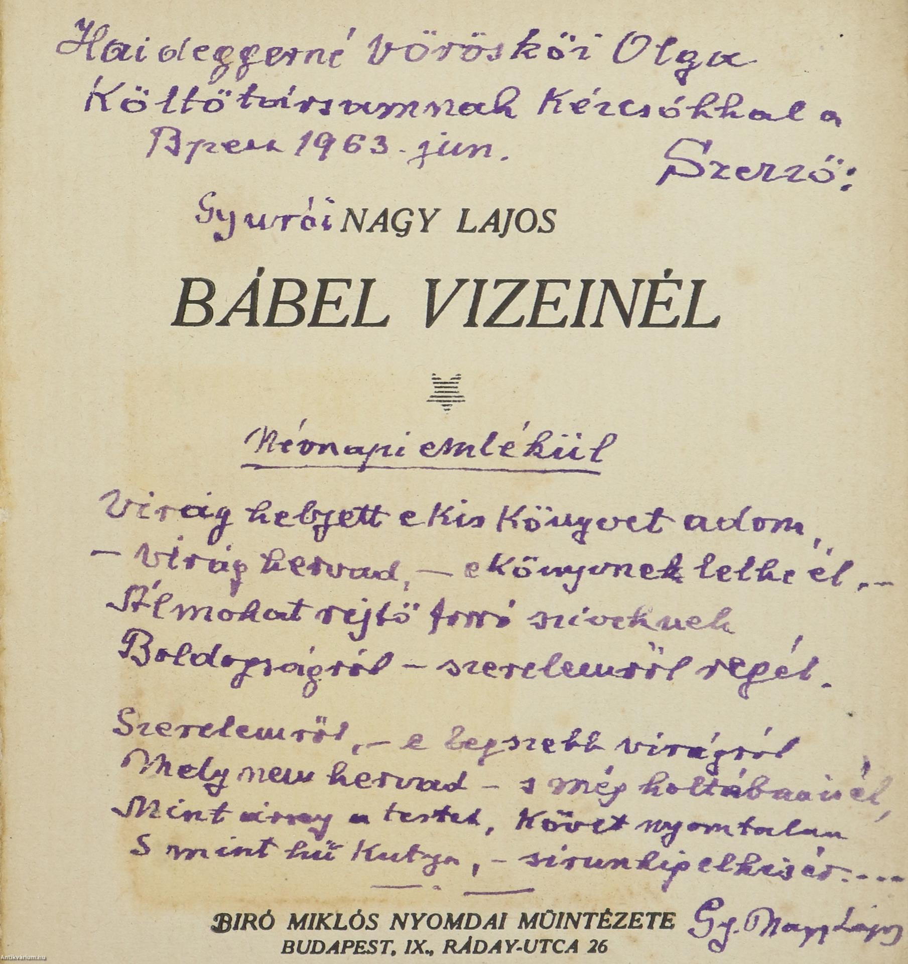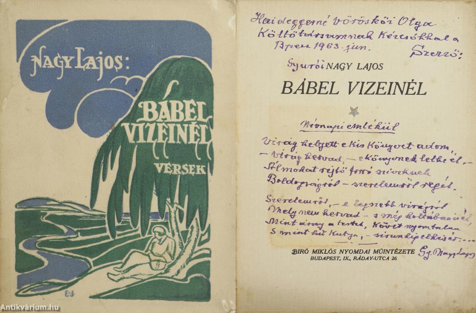 Szerző által dedikált példány. Első kiadás. Bábel vizeinél. Versek. Írta: Nagy Lajos. Borítóterv: "EJ".