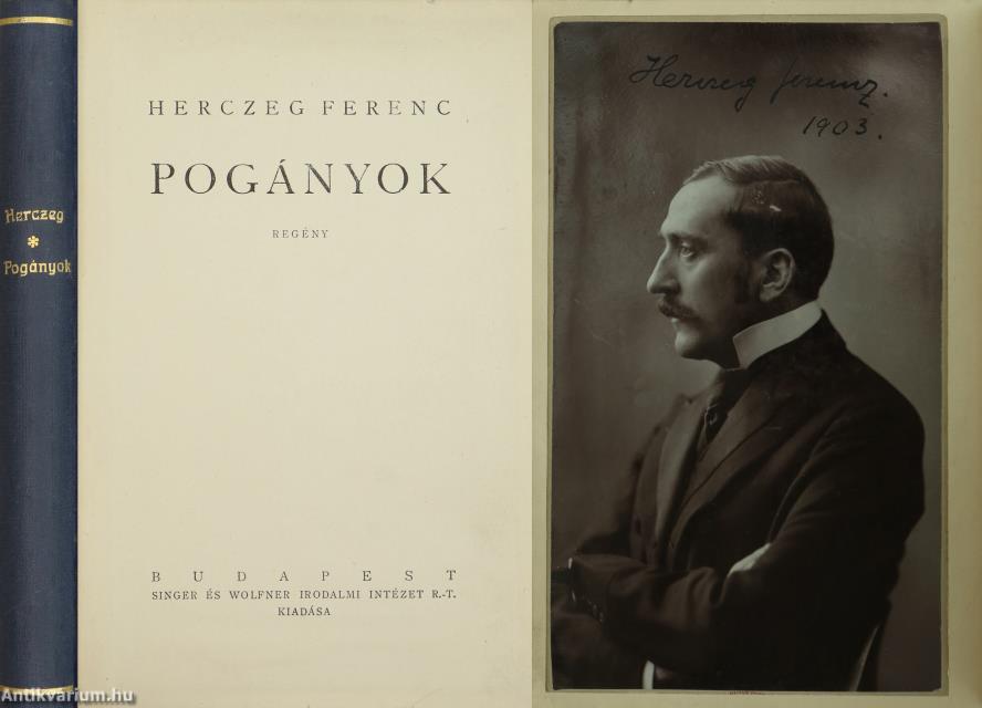 Szerző által aláírt, a kötetbe beragasztott korabeli fekete-fehér fotográfiával ellátott példány. A Herczeg Ferenc Regényei című sorozatban (számjelzés nélkül) megjelent mű. Pogányok. Regény. Írta: Herczeg Ferenc.
