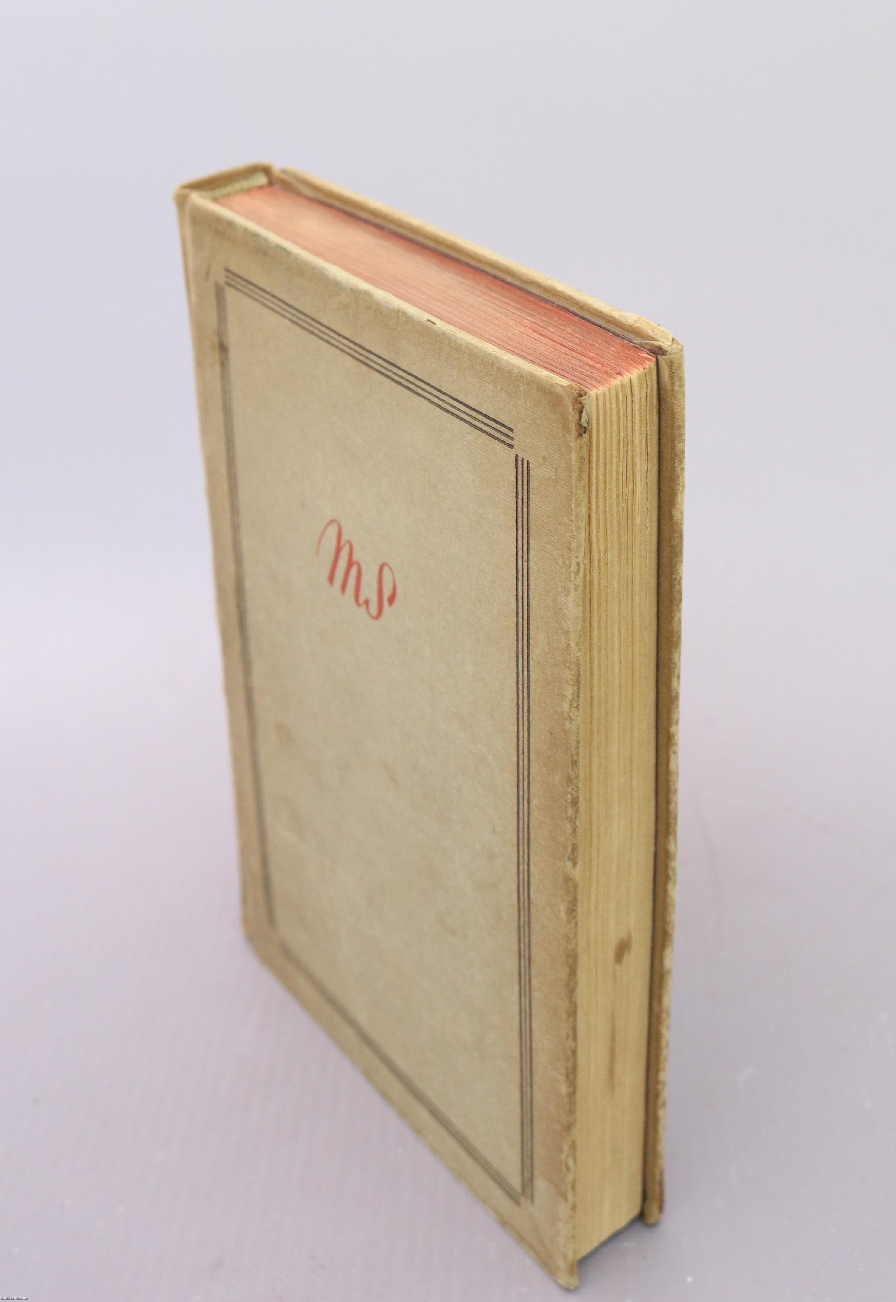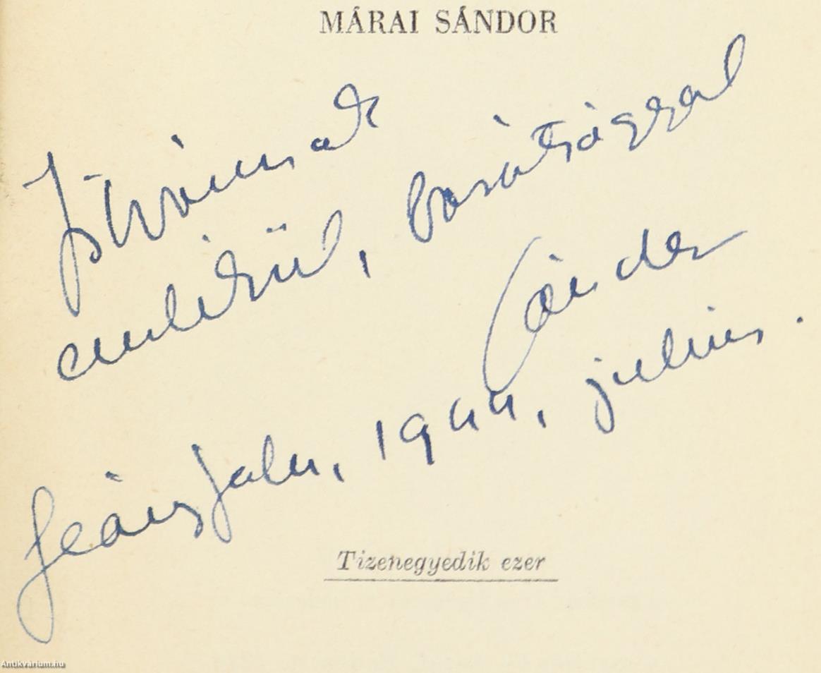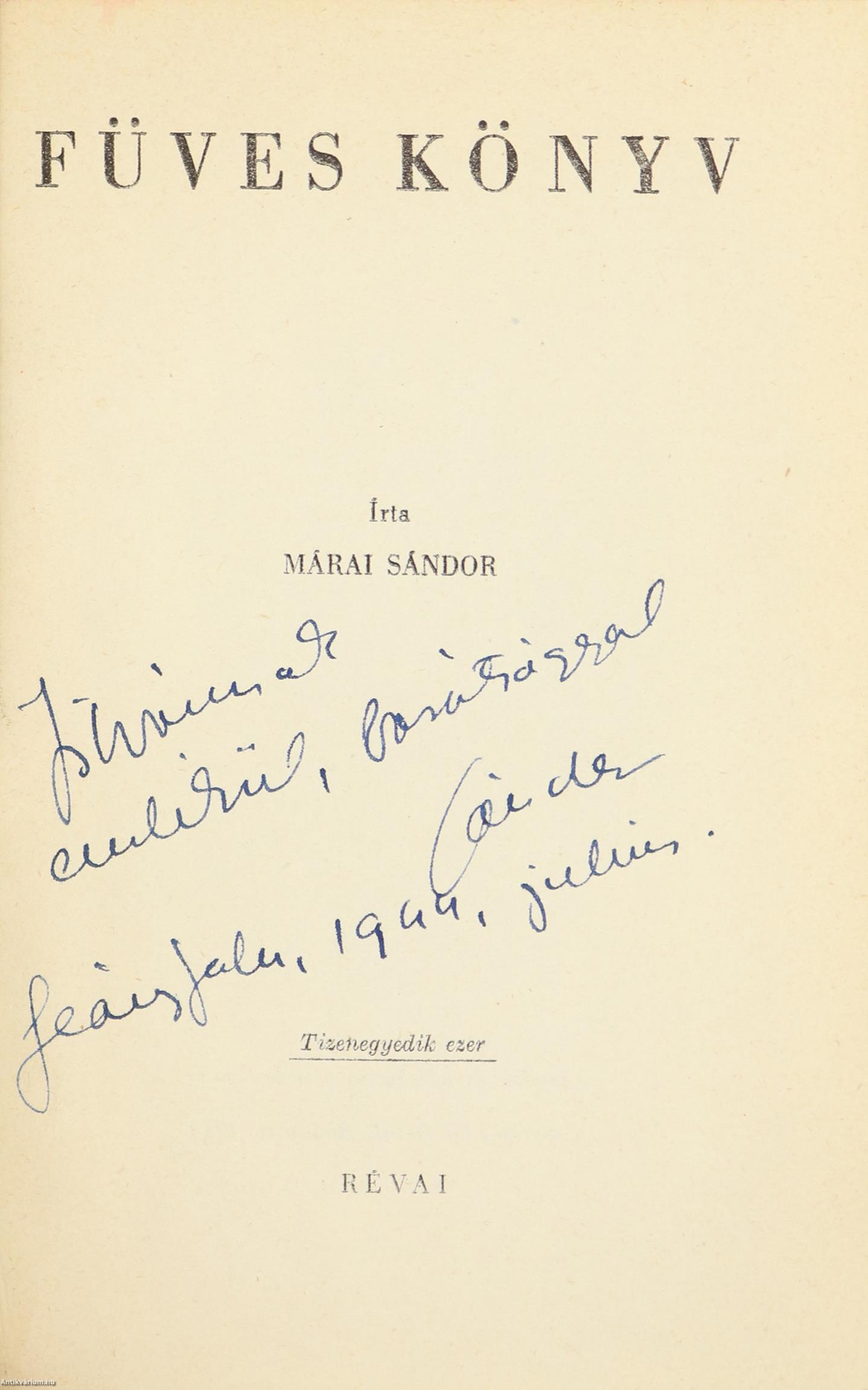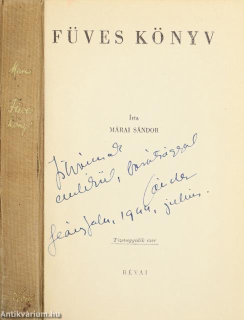 Szerző által dedikált példány. Első kiadás.Márai Sándor munkái(számjelzés nélkül). Füves könyv. Írta: Márai Sándor. A címlapon a szerző, Márai Sándor névre szóló, dátummal ellátott dedikációja olvasható: "J-nak emlékül, barátsággal. Sándor. Leányfalu, 1944. julius." Szerzői ajánlással, a záróoldalon a Révai Irodalmi Intézet egész oldalas korabeli reklámjával kiegészített kiadás. A hátsó előzéklapon régi tulajdonosi bélyegzés található. A könyvet a Révai Nyomda nyomtatta Budapesten. Kiadói félvászon kötésben lévő példány a szerző monogramjával ellátott, keretezett címfedéllel, aranyozott feliratozású könyvgerinccel, kiadói előzéklapokkal, színezett felső lapélekkel, hiánytalan állapotban.