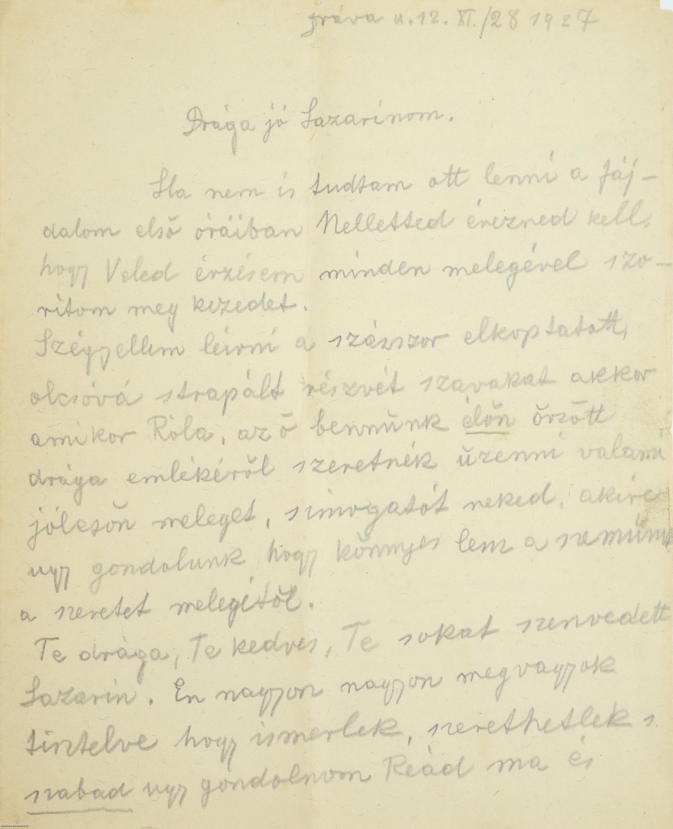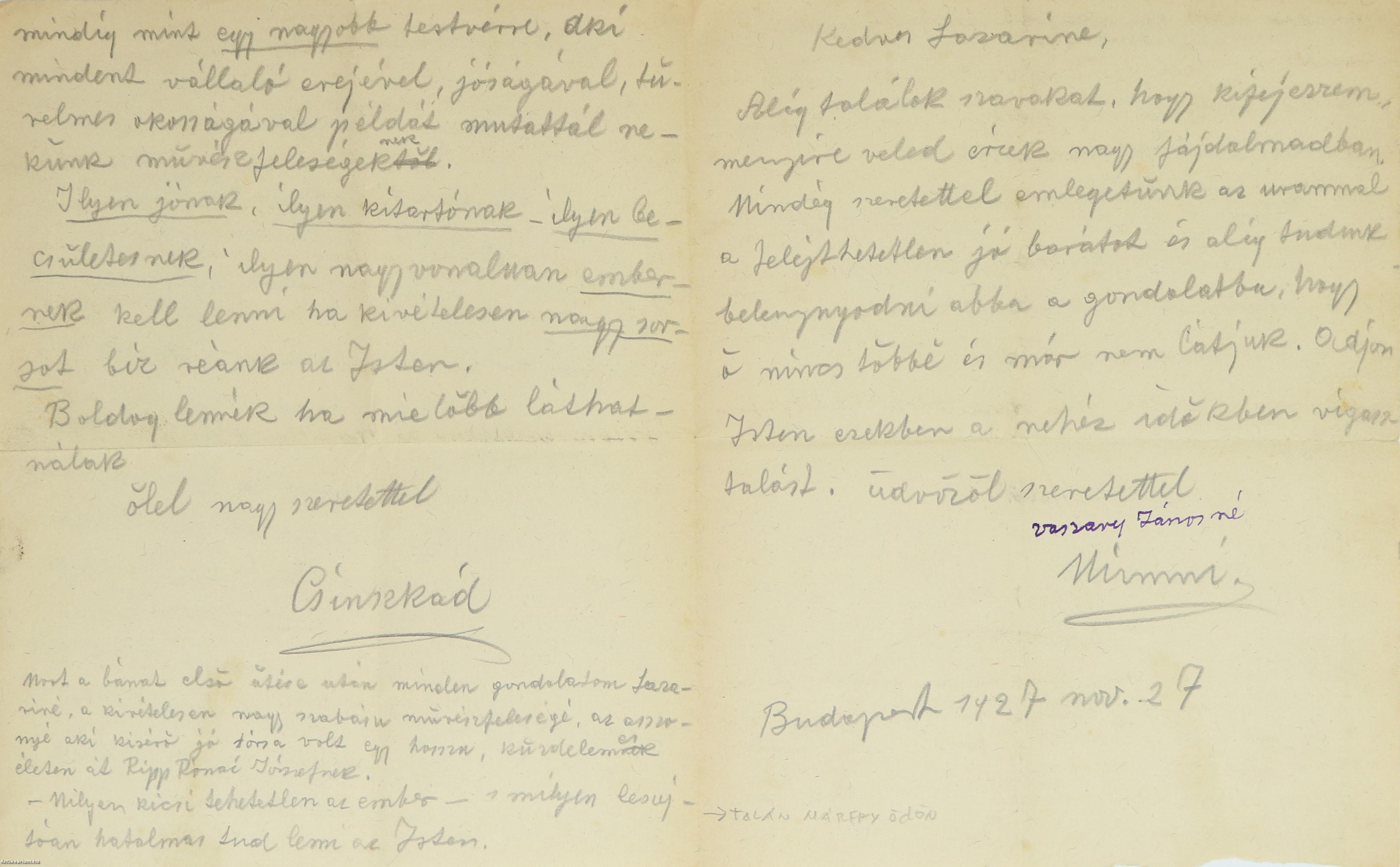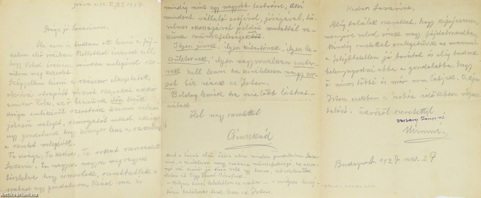 Te drága, Te kedves, Te sokat szenvedett Lazarin. En nagyon nagyon meg vagyok tisztelve hogy ismerlek, szerethetlek s szabad ugy gondolnom Reád ma és mindíg mint egy nagyobb testvérre, aki mindent vállaló erejével, jóságával, türelmes okosságával példát mutattál nekünk művészfeleségeknek.
