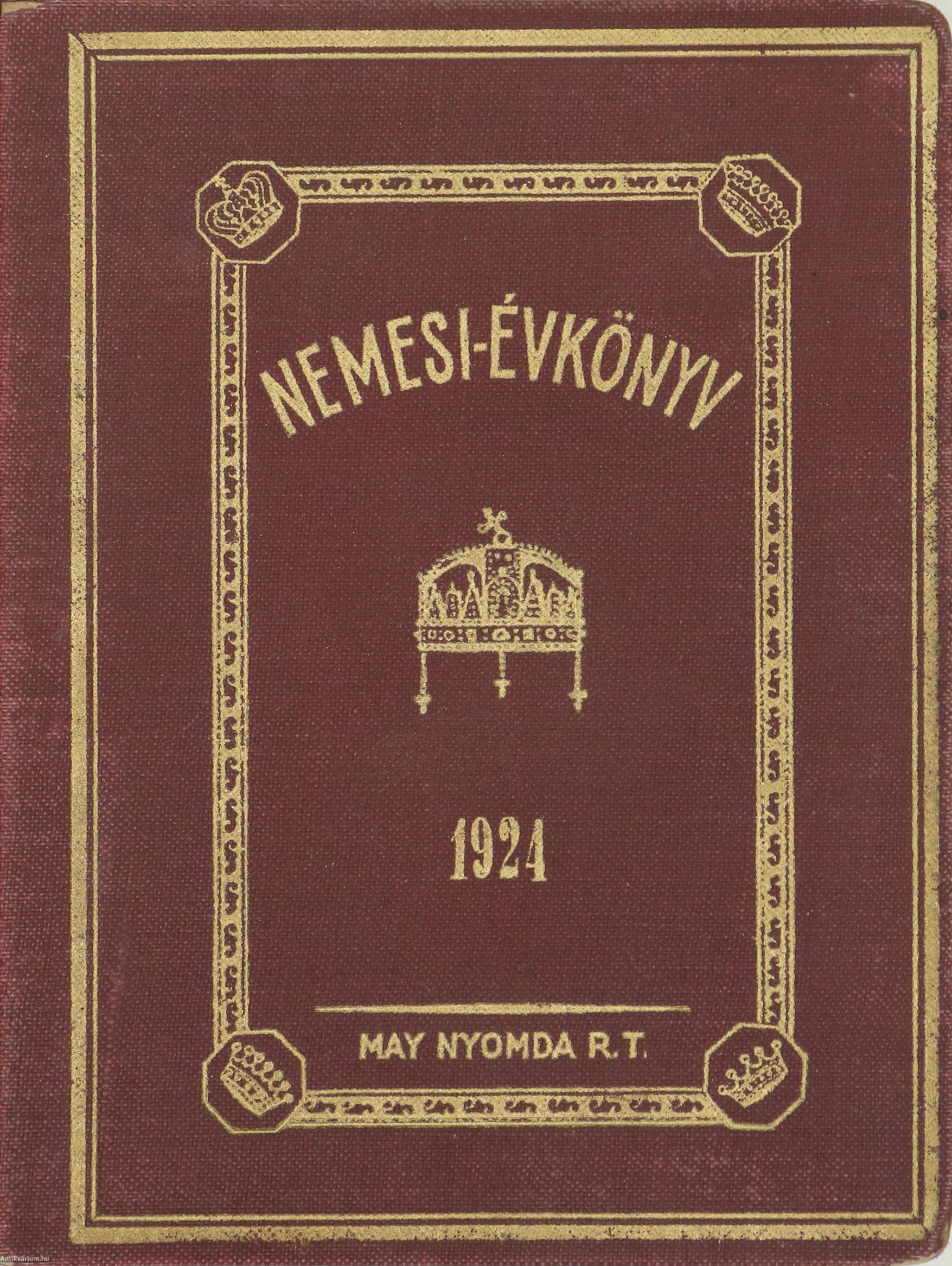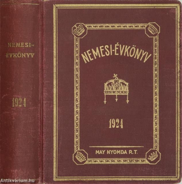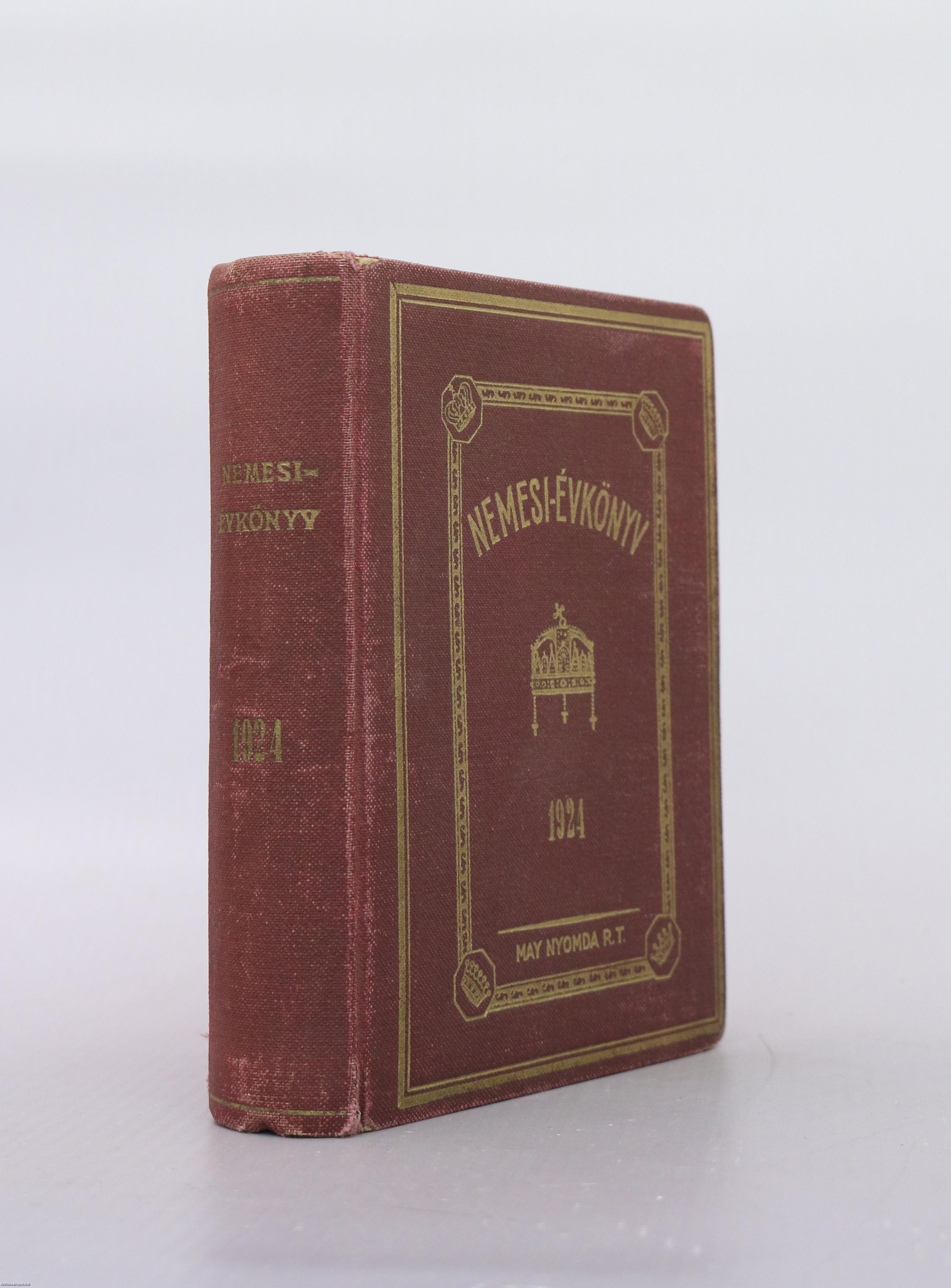 Első kiadás. Nemesi Évkönyv 1924. II. évfolyam. Szerkeszti: Királydaróczi Daróczy Zoltán, a Magyar Heraldikai és Geneologiai Társulat igazgató-választmányi tagja. Tájékoztatóval, Dr. Bárány Gerő s. k. helyettes államtitkárnak, az elnöki osztály főnökének rendeleti útmutatásával, szabályzattal, a családi levéltárak jegyzékével, főrangu és nemes családok betűrendes, geneológiai táblákkal ellátott betűrendes jegyzékével és betűrendes, kéthasábos, részletes névmutatóval ellátott könyv. A könyvet a May János Nyomdai Müintézet R. T. nyomtatta Budapesten. Kiadói egészvászon kötésben lévő példány aranyozott feliratozású, évszámmal, a magyar koronával, dupla keretezéssel díszített címfedéllel, aranyozott feliratozású, évszámmal ellátott könyvgerinccel, kiadói előzéklapokkal, tiszta belívekkel, hiánytalan állapotban.