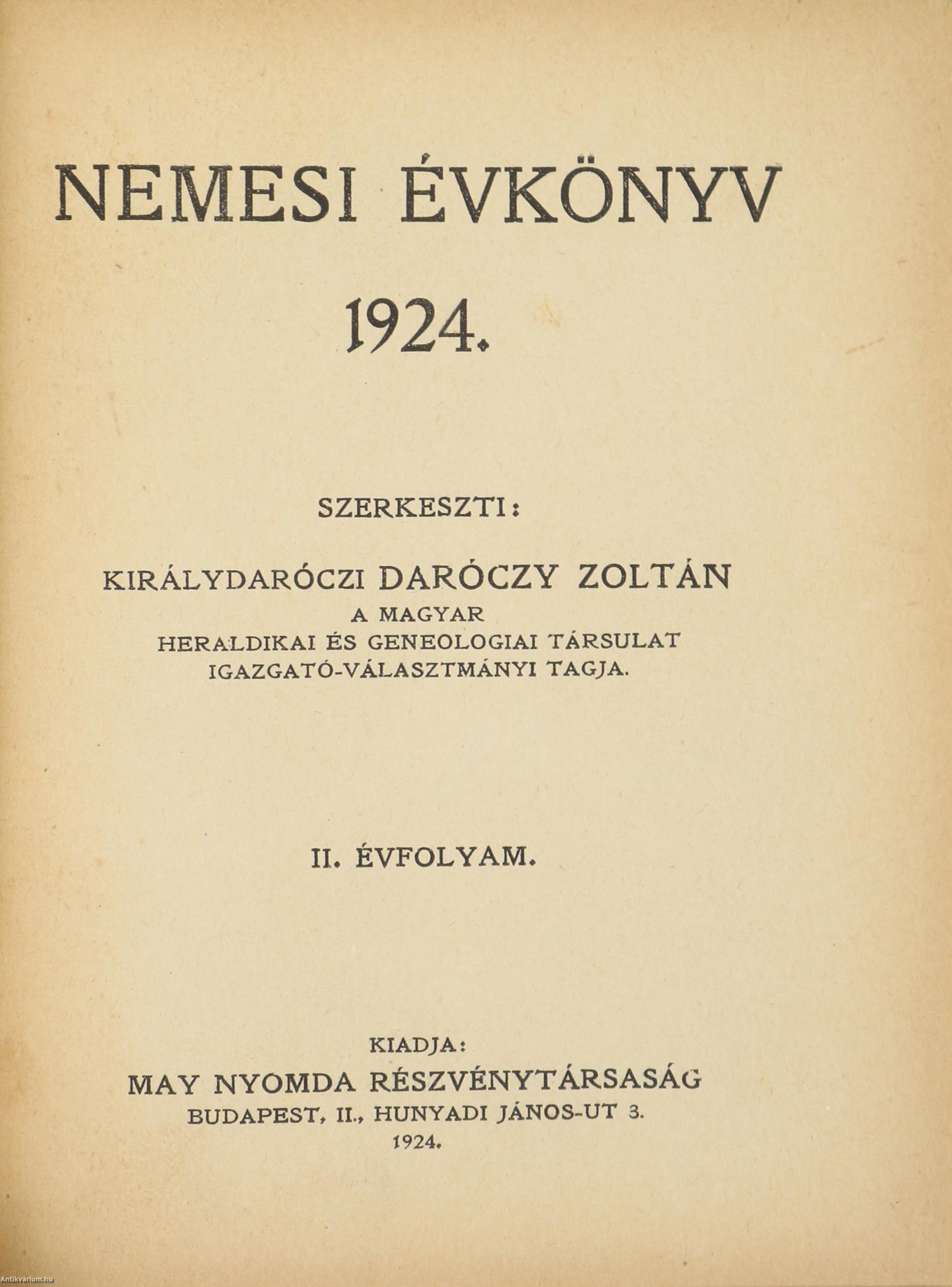 Királydaróczi Daróczy Zoltán: Nemesi évkönyv 1924. II. évfolyam.