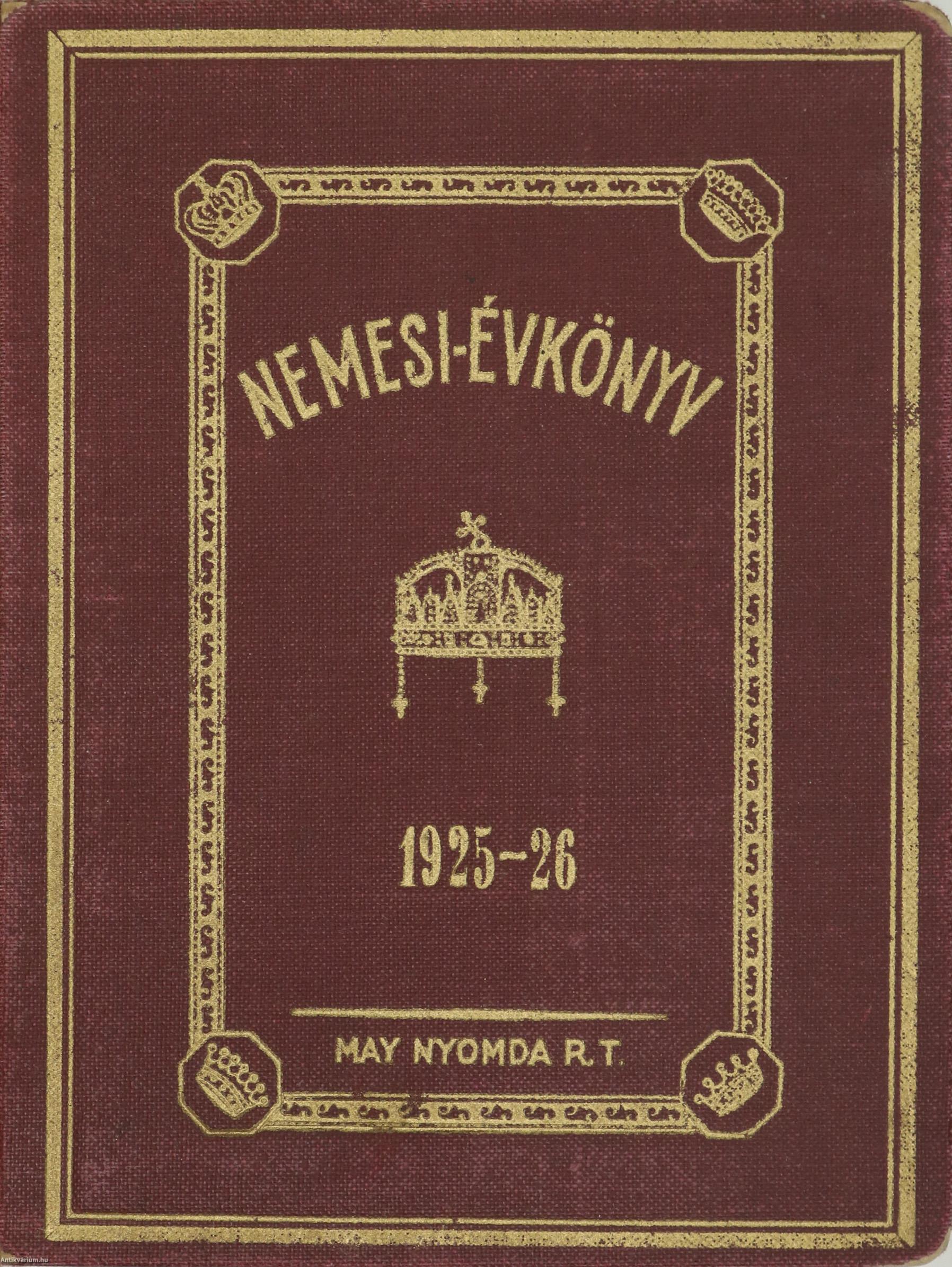 Első kiadás. Nemesi Évkönyv 1925-26. III-IV. évfolyam (két évfolyam egy kötetben). Szerkeszti: Királydaróczi Daróczy Zoltán a Magyar Heraldikai és Geneologiai Társulat igazgató-választmányi tagja. Tájékoztatóval, Dr. Rakovszky Iván s. k. m. kir. belügyminiszter rendeleti útmutatásával, szabályzattal, a családi levéltárak jegyzékével, főrangu és nemes családok betűrendes, geneológiai táblákkal ellátott betűrendes jegyzékével, betűrendes, kéthasábos, részletes névmutatóval, a sajtóhibák és helyreigazitások közreadásával, valamint kötetvégi korabeli hirdetésgyűjteménnyel ellátott könyv. A könyvet a May János Nyomdai Müintézet R.-T. nyomtatta Budapesten. Kiadói egészvászon kötésben lévő példány aranyozott feliratozású, évszámmal, a magyar koronával, dupla keretezéssel díszített címfedéllel, aranyozott feliratozású, évszámmal ellátott könyvgerinccel, kiadói előzéklapokkal, tiszta belívekkel, hiánytalan állapotban.