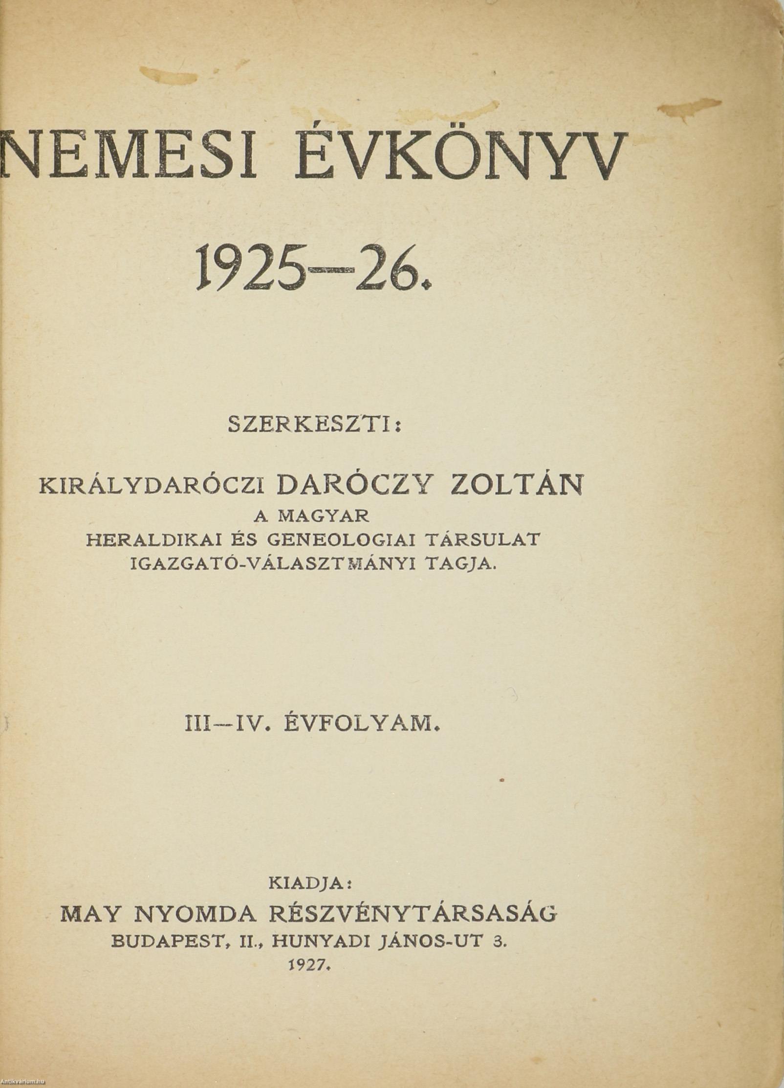 Királydaróczi Daróczy Zoltán: Nemesi Évkönyv 1925-26. III-IV. évfolyam