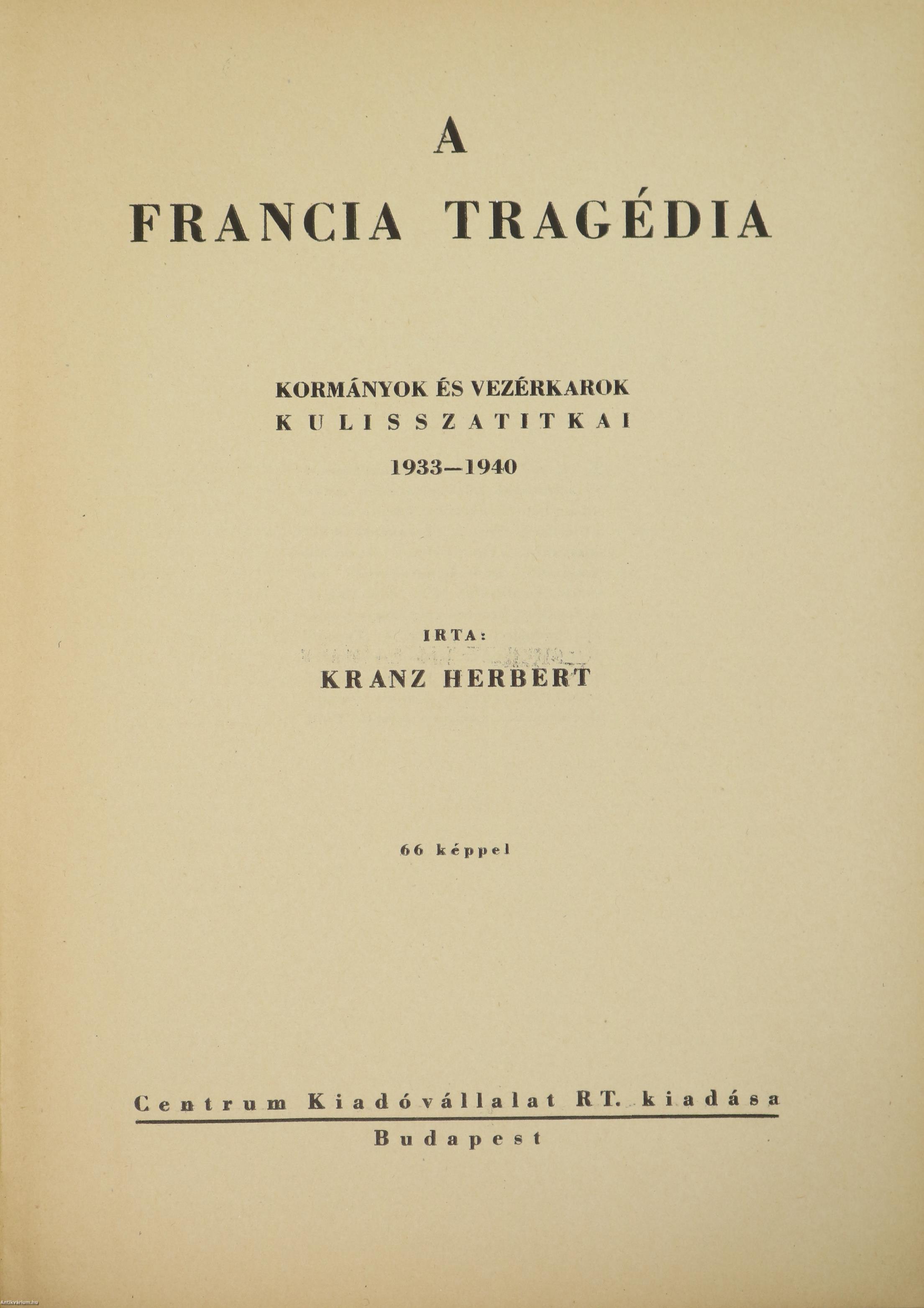 Első kiadás. A francia tragédia. Kormányok és vezérkarok kulisszatitkai. 1933-1940. Írta: Kranz Herbert.