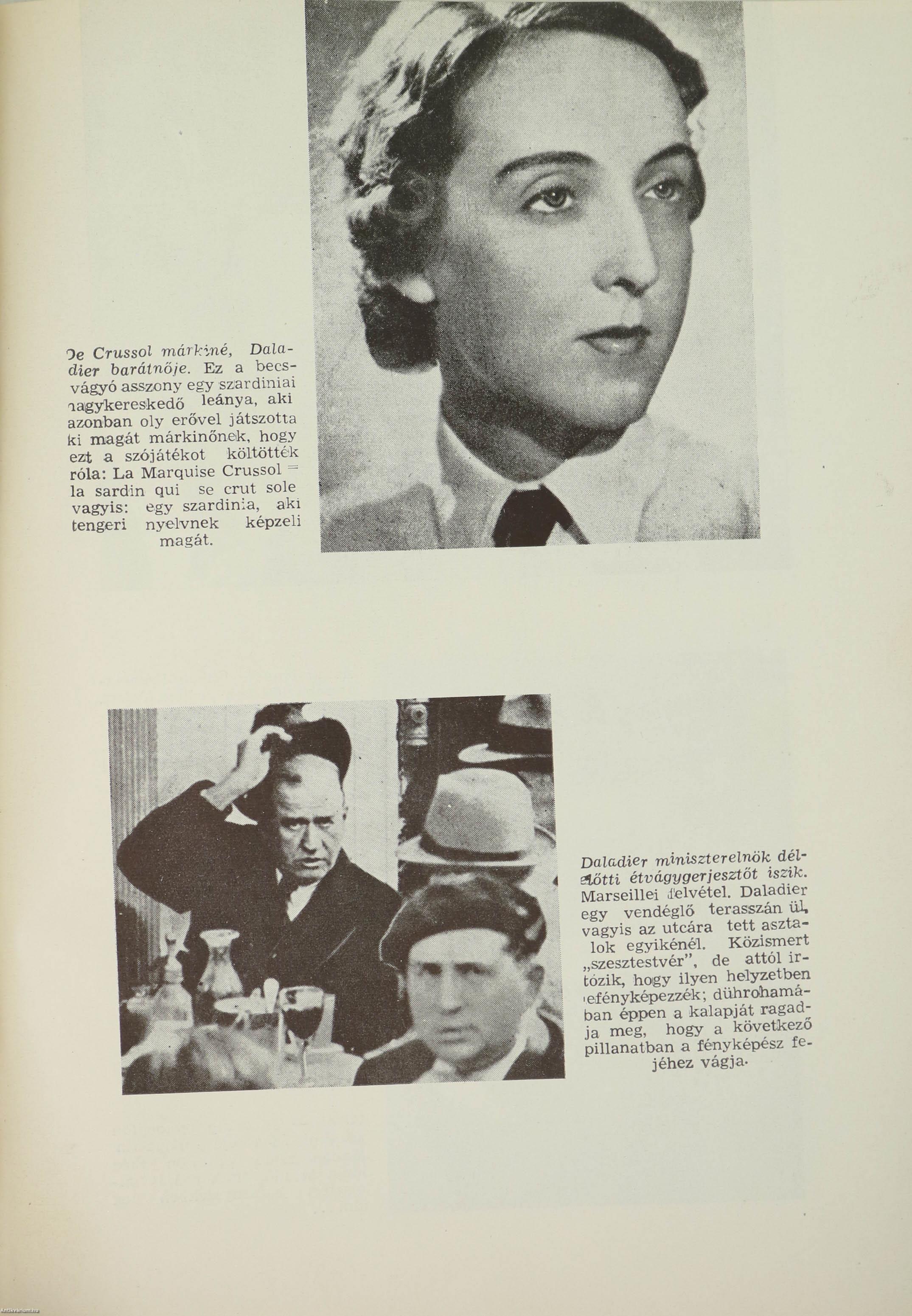 Ennek a világraszóló bukásnak a külső lefolyását mindnyájan ismerjük, hiszen kortársai vagyunk az eseményeknek. De ami a nagy világszinpadon a kulisszák mögött történt: a diplomácia csalárd játékát, a megszámlálhatatlan személyi intrikát, a "barátnők2 befolyását, - akik fékezhetetlen becsvágyukban szinte orruknál fogva vezették hatalmas barátjaikat, - a politikai és katonai vezetők alkalmatlanságát, a felszerelési iparban történt visszaéléseket, a pártok korrupt életét és mindezek felett a világcsaló, modern gangsternek, Staviskynek a francia politikai életre gyakorolt politikai befolyását, - ezt a rengeteg kulisszák mögötti pikantériát bizony alig ismeri valaki.