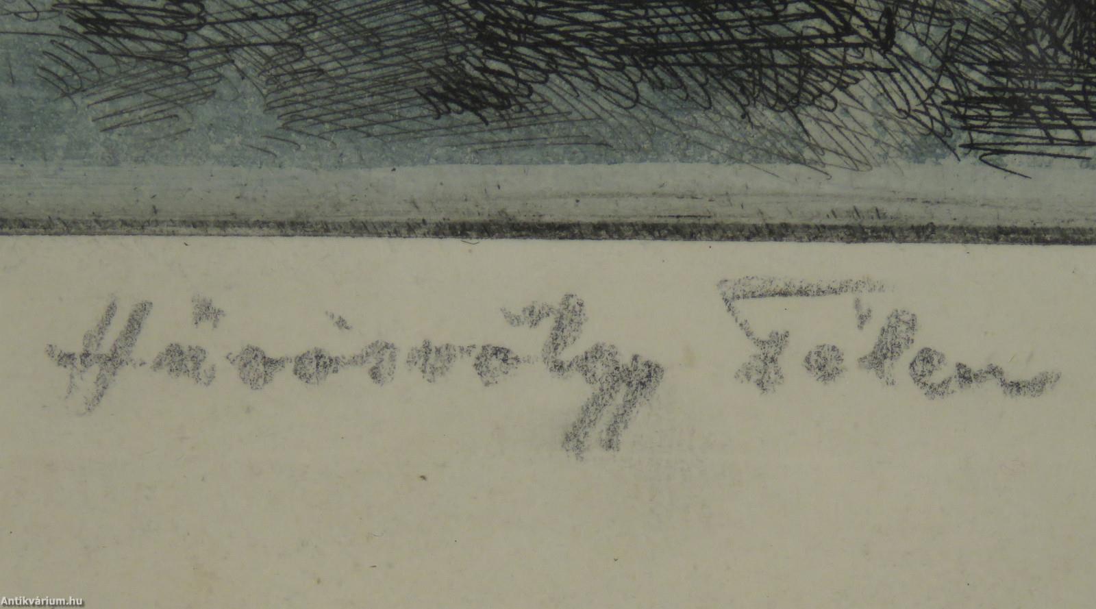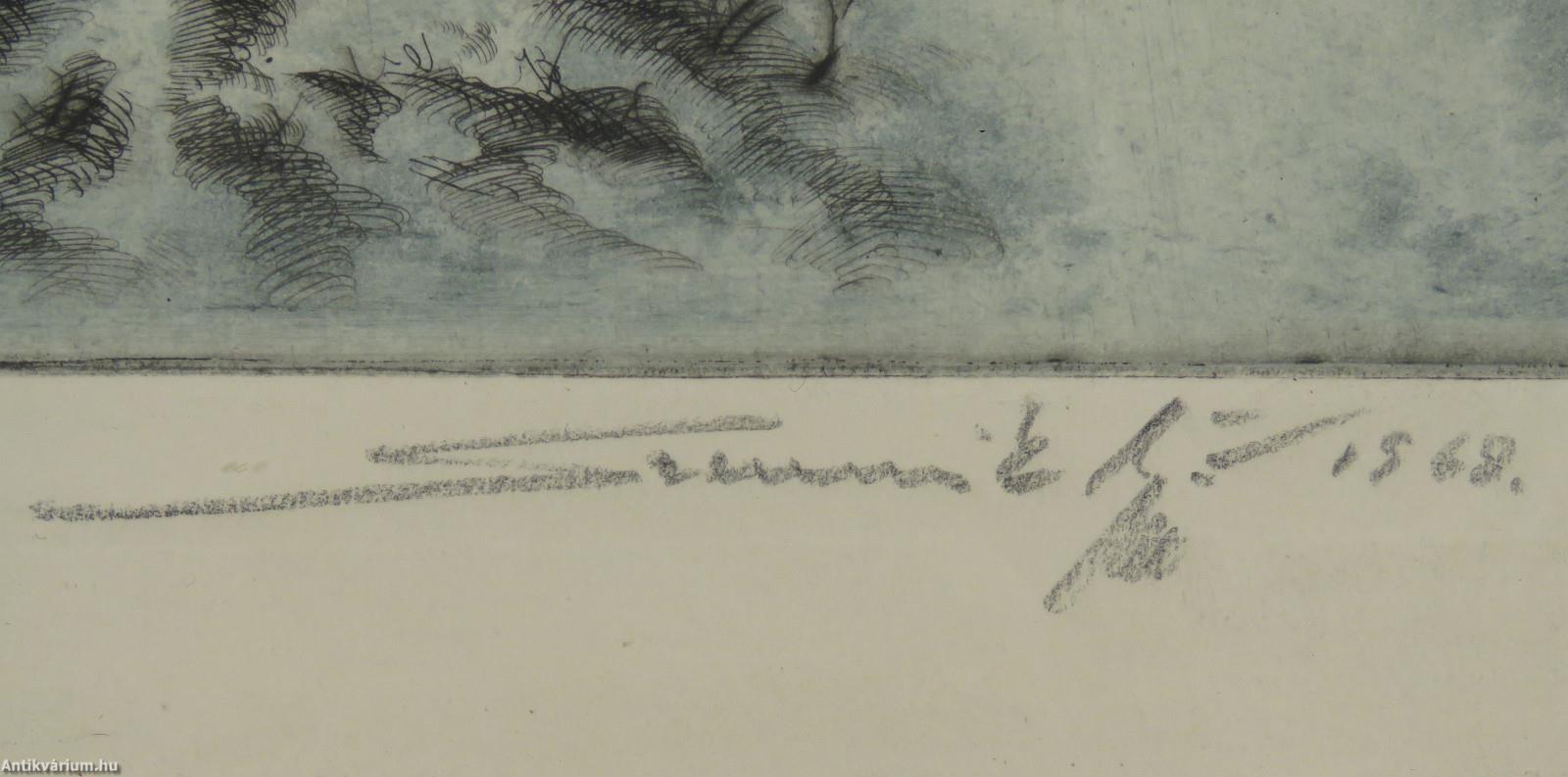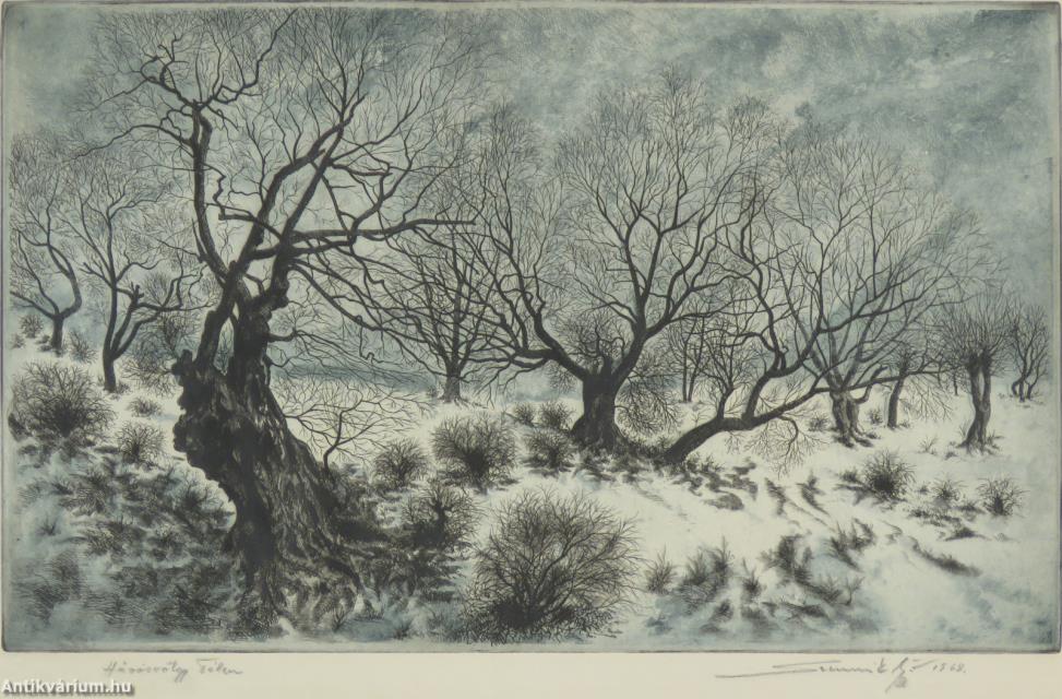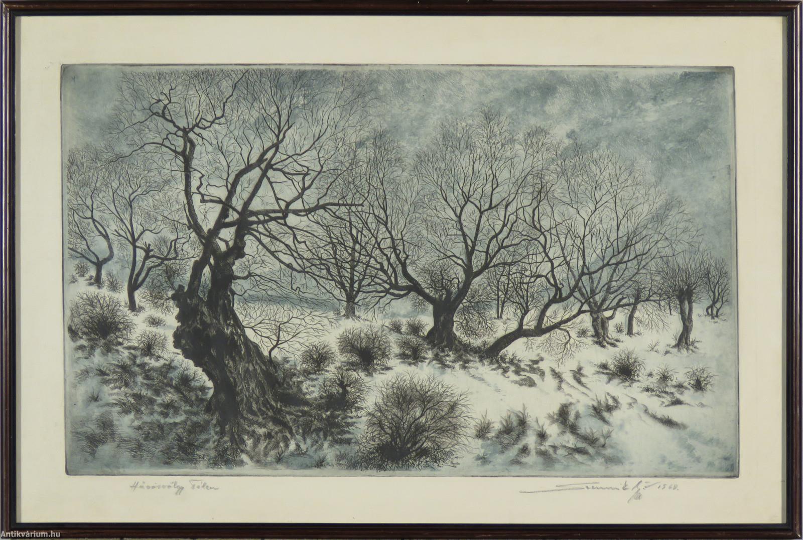 Jelzés balra lent: Hűvösvölgy Télen (ceruzával), jobbra lent: Szennik György 1968. (ceruzával), színes rézkarc, papír.