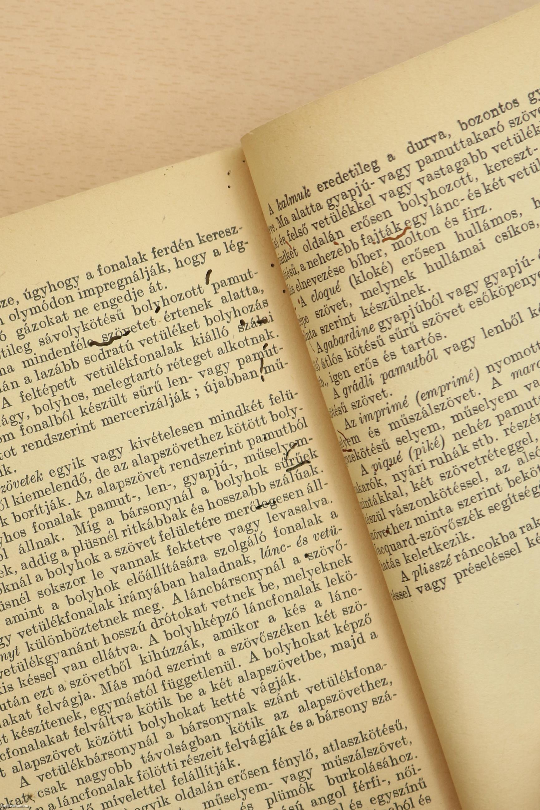 | 6. A szövetek csinosítása (appretúrája) a pamut-, len-, gyapjú- és selyemszöveteknél | 111 |