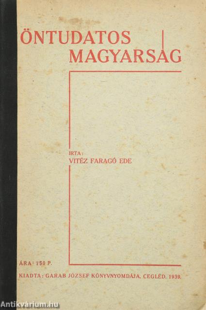 Öntudatos magyarság. Írta: vitéz Faragó Ede. Második kiadás. A felhasznált könyvek jegyzékével és tartalomjegyzékkel kiegészített kötet. A címlapon tollal írt tulajdonosi bejegyzés látható. Nyomtatta Garab József Könyvnyomdája Cegléden. Kiadó varrott papírkötésben lévő példány feliratozott címfedéllel, feliratozatlan, könyvkötő által pótolt könyvgerinccel, feliratozatlan hátlappal, hiánytalan állapotban. A kötet szerzője, Faragó Ede (Felsőkocskóc, 1895. október 15. – Jászkisér, 1973.) vármegyei népművelési vezető, cserkészvezető. 1916-ban szerzett tanítói oklevelet. Az első világháborúban a 14. honvéd gyalogezrednél volt önkéntes. 1915-ben zászlóssá, 1916-ban hadnaggyá, majd 1918-ban főhadnaggyá nevezték ki. A háborút követően vármegyei népművelési titkár lett, később pedig előléptették századossá. Budapesten a cserkészszövetség vezető tisztje volt. 1939-től a MÉP tagjai közé tartozott, majd rövid ideig az Országos Nemzetvédelmi Bizottság miniszteri biztosaként tevékenykedett.