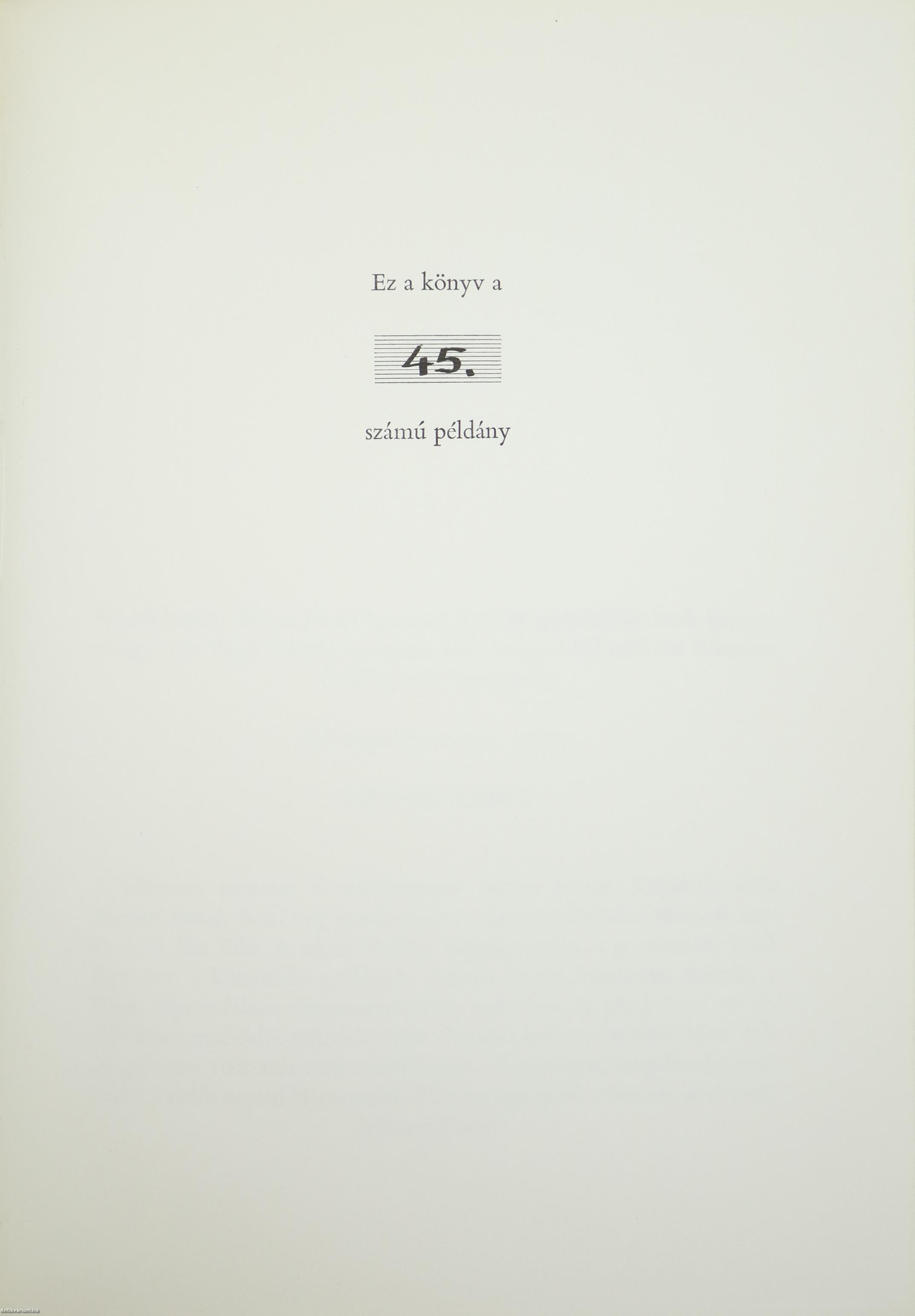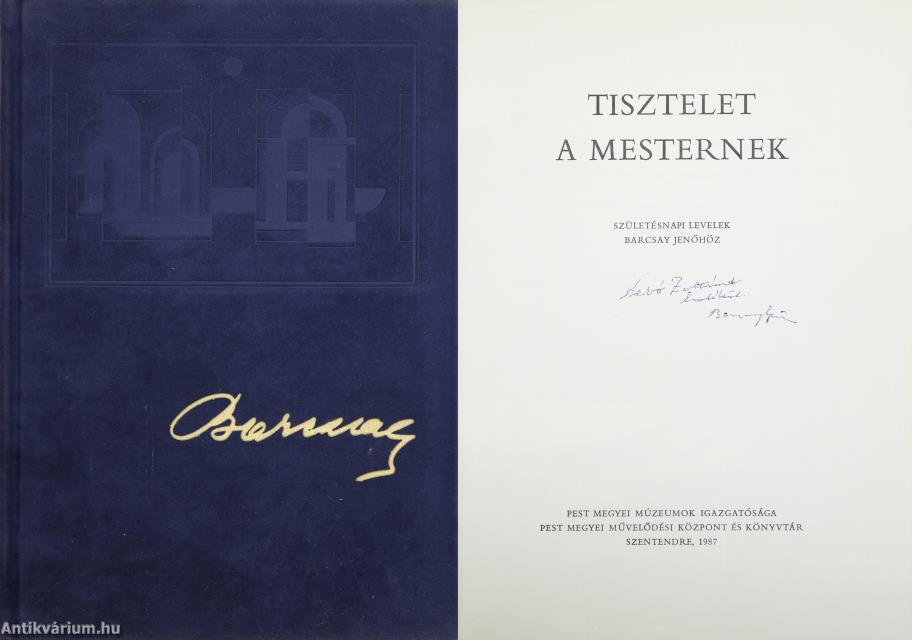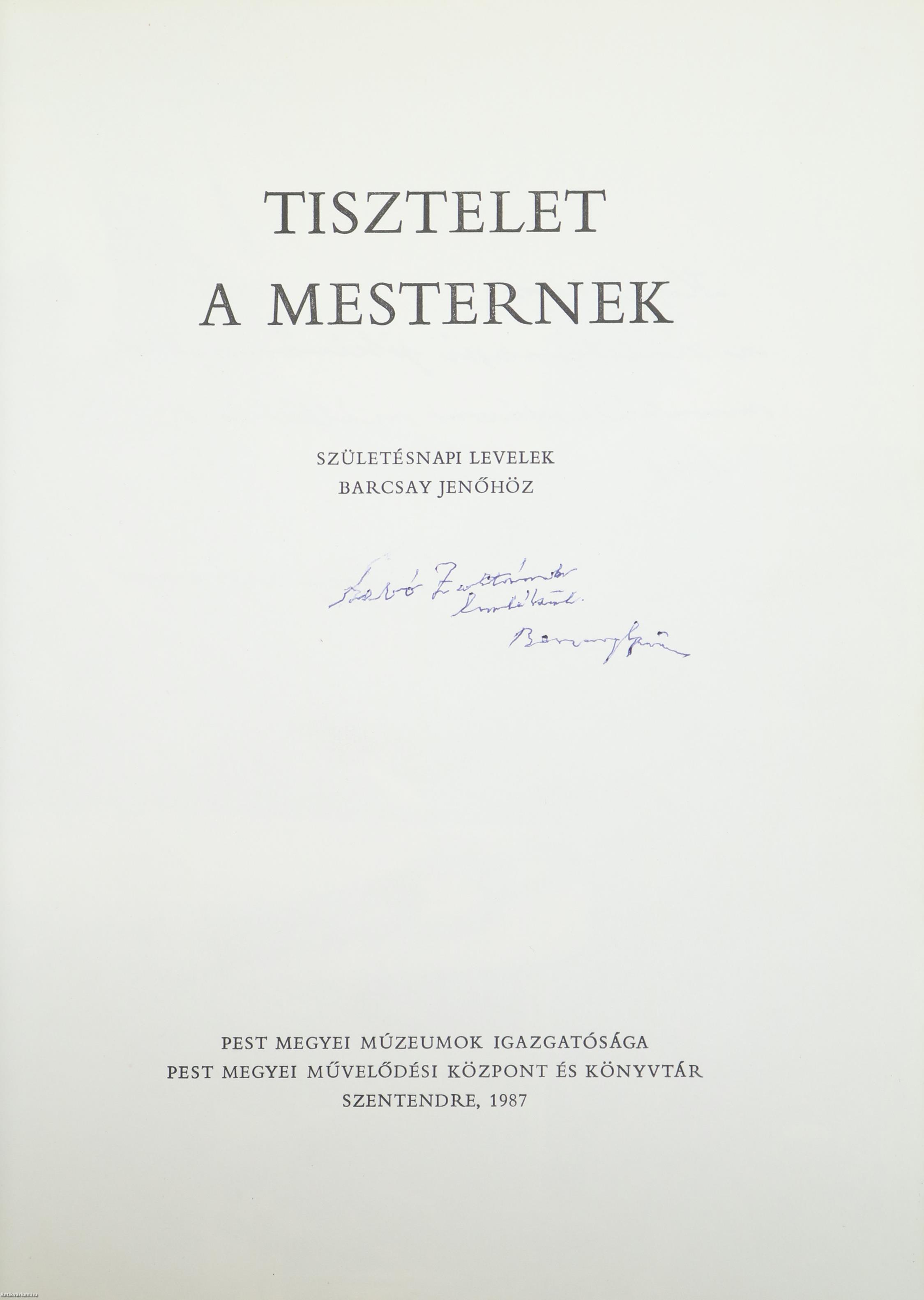 Barcsay Jenő által dedikált, számozott, bibliofil példány.Első kiadás. Tisztelet a mesternek. Születésnapi levelek Barcsay Jenőhöz. Könyvterv és szerkesztés: Bihari József. Képszerkesztő: Aladics Antal. Színes fotók: Gajzágó Jolán. Portréfotó: Véső Ágoston. Borítóterv és grafika: Balogh László. Készült ezer számozott példányban. Jelen kötet a 45. számú példány. Címlapon a levelek címzettje, Barcsay Jenő tollal beírt, névre szóló dedikációja olvasható: "Sz. Z.-nak emlékül. Barcsay Jenő". Barcsay Jenőhöz írt születésnapi levelekkel, versekkel, színes, feliratozott fotókkal, szöveg közti fekete-fehér könyvdíszekkel és tartalomjegyzékkel ellátott kötet. Nyomtatta a Kner Nyomda Gyomaendrődön. Kiadói egészbársony kötésben lévő példány Barcsay Jenő aranyozott aláírásával és dombornyomott illusztrációval ellátott címfedéllel, aranyozott feliratozású könyvgerinccel, kiadói előzéklapokkal, tiszta belívekkel, hiánytalan, jó állapotban, kissé sérült nylon kiadói védőborítóban.
