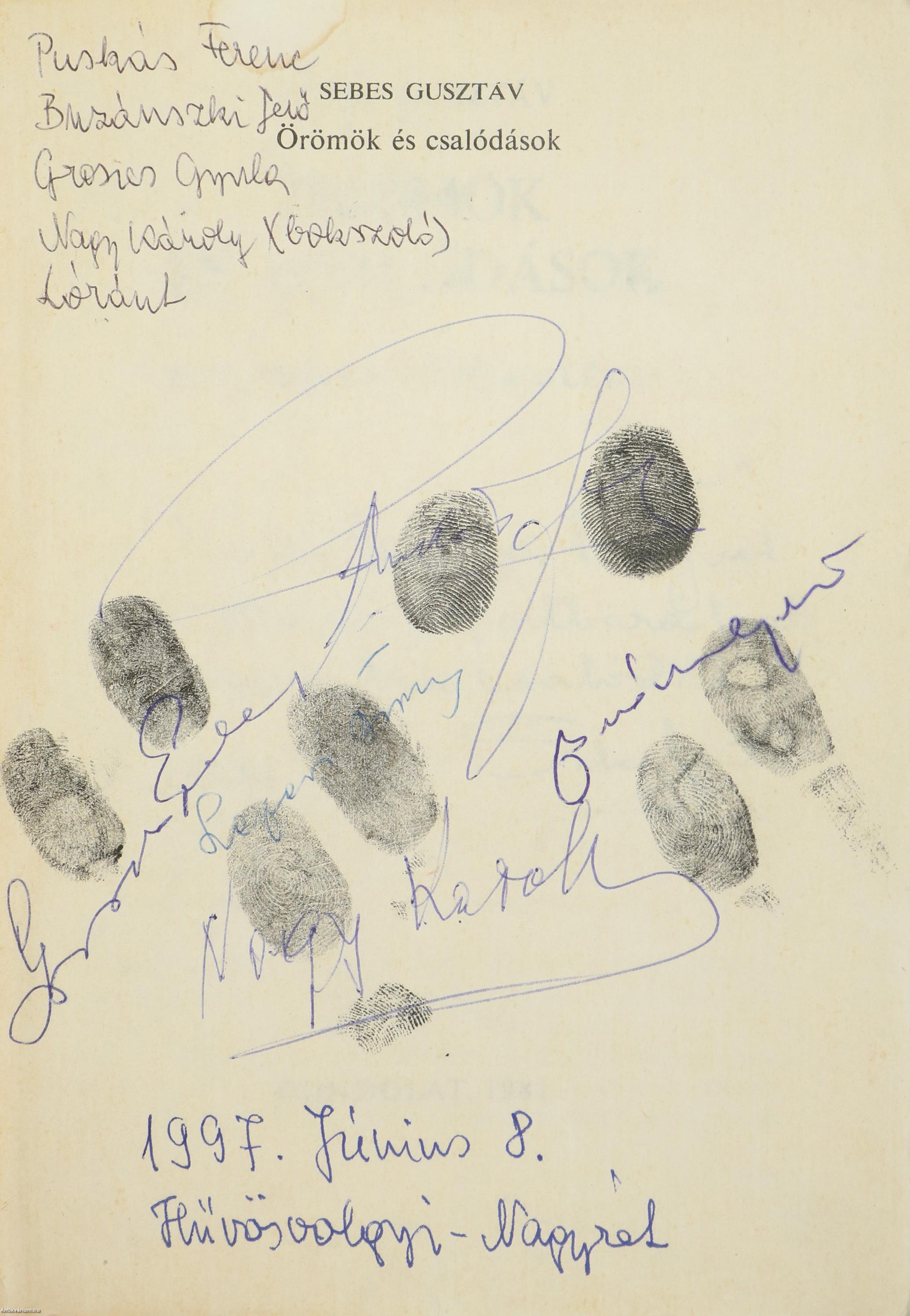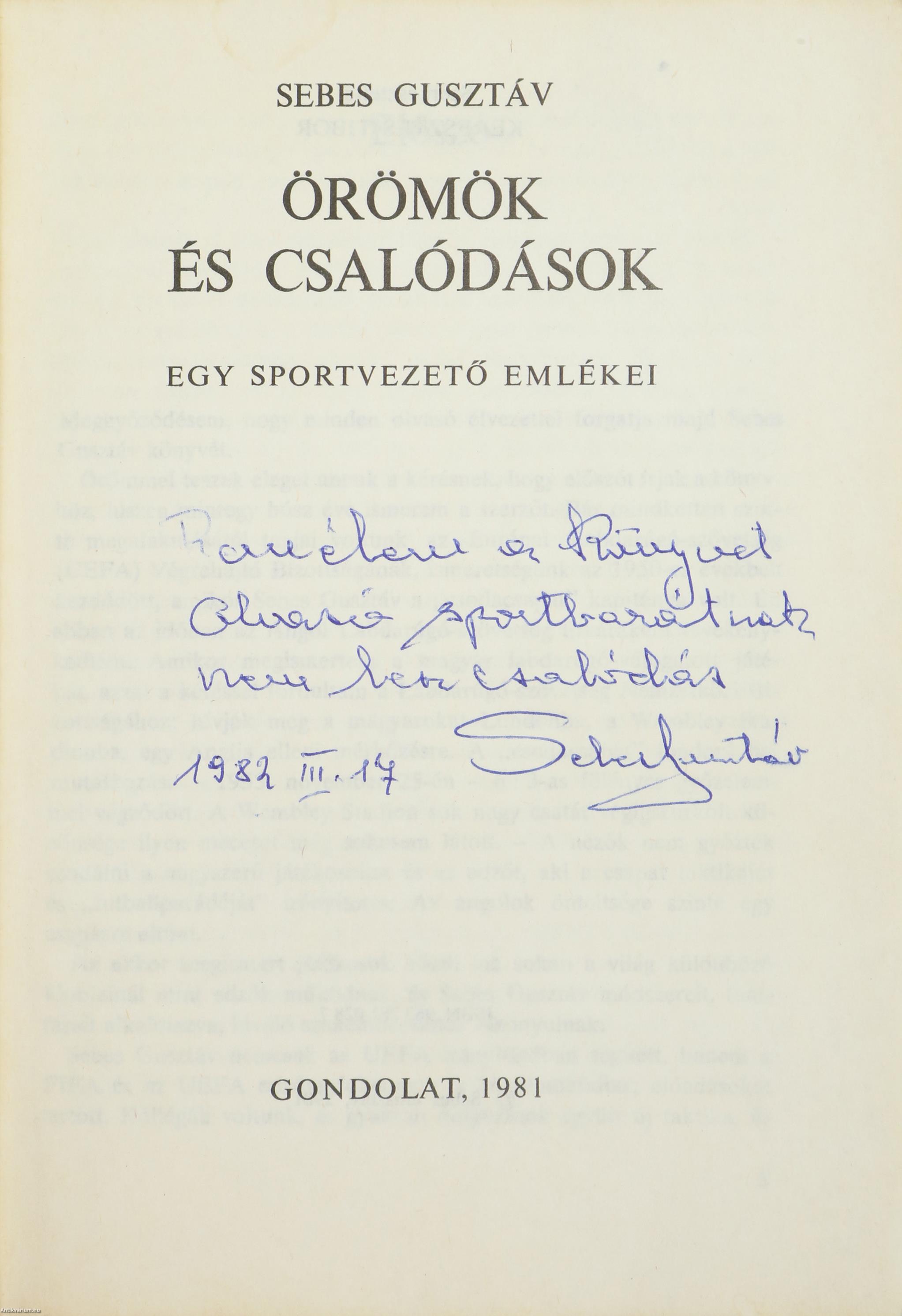Puskás Ferenc, Buzánszky Jenő, Grosics Gyula magyar labdarúgók, Nagy Károly ökölvívó, Szepesi György sportújságíró aláírásával és a szerző dedikációjával ellátott példány.Első kiadás. Örömök és csalódások. Egy sportvezető emlékei. Írta: Sebes Gusztáv. Szerkesztette: Keresztes Tibor. Borítóterv: Simon Zoltán. Stanley Rous FIFA elnök előszavával, szerzői bevezetéssel, szöveg közti, fekete-fehér, feliratozott fotókkal és kötetvégi tartalomjegyzékkel ellátott könyv. Feliratozott előlapon a négy sportoló - Puskás Ferenc, Buzánszky Jenő, Grosics Gyula, Nagy Károly - és a sportújságíró, Szepesi György tollal beírt aláírása, valamint a címlapon a szerző, Sebes Gusztáv tollal beírt, név nélküli, dátumozott, aláírt dedikációja olvasható: "Remélem a könyvet olvasó sportbarátnak nem lesz csalódás. 1982. III. 17. Sebes Gusztáv". A kötetet a Zrínyi Nyomda nyomtatta Budapesten. Kiadói ragasztott papírkötésben lévő példány feliratozott, színes fotóval illusztrált címfedéllel, feliratozott könyvgerinccel és hátlappal, tiszta belívekkel, hiánytalan, átlagos állapotban.