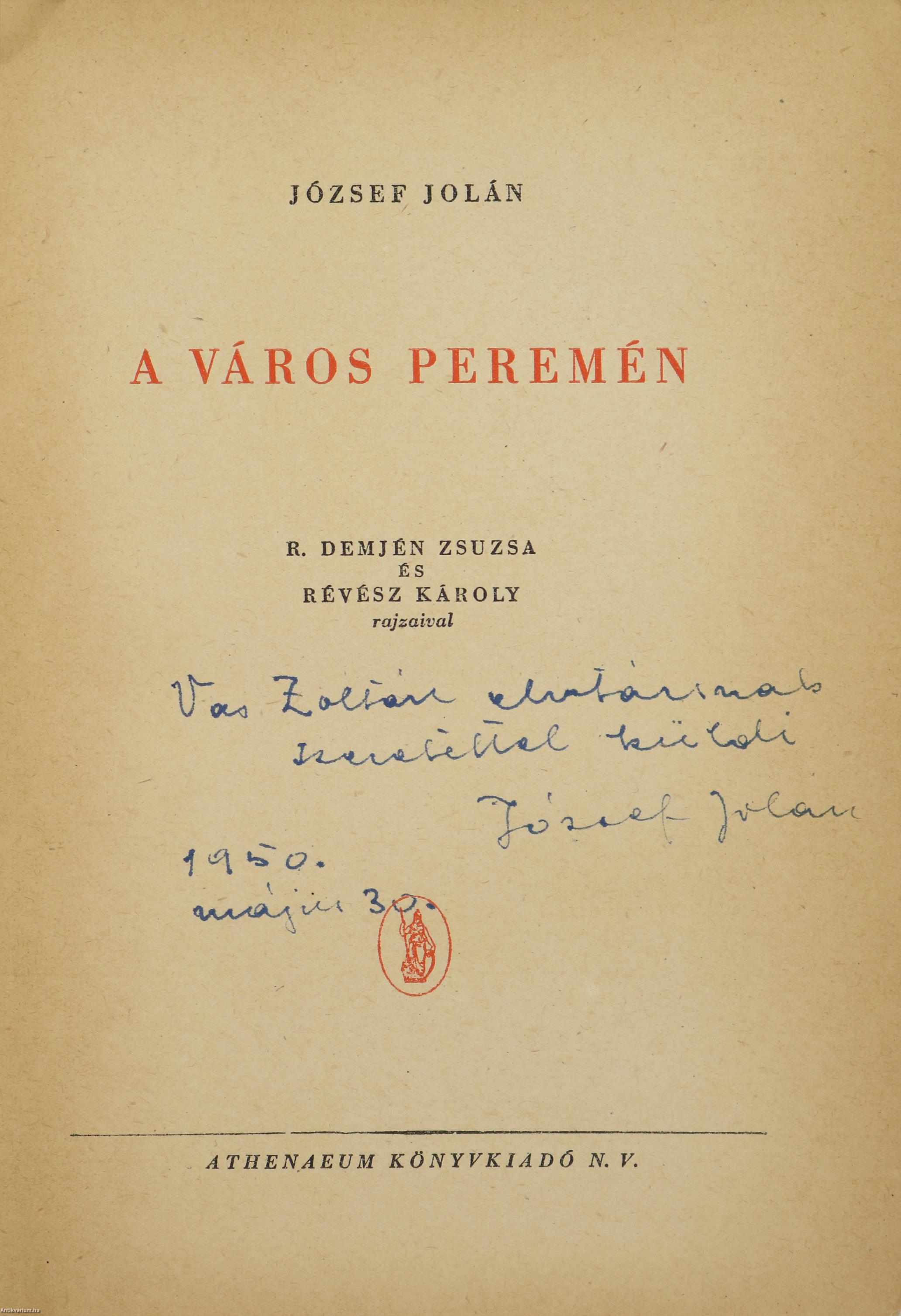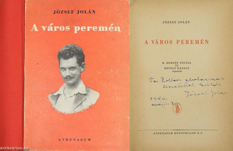 Szerző által dedikált példány. Első kiadás. A város peremén. Írta: József Jolán.