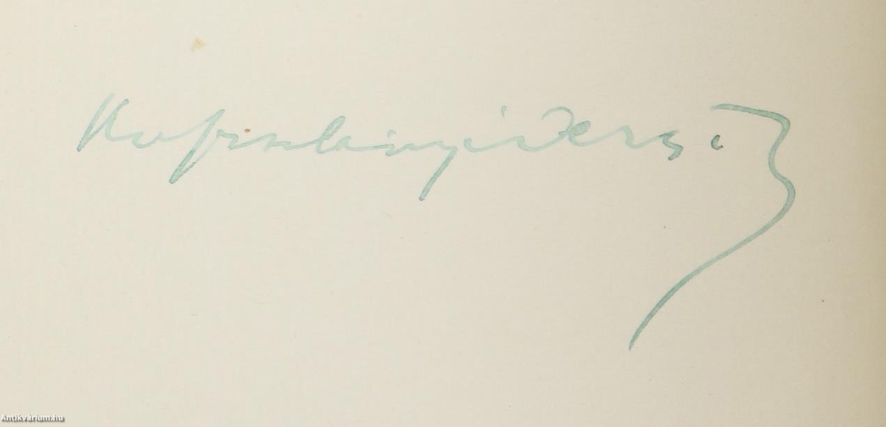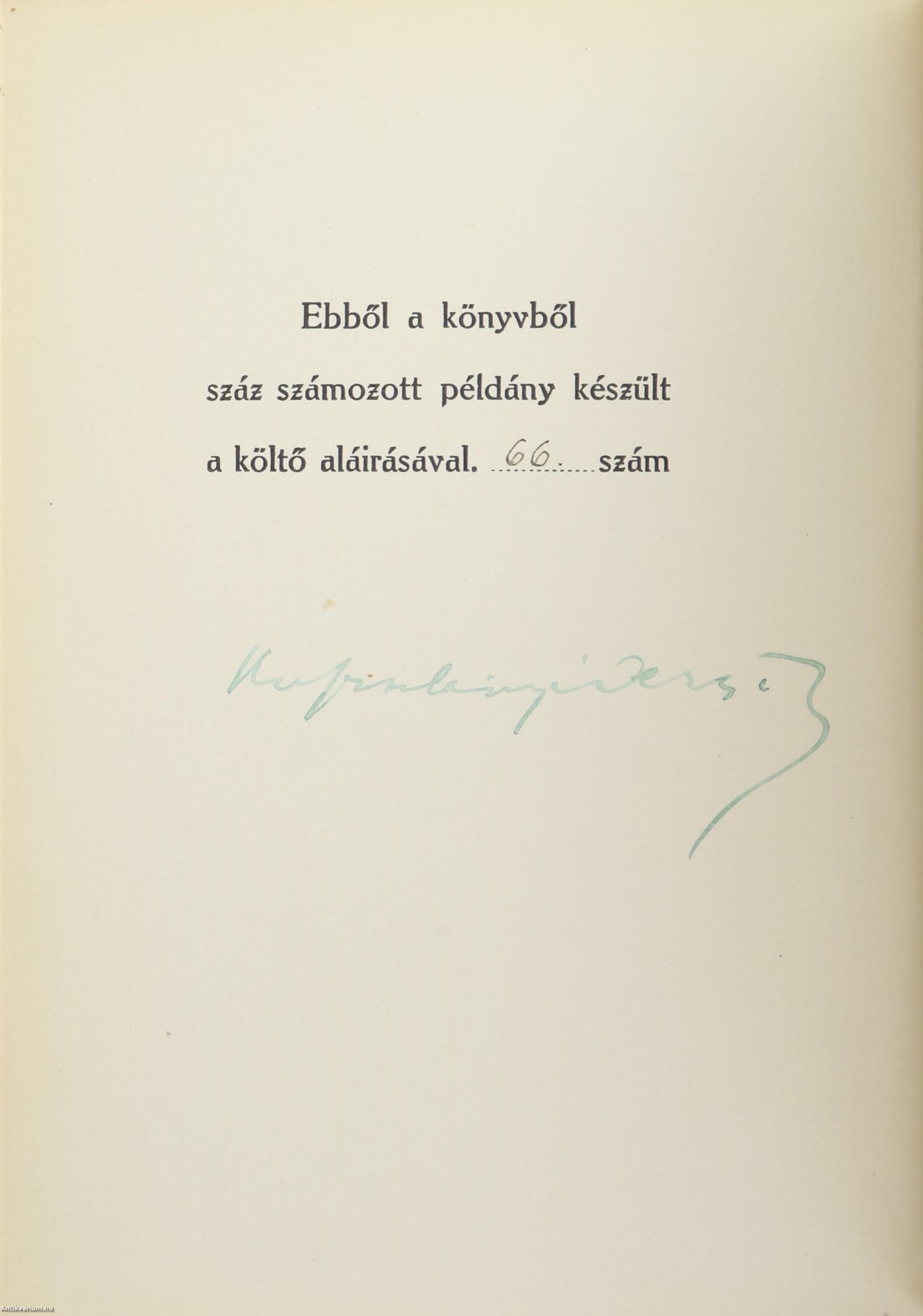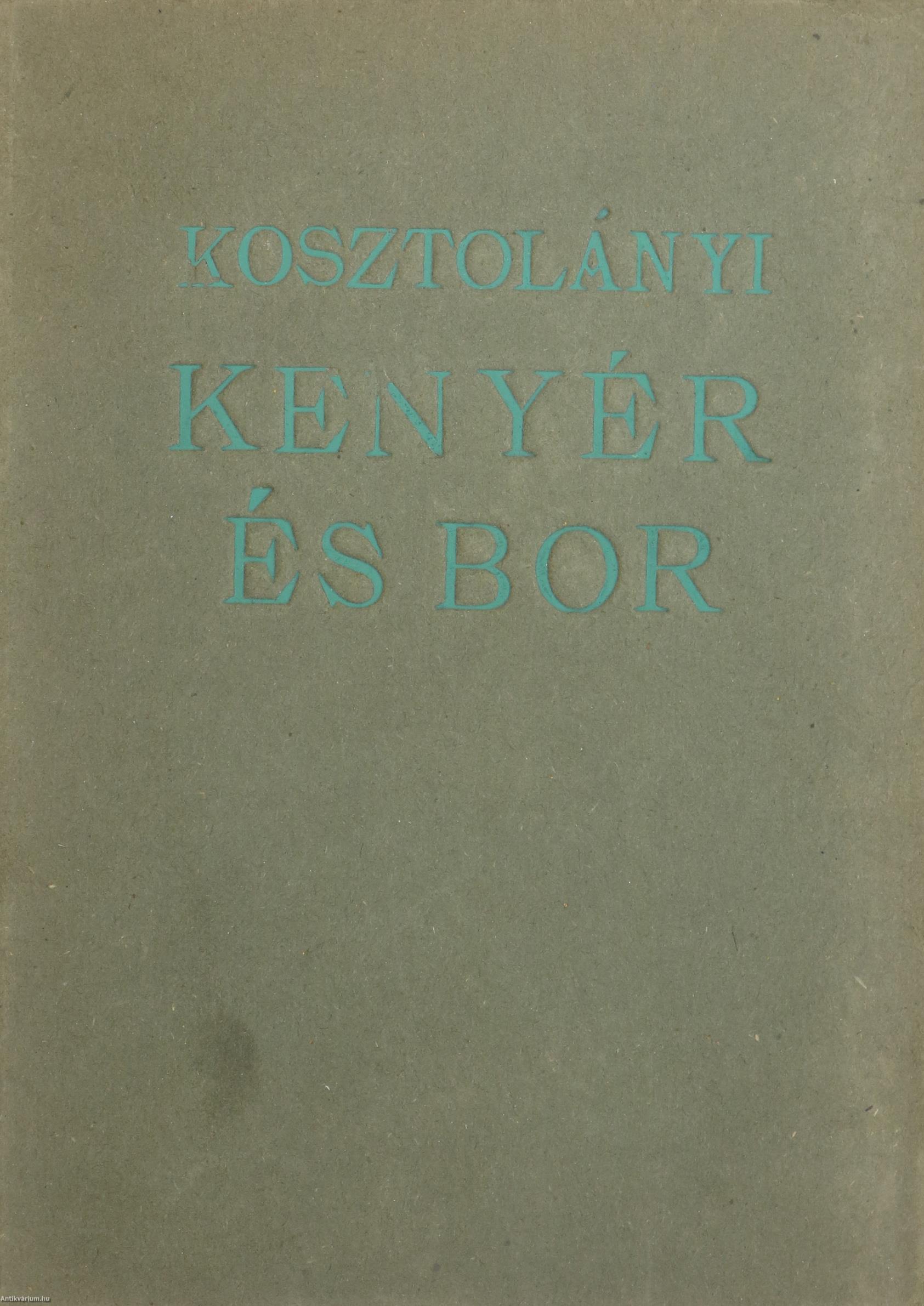 Szerző által aláírt példány. Első, számozott, bibliofil kiadás. Kenyér és bor. Új versek. Írta: Kosztolányi Dezső. Az előlap előtti lap verzóján a szerző, Kosztolányi Dezső tollal írt, jól olvasható aláírása látható. "Ebből a könyvből száz számozott példány készült a költő aláírásával."Ez a 66. számú példány. Tartalomjegyzékkel ellátott kötet. A címfedél belső oldalán illusztrációval ellátott Ex-libris címke látható. Nyomtatta a Tevan Nyomda és Könyvkiadóvállalat, Békéscsabán. Kiadói varrott kemény papírkötésben lévő példány, feliratos címfedéllel, feliratozatlan, könyvkötő által pótolt papírborítású könyvgerinccel, feliratozatlan hátlappal, hiánytalan állapotban. A kötet szerzője Nemeskosztolányi Kosztolányi Dezső (Szabadka, 1885. március 29. – Budapest, 1936. november 3.) író, költő, műfordító, kritikus, esszéista, újságíró, a Nyugat első nemzedékének kimagasló formaművésze, a XX. századi magyar széppróza és líra egyik legnagyobb alakja. Első írását a Budapesti Napló közölte. A budapesti egyetem magyar-német szakán folytatta tanulmányait. 1904-ben beiratkozott a bécsi egyetemre, ahol Hegel filozófiájáról, Grillparzerről és Schillerről hallgatott szemináriumokat. Írásait a Szeged és Vidéke, a Bácskai Hírlap, a Budapesti Napló közölte. A Hét rendszeresen publikálta verseit, műfordításait és kritikáit. A kommün bukása után az Új Nemzedék c. szélsőjobboldali lapnál helyezkedett el. Rákosi Jenőt Kosztolányi követte a Magyar PEN Club elnöki tisztségében. Halálának évében a Nyugat különszámmal adózott emlékének, amelyben Babits Mihály rehabilitálta fiatalkori barátját és művésztársát.