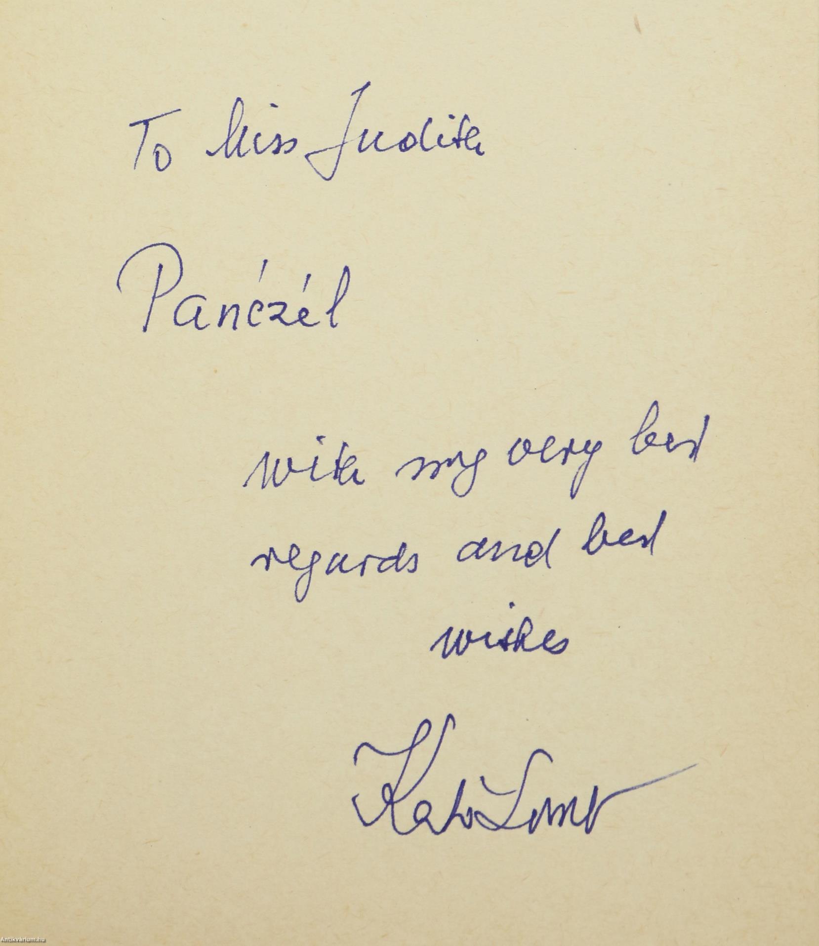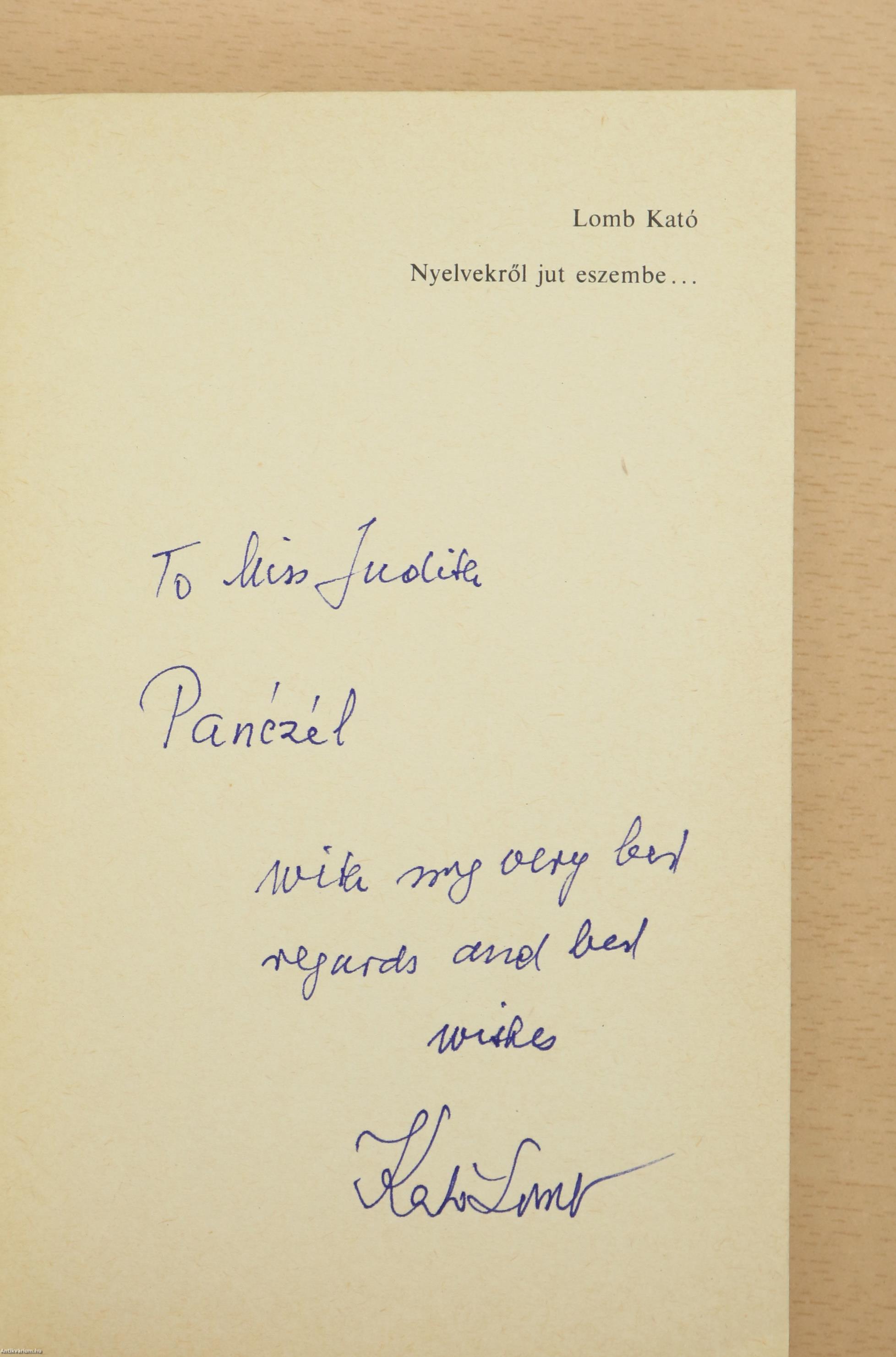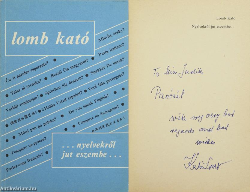 Szerző által dedikált példány. Nyelvekről jut eszembe... Írta: Dr. Lomb Kató. A kötet feliratozott előlapján a szerző, Lomb Kató angol nyelvű, névre szóló dedikációja olvasható : "To Miss J. P. with my very best regards and best wishes Kató Lomb." Kiadói ragasztott papírkötésben lévő példány feliratozott címfedéllel, feliratozott könyvgerinccel, tiszta belívekkel, megkímélt, szép állapotban.