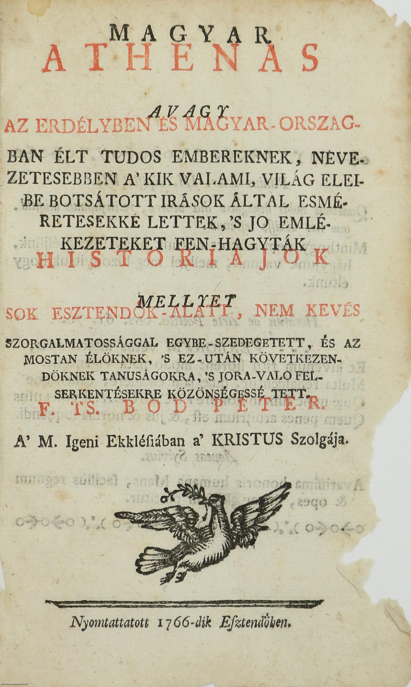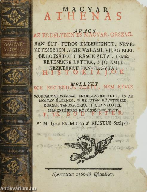 Első kiadás. Magyar Athenas avagy az Erdélyben és Magyar-országban élt tudos embereknek, nevezetesebben a' kik valami, világ eleibe botsátott irások által esméretesekké lettek, 's jo emlékezeteket fen-hagyták historiájok mellyet sok esztendők-alatt, nem kevés szorgalmatossággal egybe-szedegetett, és az mostan élöknek, 's ez-után következendöknek tanuságokra, 's jora-valo felserkentésekre közönségessé tett. F. TS. Bod Péter A' M. Igeni Ekklésiában a' KRISTUS Szolgája. Írta: Bod Péter Magyar nyelvű kiadás néhány latin nyelvű közbevetéssel. Ajánlással, szerzői bevezetéssel, tallózással és igazítással, mutató táblával, illetve a javítandók listájával (corrigenda) kiegészített kötet. A kötet címlapján az 1766-os kiadási dátum szerepel, viszont a szerző ajánlása szerint a kötet 1767-ben jelent meg. A kötet előzéklapján kézzel írt tulajdonosi névbejegyzések, a kötetvégi előzéklapon írott bejegyzés olvasható. Korabeli félbőr kötésben lévő példány feliratozatlan címfedéllel és hátlappal, aranyozott feliratozású, díszes, ötbordás könyvgerinccel, körben színezett lapélekkel, néhol foltos belívekkel, néhol sérült papírlapokkal, hiánytalan állapotban.