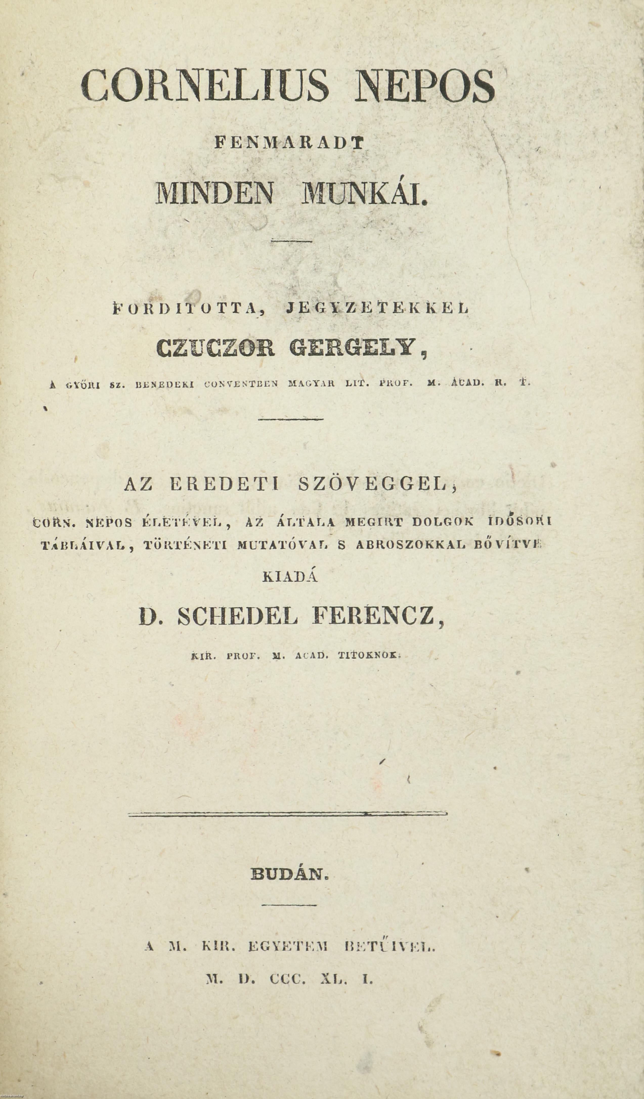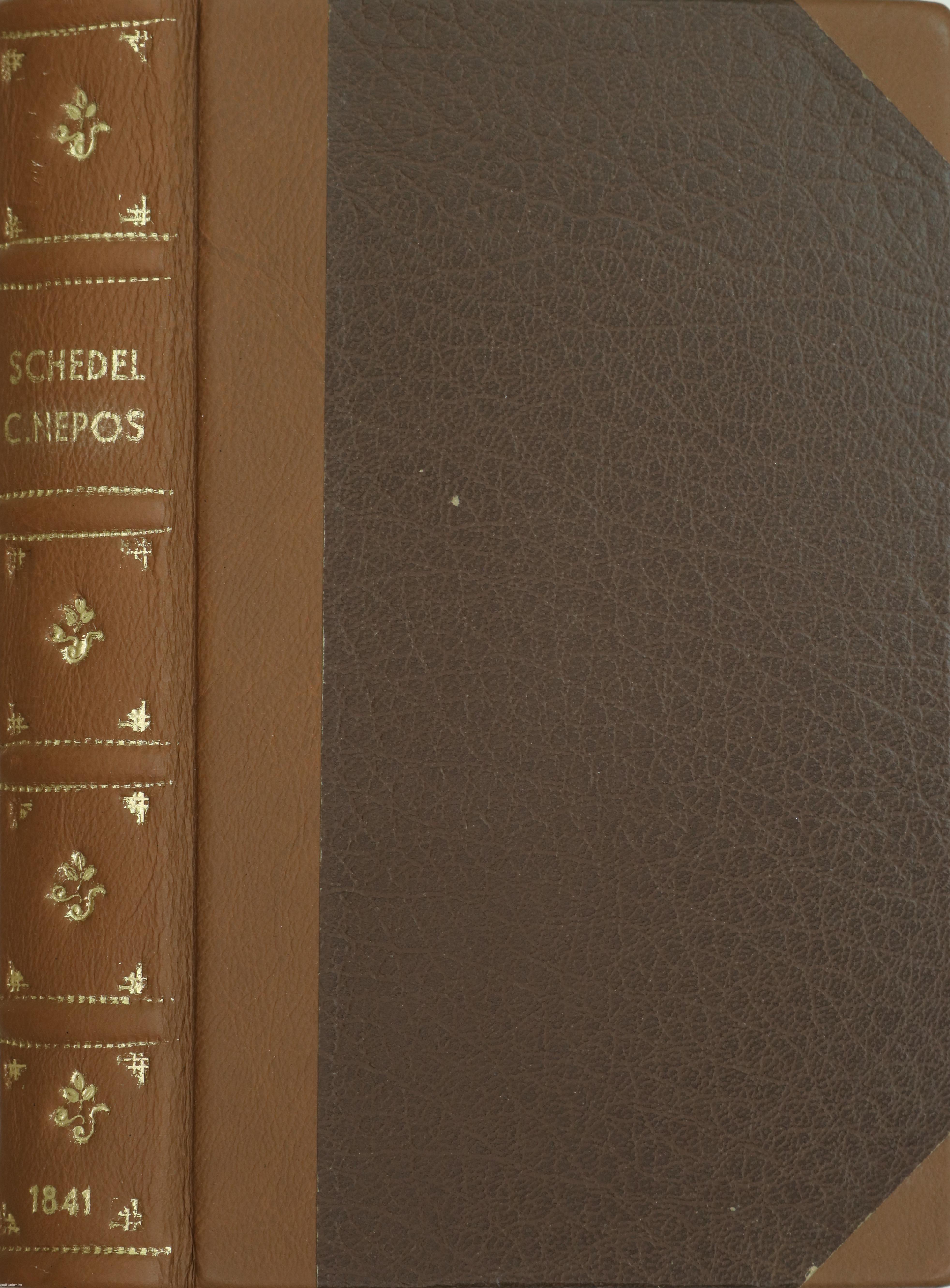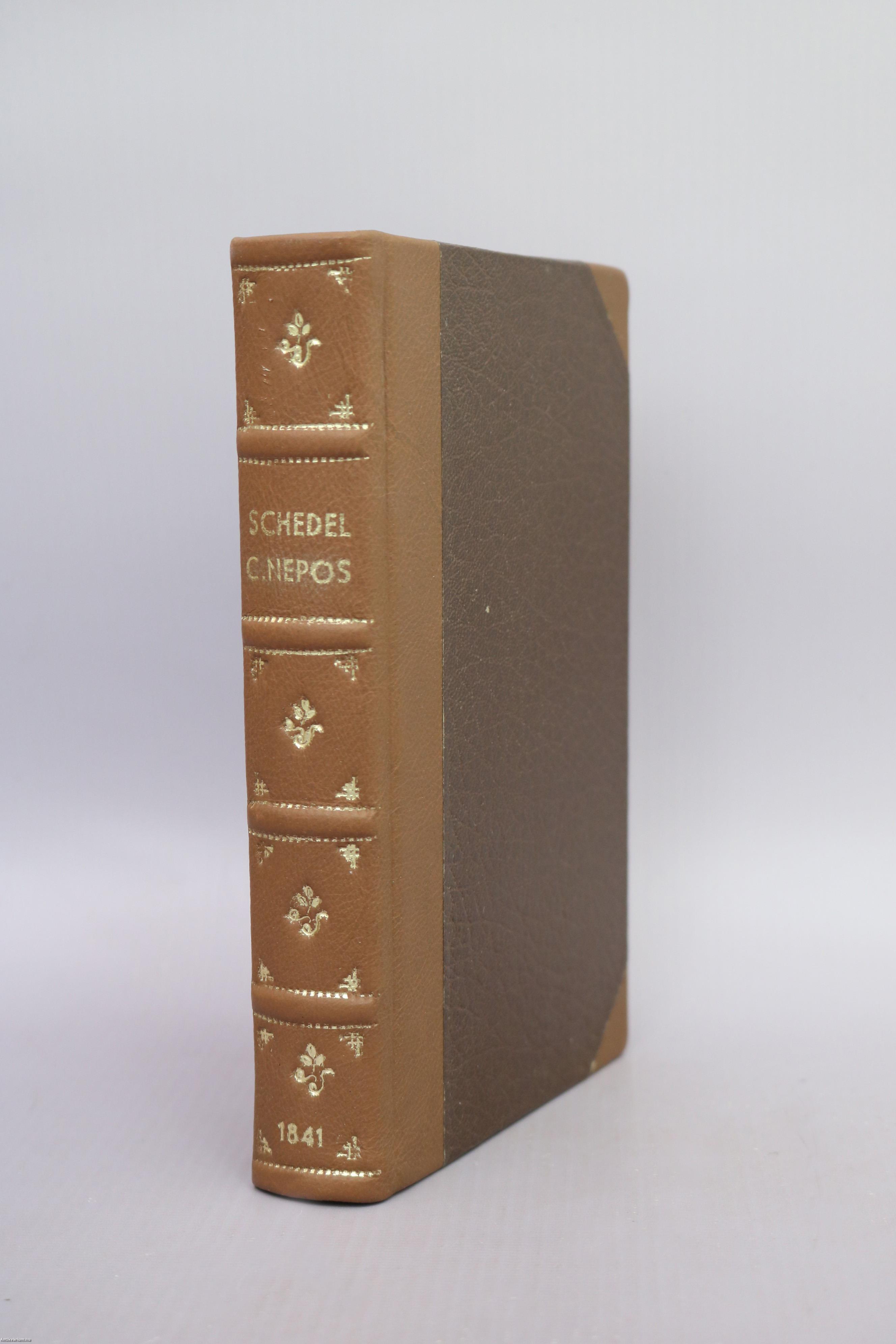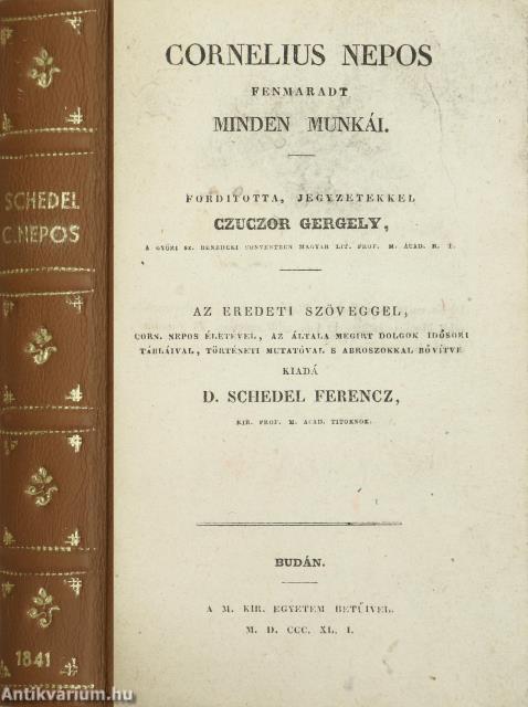 Első kiadás. Cornelus Nepos fenmaradt minden munkái. Fordította, jegyzetekkel ellátta: Czuczor Gergely, a győri Sz. Benedeki Conventben Magyar Lit. Prof. M. Acad. R. T. Az eredeti szöveggel, Corn. Nepos életével, az általa megirt dolgok idősori tábláival, történeti mutatóval s abroszokkal bővítve kiadá: D. Schedel Ferencz, kir. prof. M. Acad. titoknok. Latin-magyar nyelvű kiadvány. Fordítói ajánlással, bevezető értekezéssel Cornelius Nepos életéről és munkáiról, számozott lábjegyzetekkel, toldalékokkal, időrendi táblázatokkal, betűrendes, kéthasábos történeti mutatóval, a kötet végén négy feliratozott, színezett, egész oldalas vonatkozó térképekkel. A könyvet a M. Kir. Egyetem nyomtatta Budán. Könyvkötői félbőr kötésben lévő példány feliratozatlan fed- és hátlappal, aranyozott feliratozású, aranyozott bordadíszekkel ellátott, hatbordás könyvgerinccel, modern, merített papíros előzéklapokkal, tiszta, merített papíros belívekkel, néhol ceruzával írt jelölésekkel, körben mintázott lapélekkel, hiánytalan állapotban.
