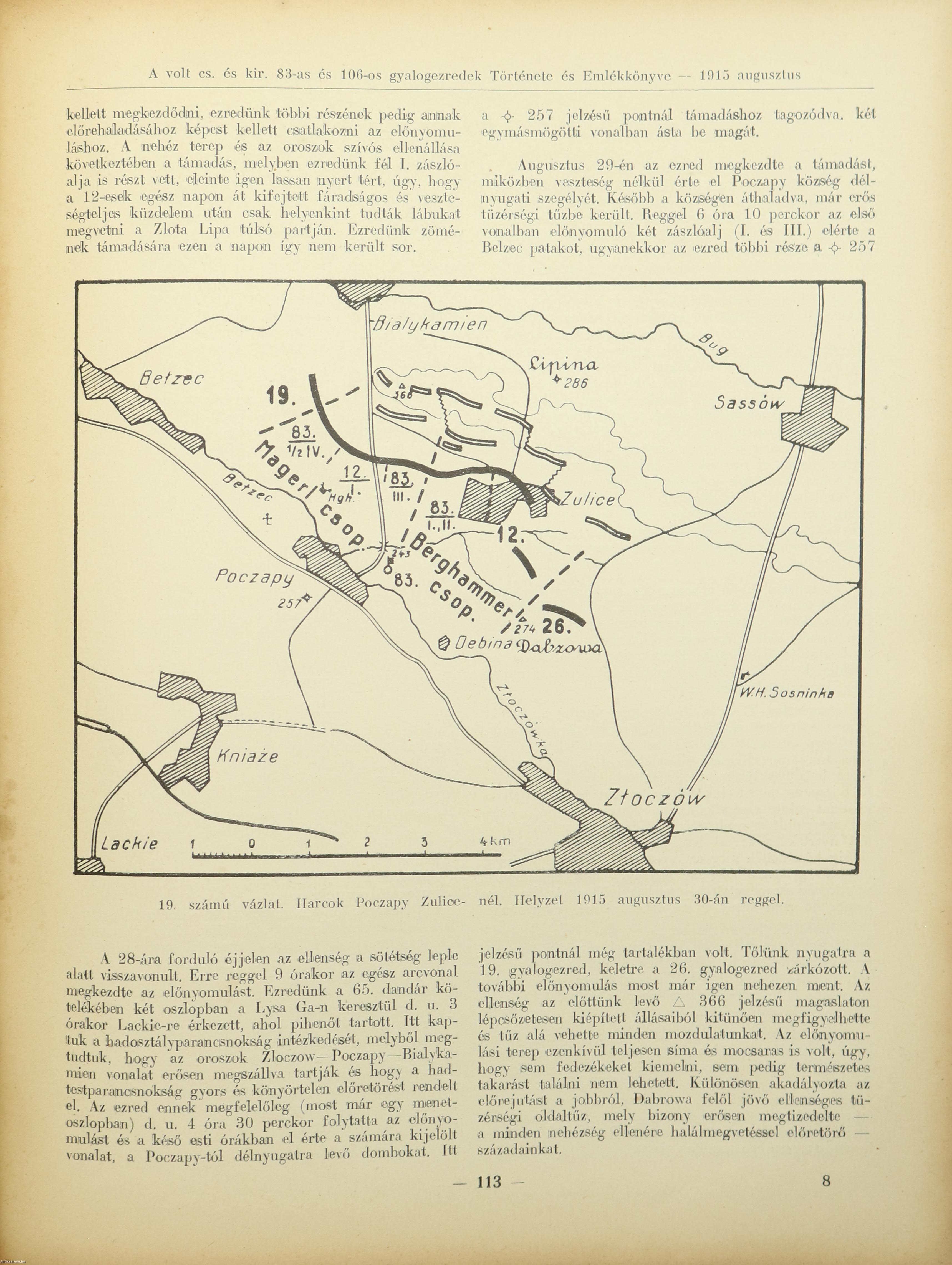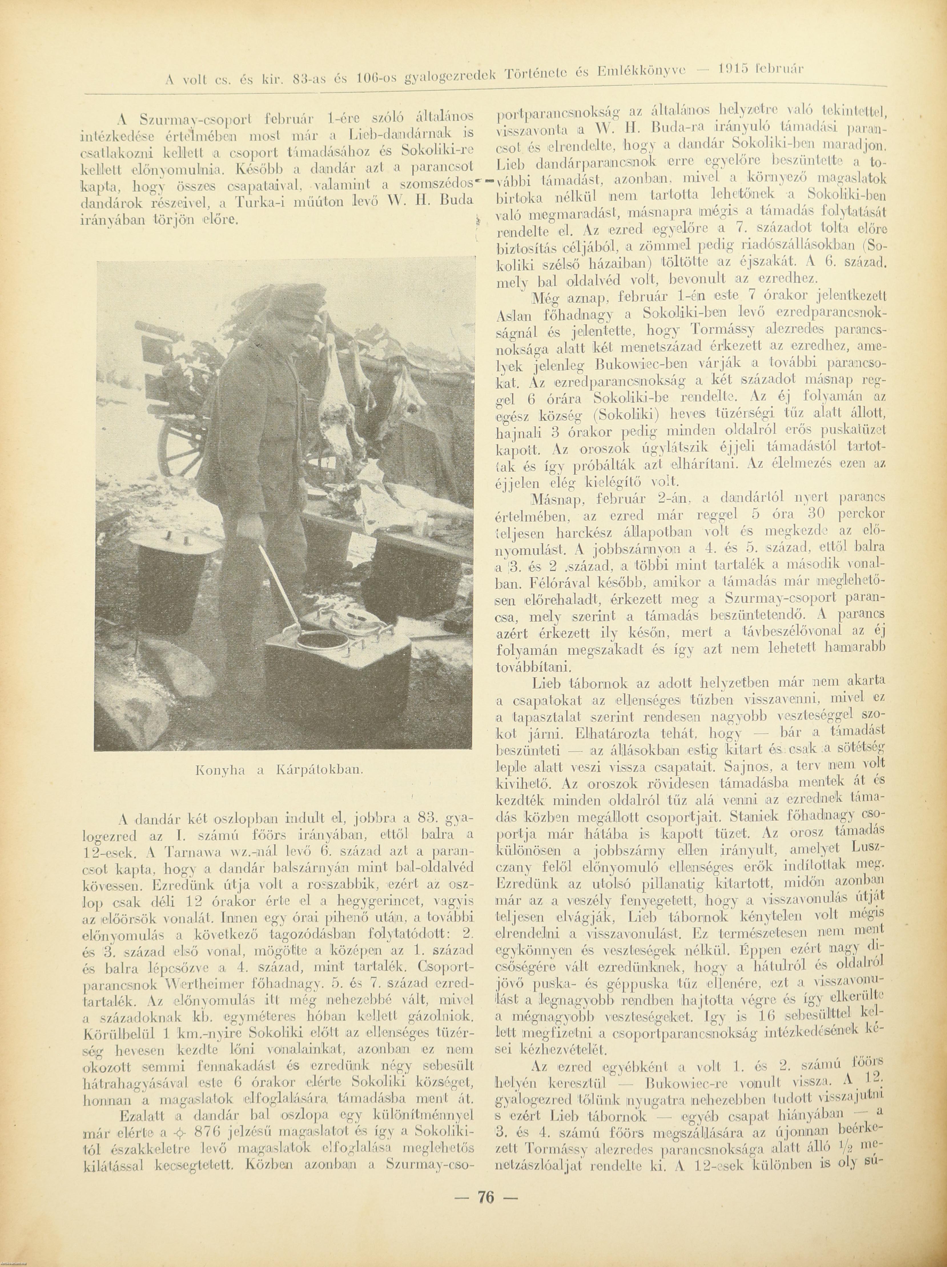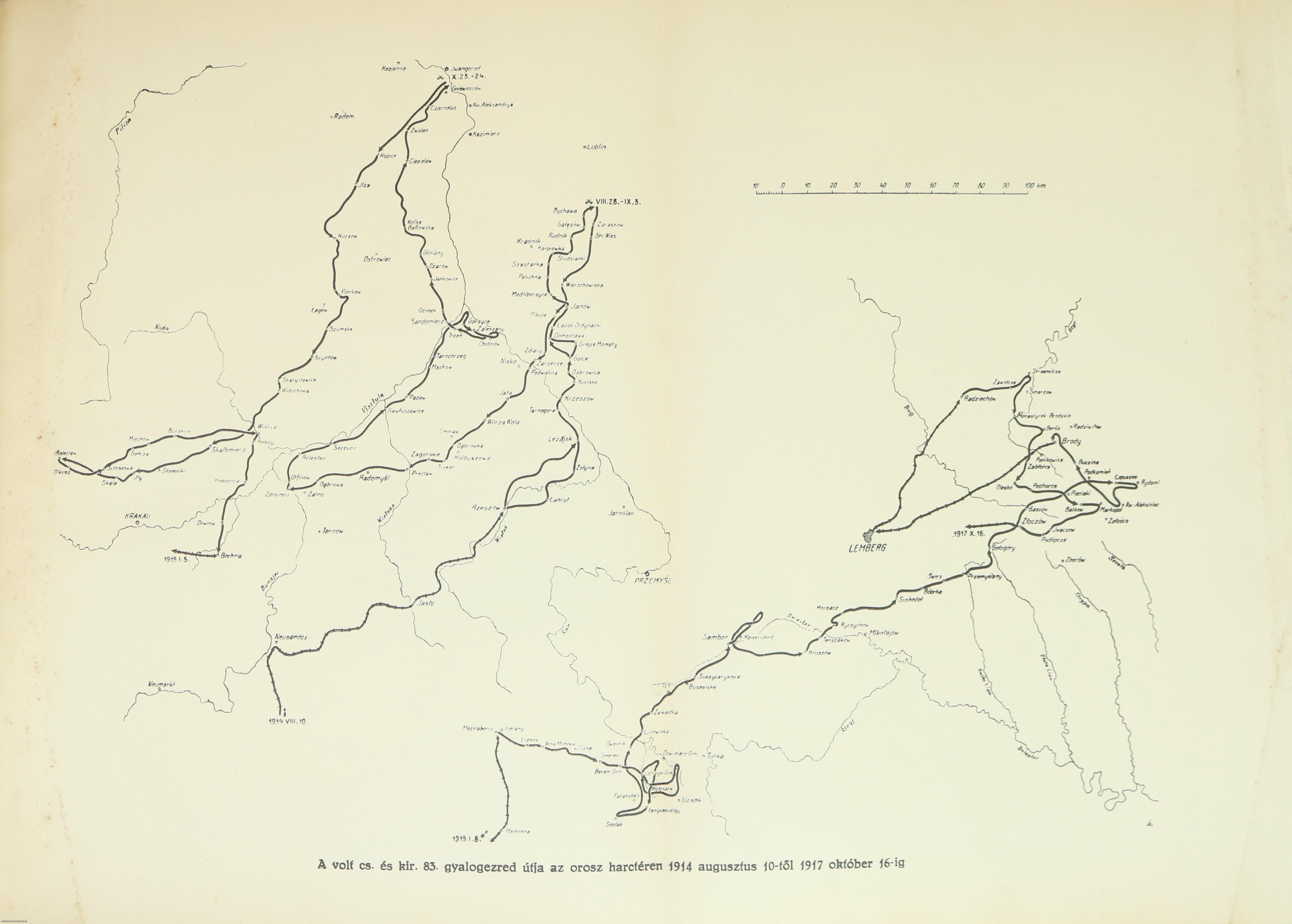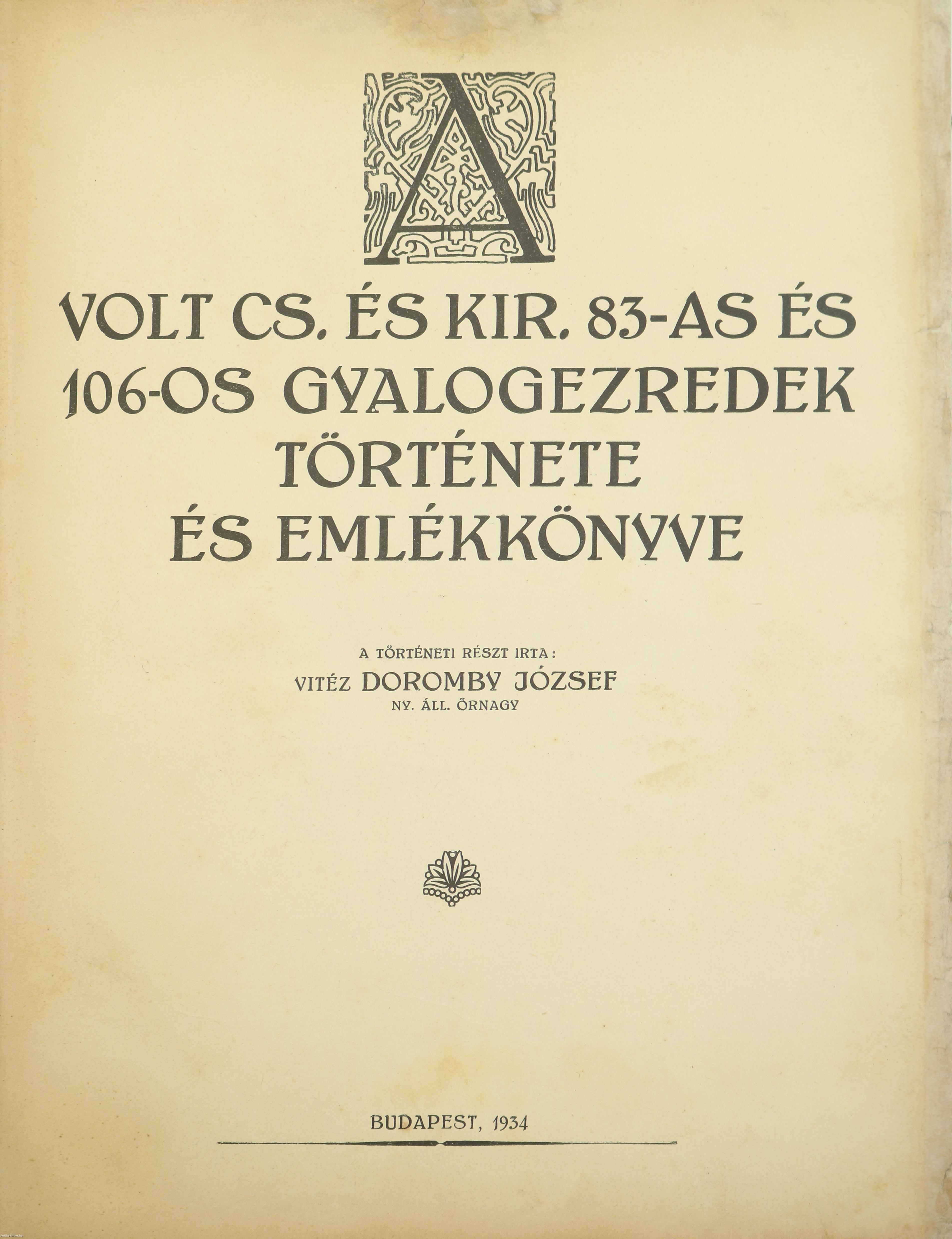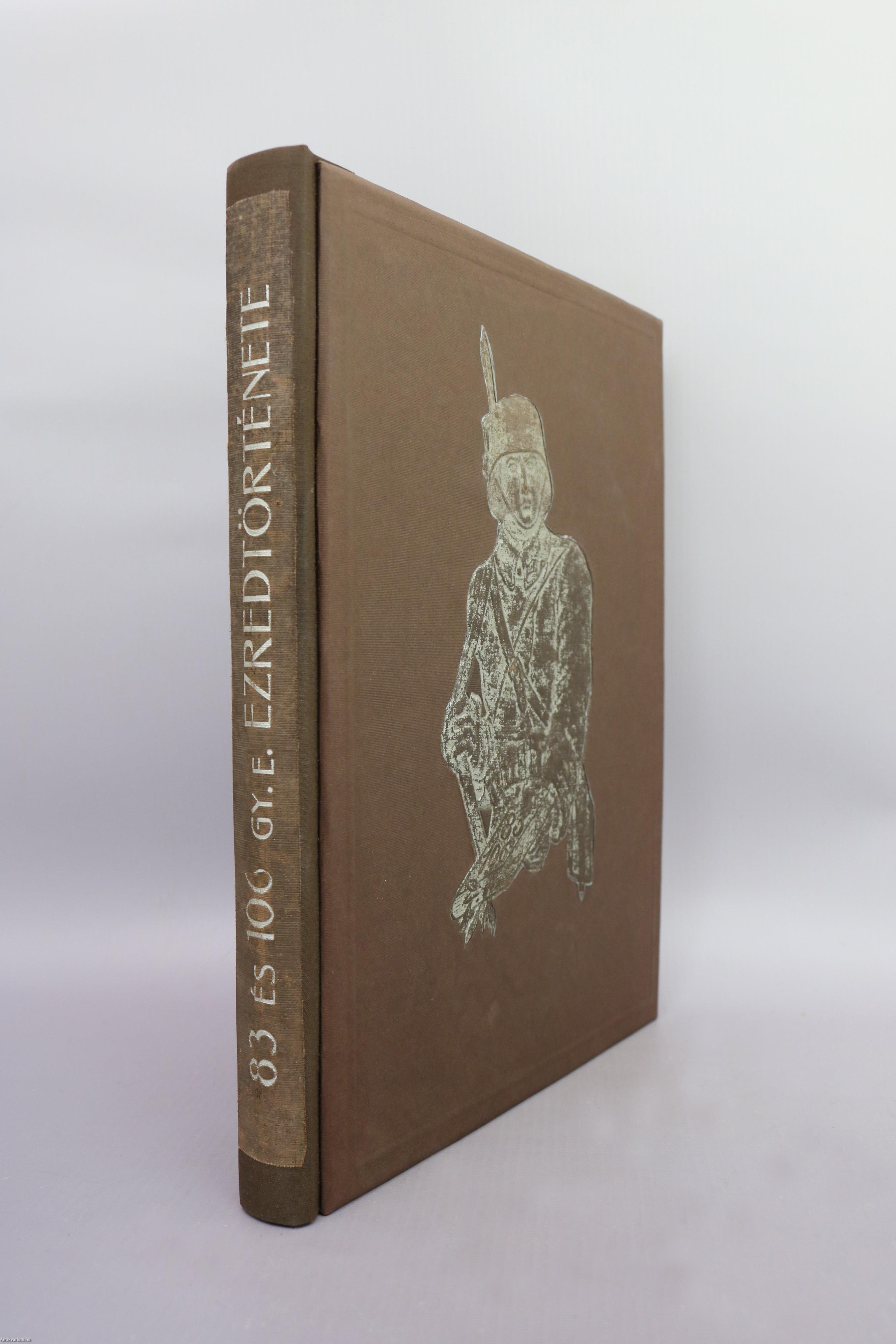 Első kiadás. A volt cs. és kir. 83-as és 106-os gyalogezredek története és emlékkönyve. A történeti részt írta: vitéz Doromby József ny. áll. őrnagy. A könyv tábláján lévő dombormű Elischer Farkas t. fhgy. eredeti rajza után készült. Szöveg közti, fekete-fehér fényképekkel és térképvázlatokkal, illetve 3 kihajtható térképpel illusztrált, valamint Mikes János szombathelyi püspök és alsebesi Tormássy Dezső ny. tábornok előszavával, illetve tartalomjegyzékkel kiegészített kötet. Nyomtatta Hollóssy János könyvnyomtató mester Budapesten. Javított kiadói egészvászon kötésben lévő példány, feliratozatlan, ezüstözött illusztrációval díszített címfedéllel, könyvkötő által pótolt vászon könyvgerincre kasírozott, ezüstözött feliratozású, kiadói könyvgerincrészlettel, feliratozatlan hátlappal, néhány oldalon ceruzás aláhúzással és széljegyzettel, hiánytalan állapotban.