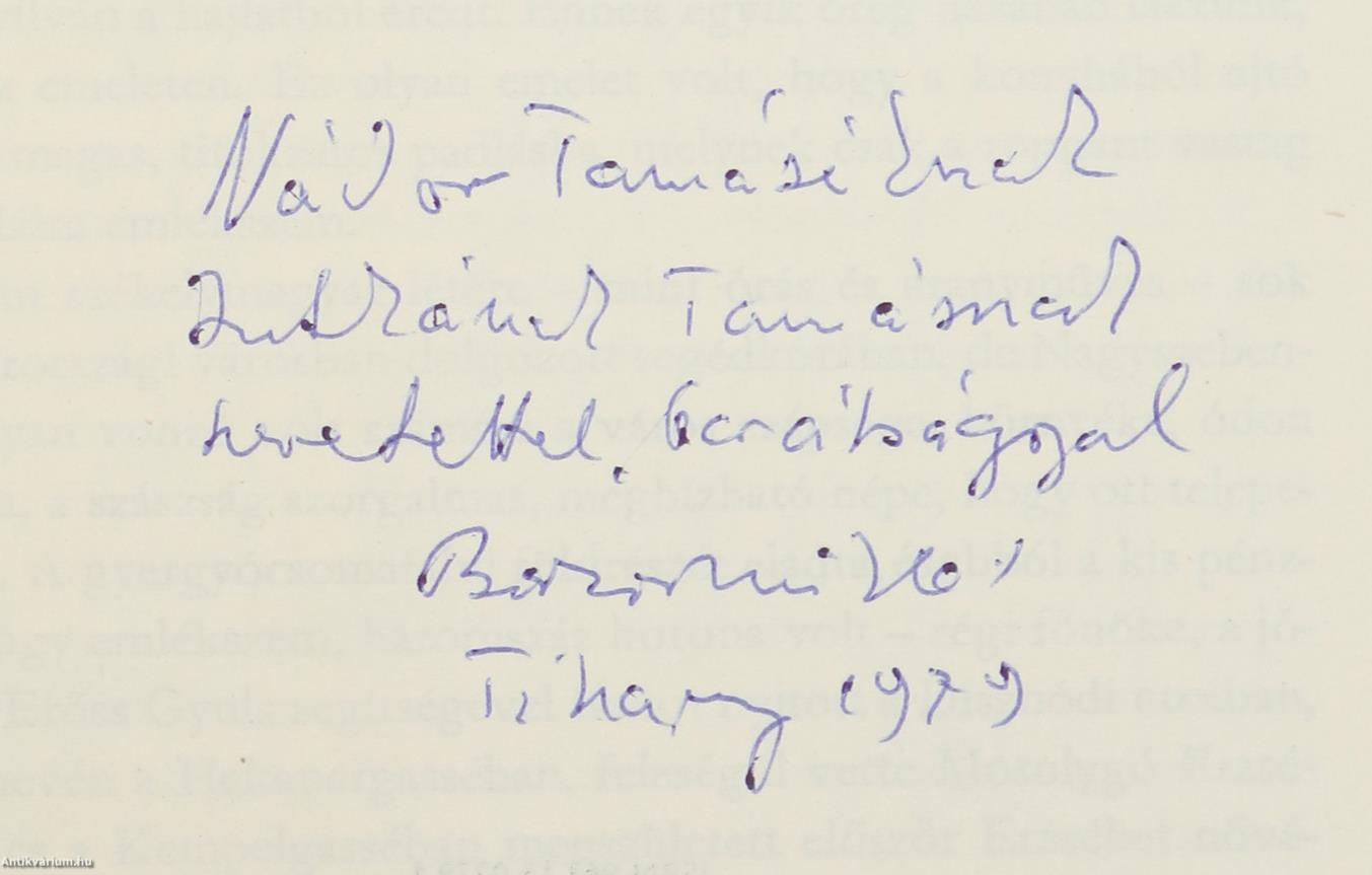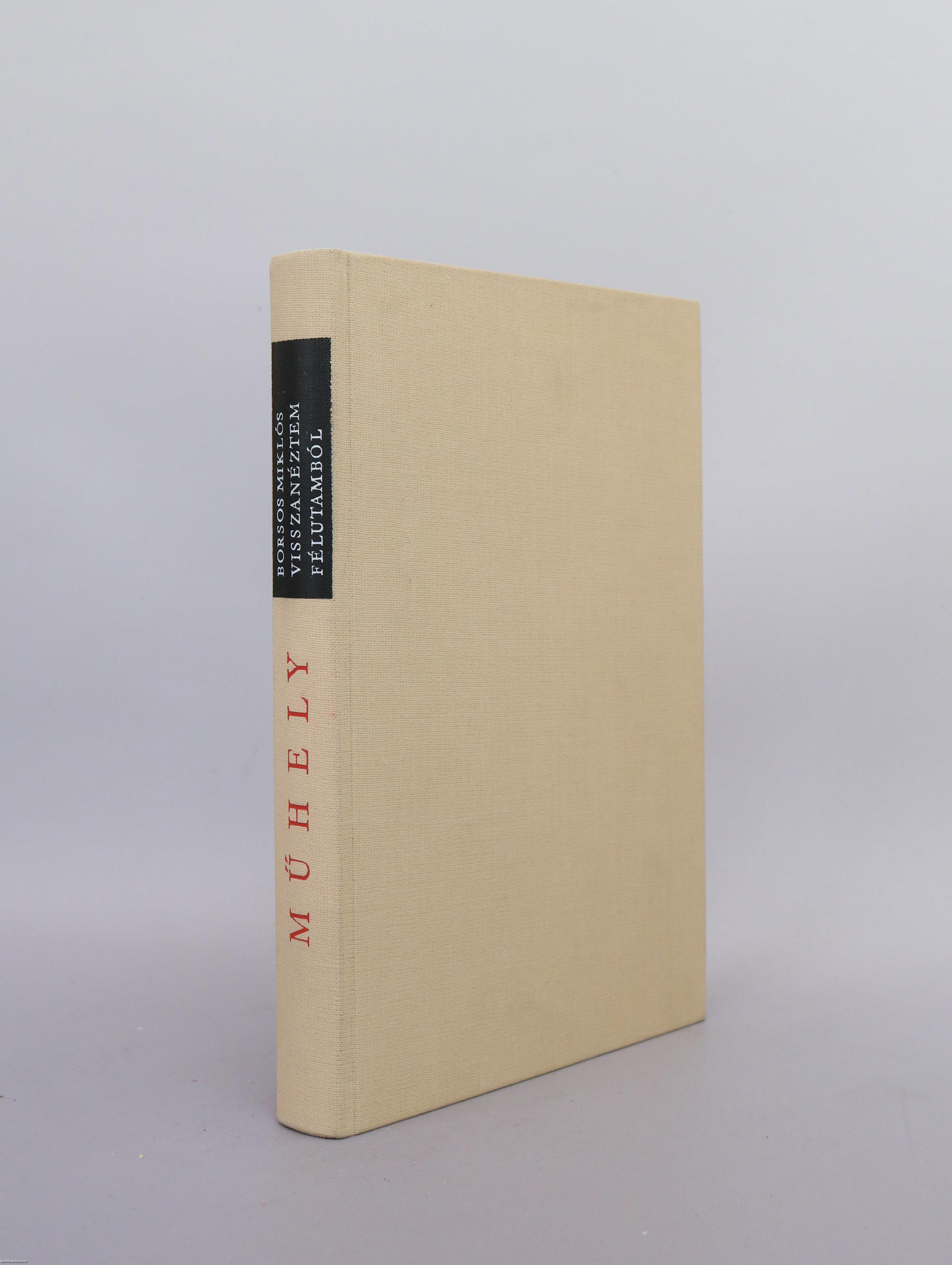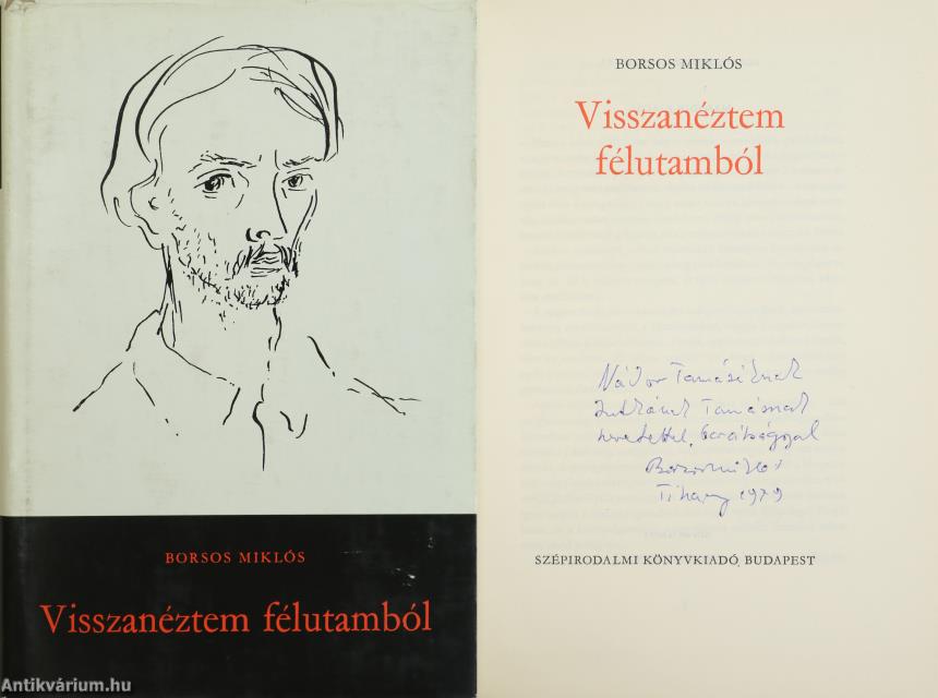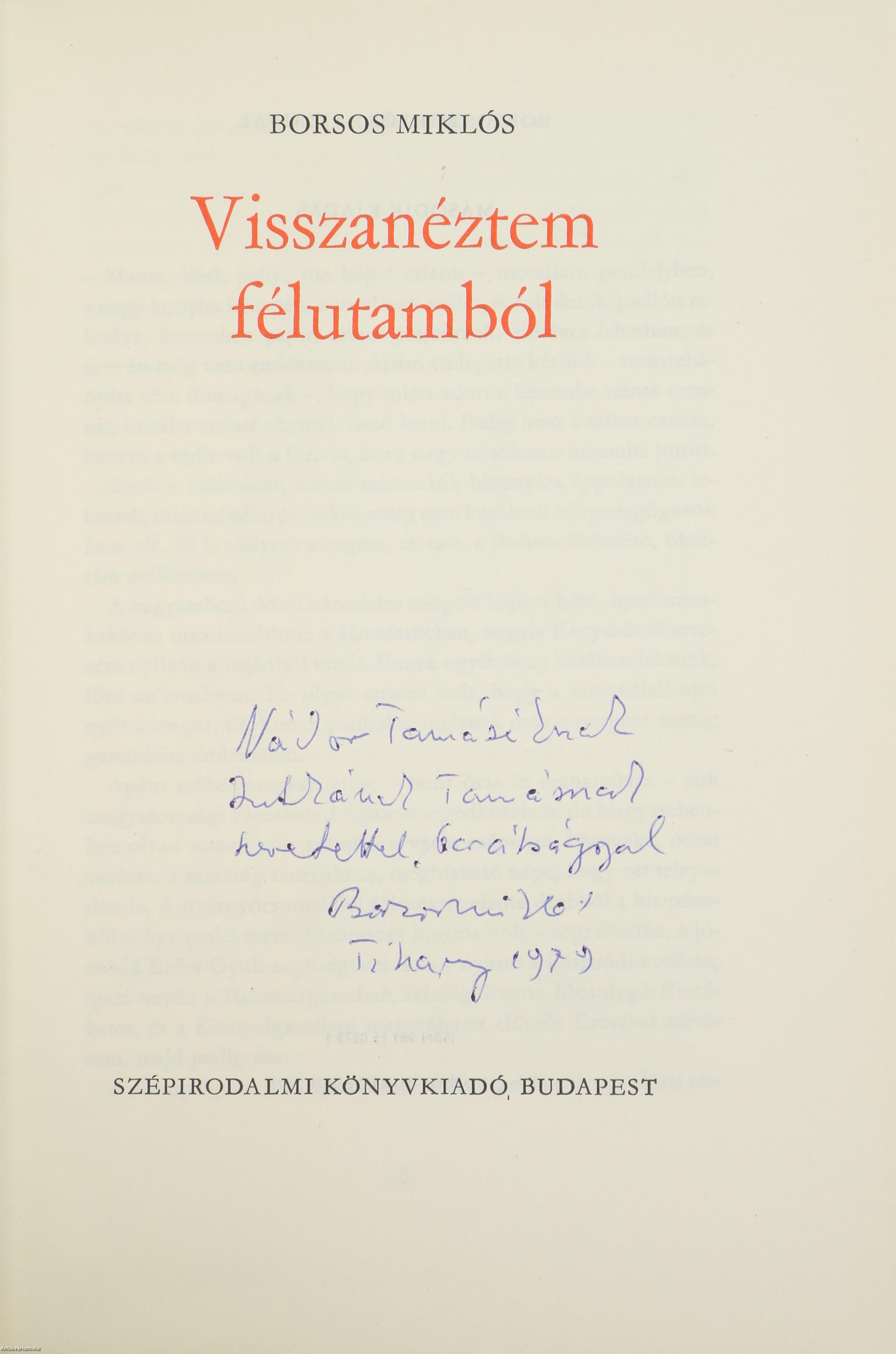 Szerző által dedikált példány. Visszanéztem félutamból. Írta: Borsos Miklós. A címlapon a szerző, Borsos Miklós tollal beírt, névre szóló dedikációja olvasható: "N. T.-éknak, J.-nak, T.-nak szeretettel, barátsággalBorsos Miklós. Tihany, 1979." Második kiadás. Borsos Miklós fekete-fehér rajzaival és tizenhat fekete-fehér képtáblával illusztrált, valamint zárszóval és részletes tartalomjegyzékkel kiegészített kötet. A borító-, kötésterv és tipográfia Pintér László munkája. A fényképeket készítették: Borsos Miklós, Petrás István, Rácz István. Nyomtatta a Kner Nyomda. Kiadói egészvászon kötésben lévő példány feliratozatlan címfedéllel és hátlappal, két színnel feliratozott könyvgerinccel, hiánytalan, jó állapotban, feliratozott, illusztrált, fülszöveges kiadói borítófedélben. A szerző, Borsos Miklós (Nagyszeben, 1906. augusztus 13. – Budapest, 1990. január 27.) szobrász, éremművész, grafikus. 1941-ben a Tamás Galériában rendezett tárlata feltűnően nagy sikert aratott. Tagja lett a Képzőművészek Új Társaságának. 1943-ban az Ernst Múzeumban szerepelt egy csoportos kiállításon Barcsay Jenővel, Dési Huber Istvánnal, Gadányi Jenővel és Pálffy Péterrel. 1946 és 1960 között az Iparművészeti Főiskola elismert tanára volt.