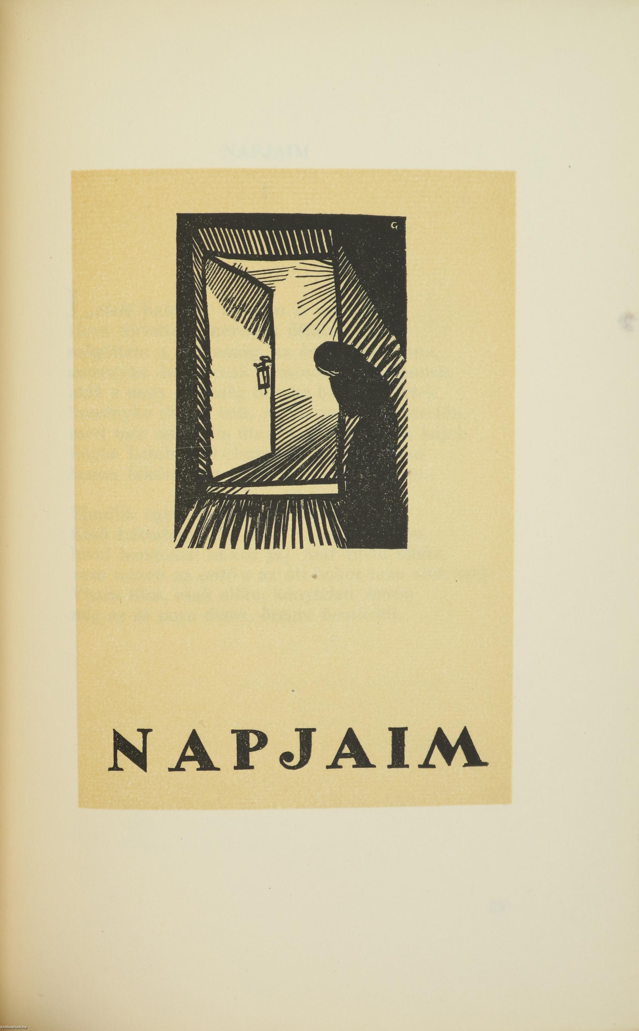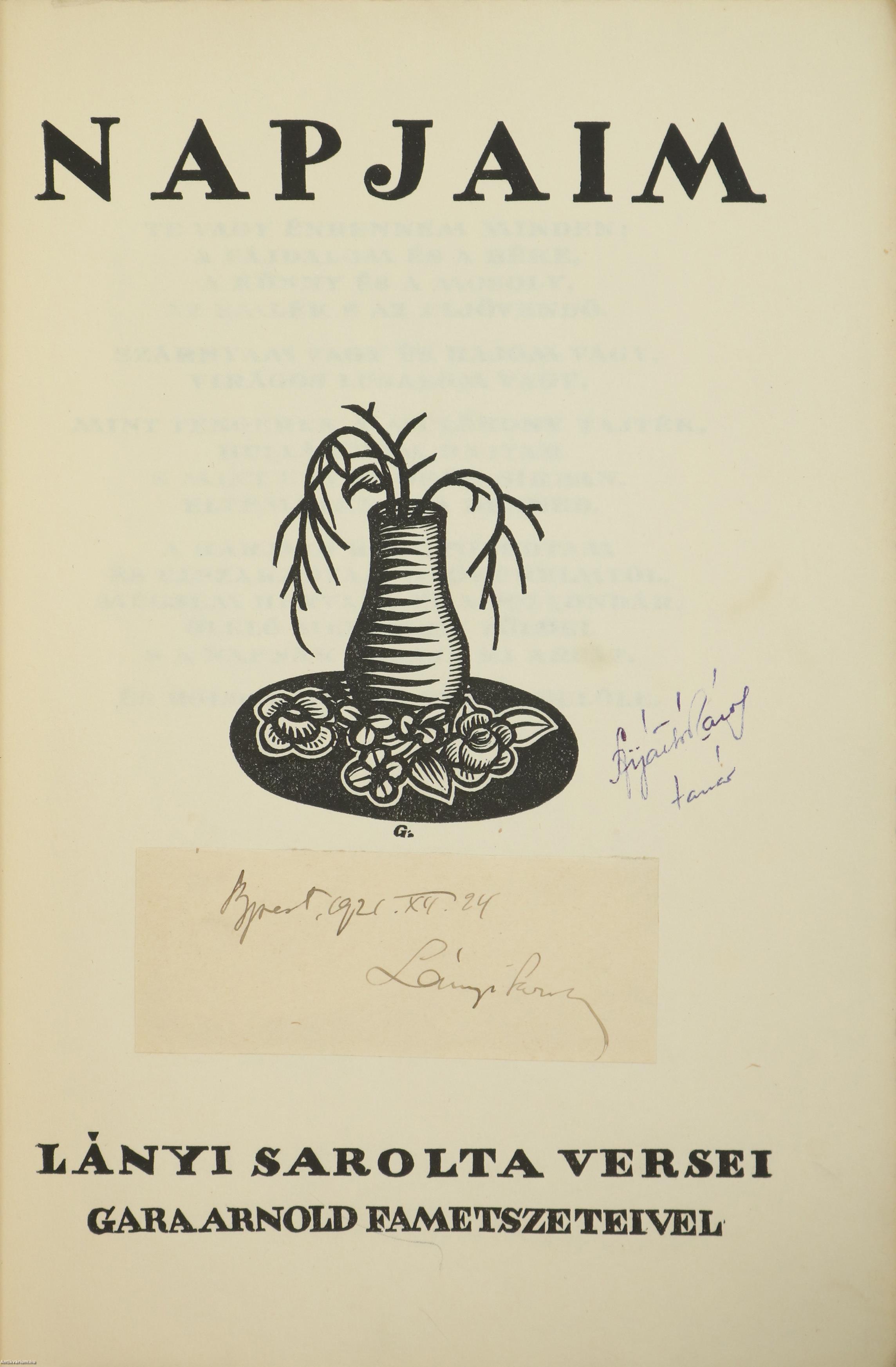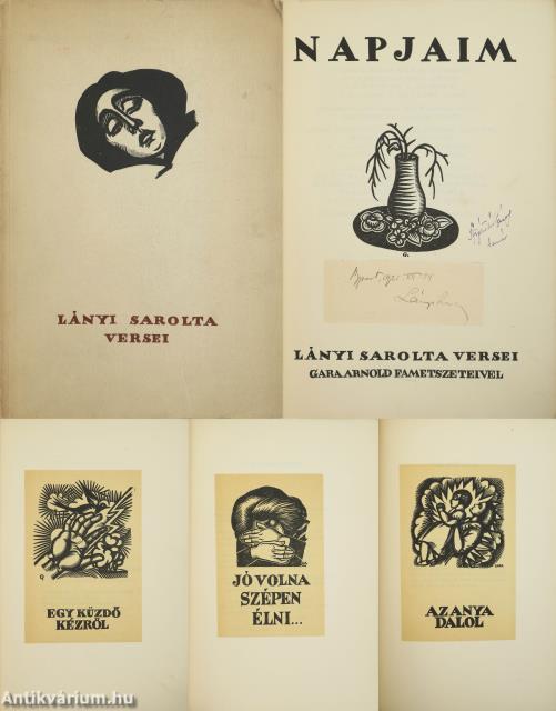Szerző aláírásával ellátott példány. Első, számozott, bibliofil kiadás. Napjaim. Lányi Sarolta versei Gara Arnold fametszeteivel.