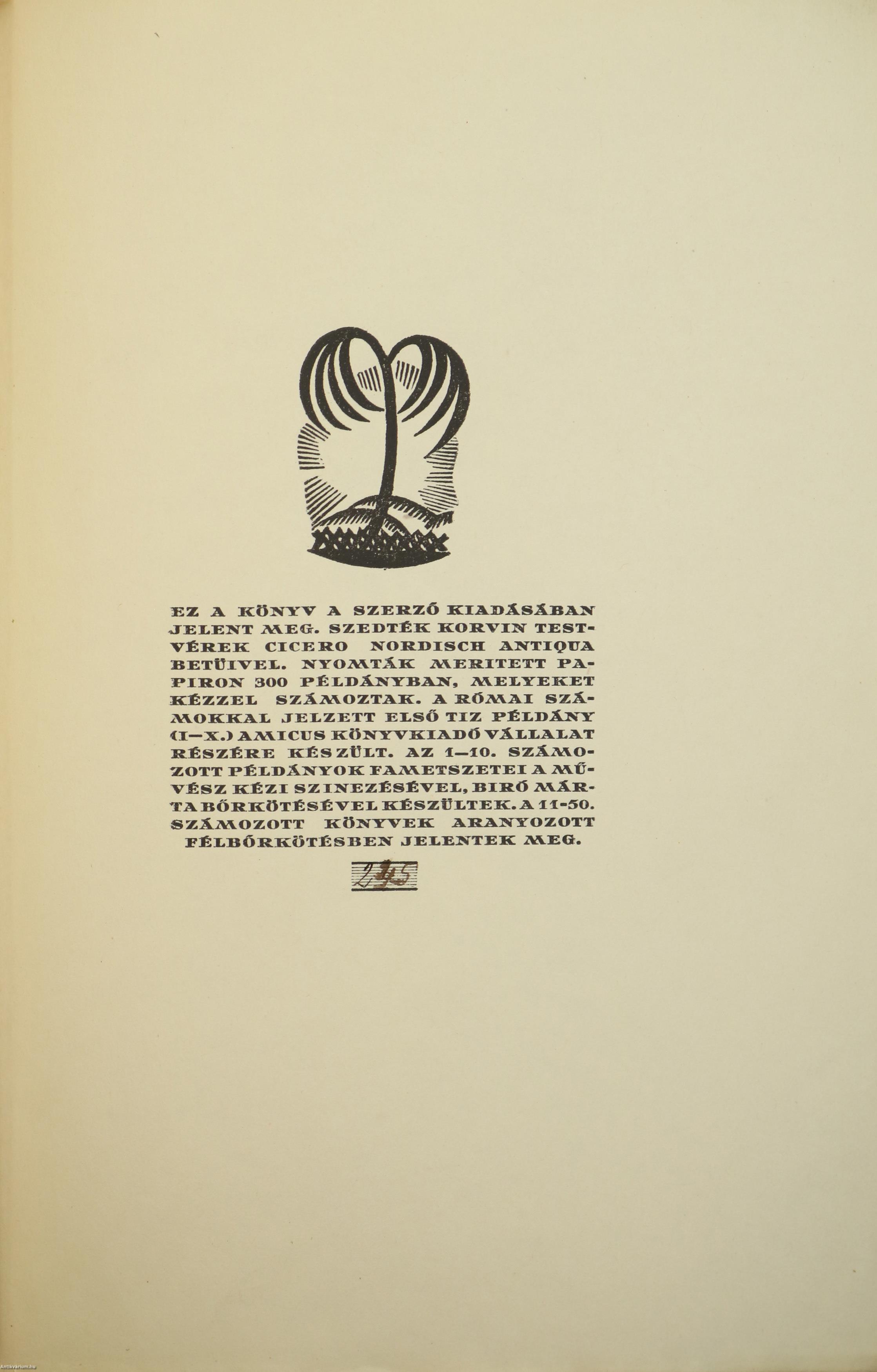 "Ez a könyv a szerző kiadásában jelent meg. Szedték Korvin Testvérek Cicero Nordisch Antiqua betűivel. Nyomták merített papíron 300 példányban, melyeket kézzel számoztak. A római számokkal jelzett első tíz példány (I-X.) Amicus Könyvkiadó Vállalat részére készült. Az 1-10. számozott példányok fametszetei a művész kézi színezésével, Biró Márta bőrkötésével készültek. A 11-50. számozott könyvek aranyozott félbőrkötésben jelentek meg." Jelen példány száma: 245.