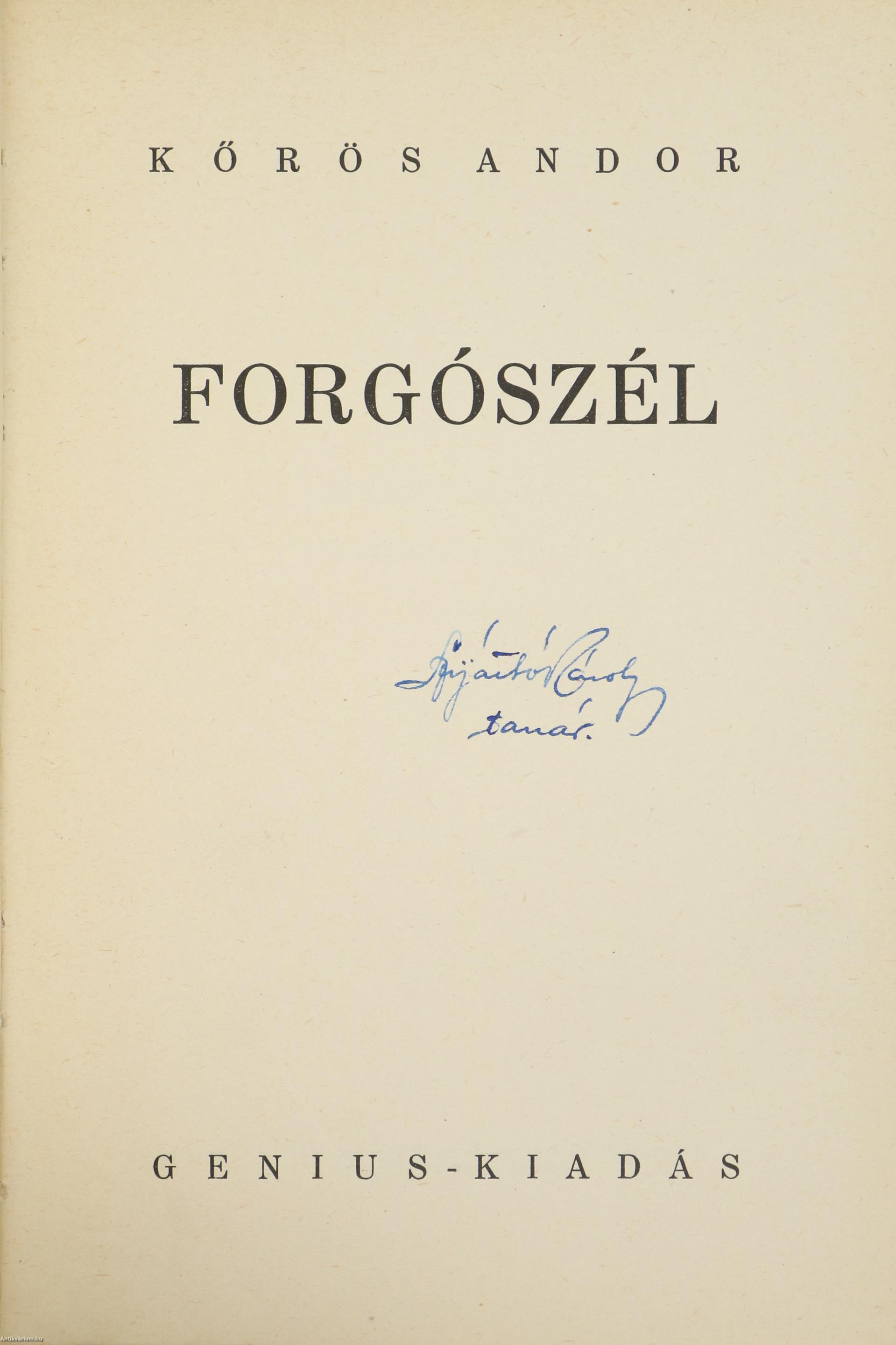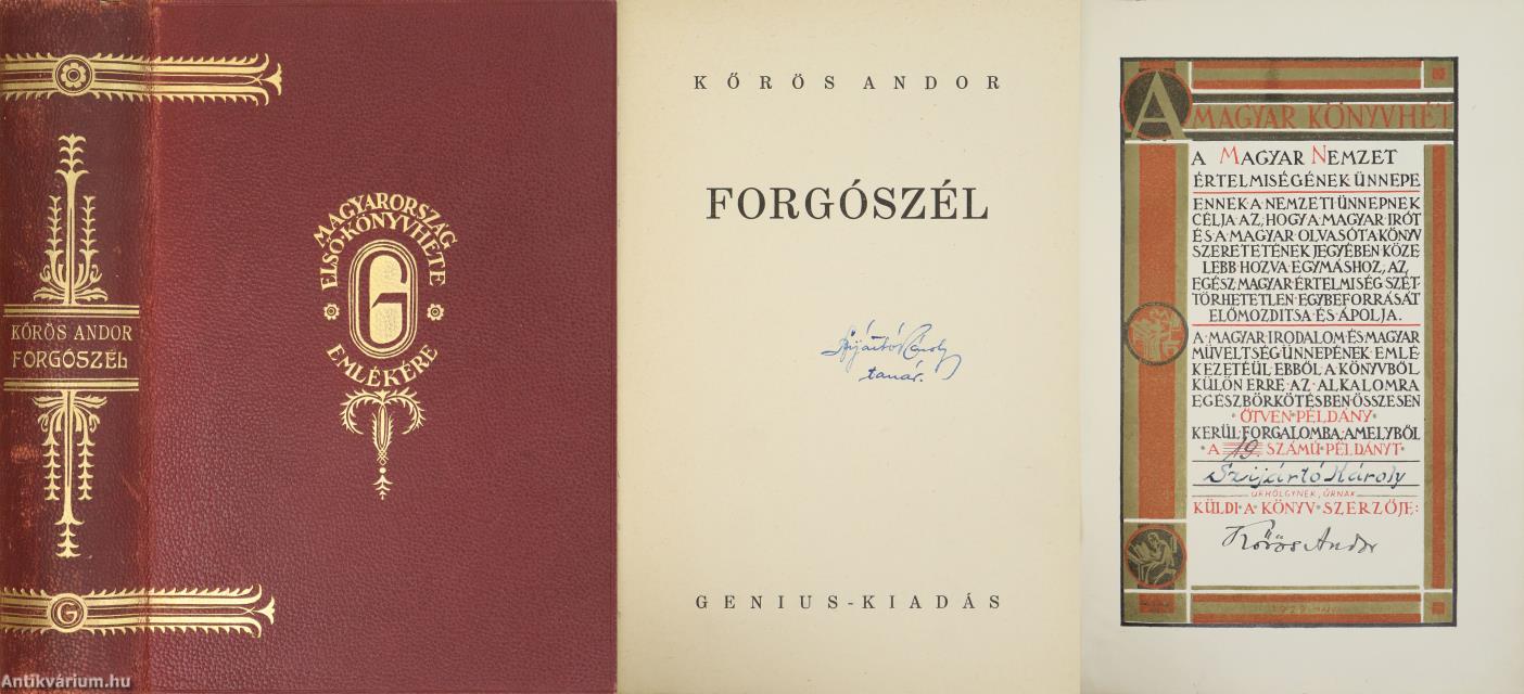 Szerző által aláírt példány. Számozott, bibliofil kiadás. Forgószél. Írta: Kőrös Andor.