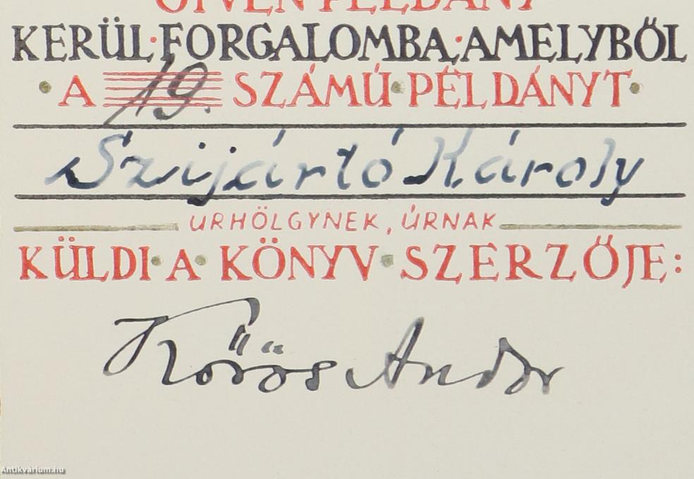 "A Magyar Nemzet értelmiségének ünnepe. Ennek a nemzeti ünnepnek célja az, hogy a magyar irót és a magyar olvasót a könyv szeretetének jegyében közelebb hozva egymáshoz, az egész magyar értelmiség széttörhetetlen egybeforrását előmozdítsa és ápolja. A magyar irodalom és magyar müveltség ünnepének emlékezetéül ebből a könyvből külön erre az alkalomra egészbörkötésben összesen ötven példány kerül forgalomba, amelyből..." Ez a 19. kézzel számozott példány.