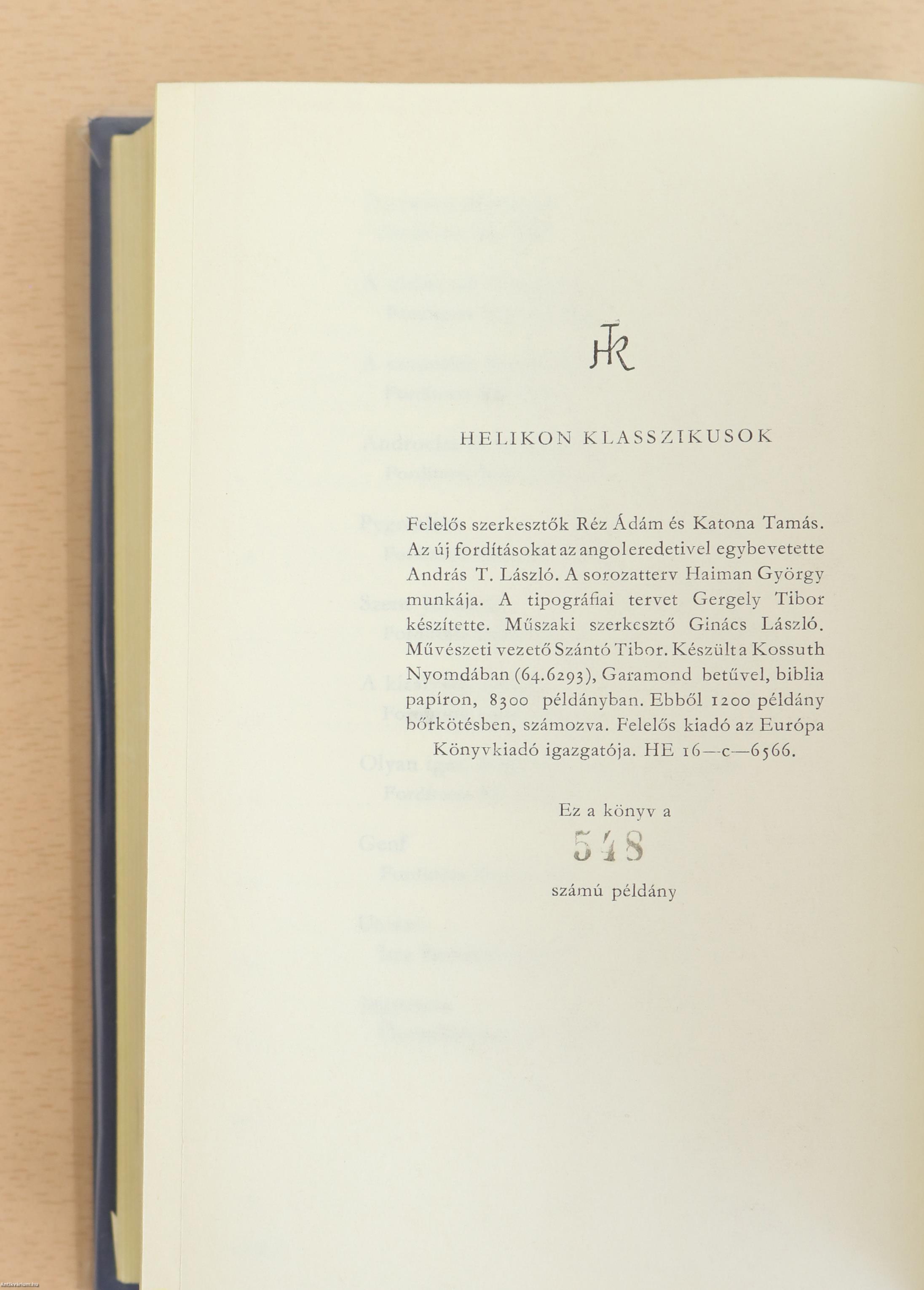 Eredeti műanyag védőborítóval és Helikon könyvjelzővel. Készült a Kossuth Nyomdában, Garamond betűvel, biblia papíron, 8300 példányban. Ebből 1200 példány bőrkötésben, számozva.