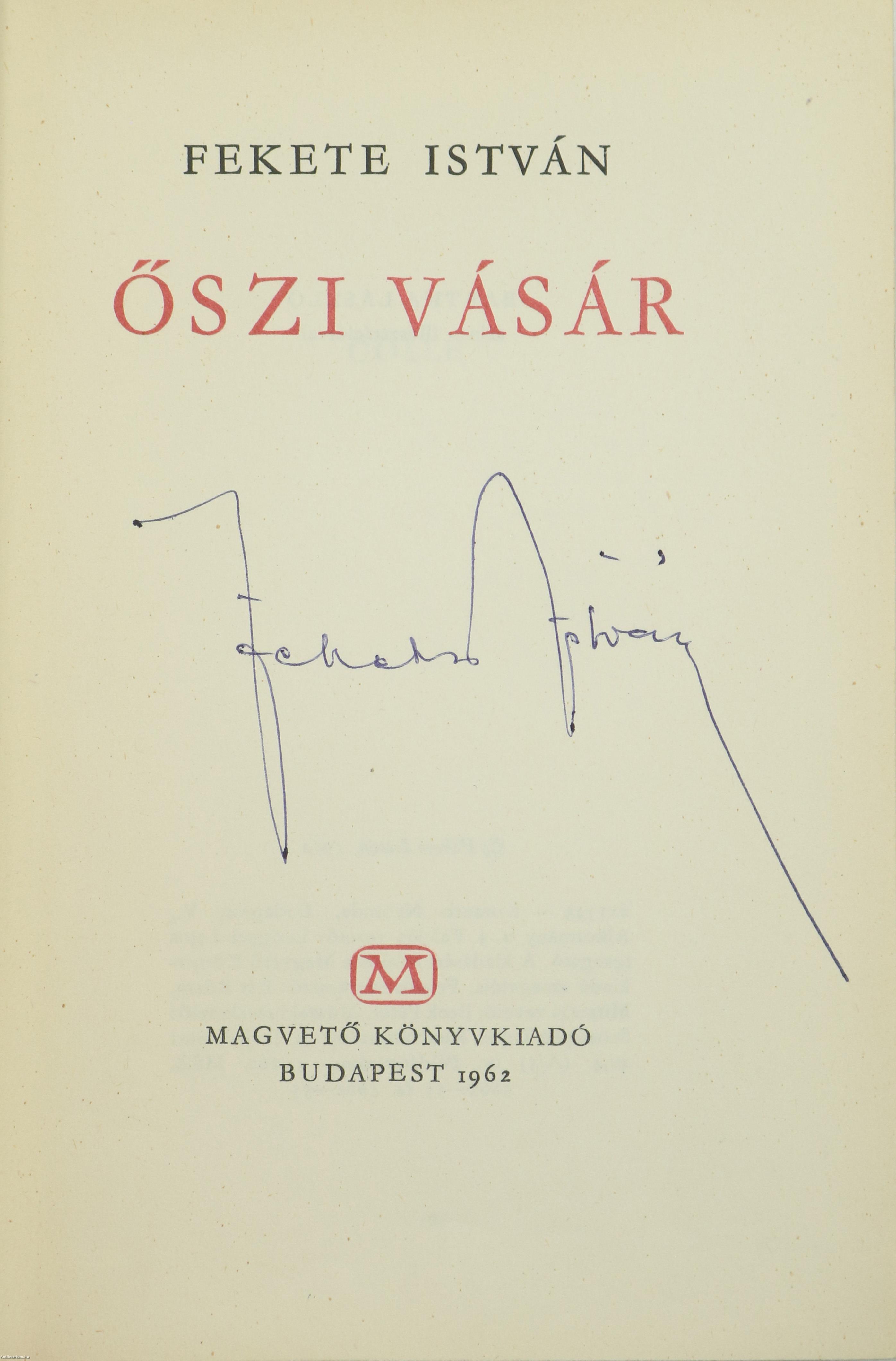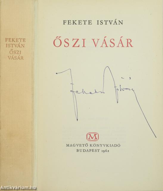 Szerző által aláírt példány. Első kiadás. Őszi vásár. Írta: Fekete István. A címlapon a szerző, Fekete István tollal írt, jól olvasható aláírása látható. Bartha László színes szöveg közti rajzaival illusztrált, valamint részletes tartalomjegyzékkel kiegészített kiadás. Nyomtatta a Kossuth Nyomda, Budapesten. Kiadói félvászon kötésben lévő példány; színes, mintás címfedéllel és hátlappal; feliratos könyvgerinccel; színes, mintás kiadói előzéklapokkal; hiánytalan állapotban. "Az Őszi vásár első ciklusa a Gölle gyöngyfűzére - negyvenegy rövid elbeszélés -, amely a magyar novellairodalom legjobb hagyományainak jegyében fogant, s Móra Ferenc varázsos írásainak nyomdokán haladva vall a szív kincseiről - a szeretetről, a barátságról (Aprószentek; Kalapky bácsi; Jancsi; Karácsonykor; Valódi). Az Erdő-mező közel egy tucat írásában élni, lélegezni kezd a természet, s az erdőknek, réteknek, az évszakoknak, s az állatoknak a párbeszéde érvényes üzenetet tolmácsolhat az olvasó számára." - írja könyvismertető soraiban Legeza Ilona. A szerző, Fekete István (Gölle, 1900. január 25. – Budapest, 1970. június 23.) író, számos ifjúsági könyv és állattörténet szerzője. Közeli barátjával, Csathó Kálmánnal együtt a magyar „erdész-vadász irodalom” egyik legismertebb művelője. Jókai mellett minden idők egyik legolvasottabb magyar írója. Műveit az ember-, állat- és természetszeretet, valamint az egyetemes humánum uralja.