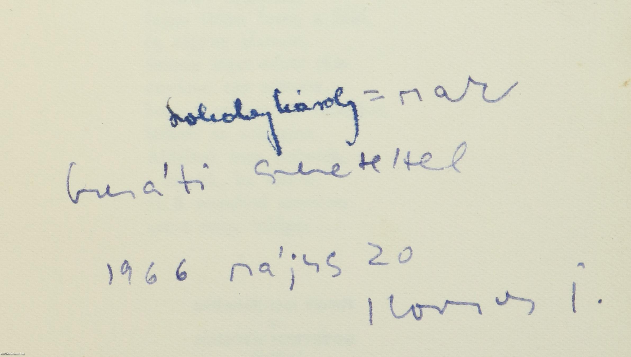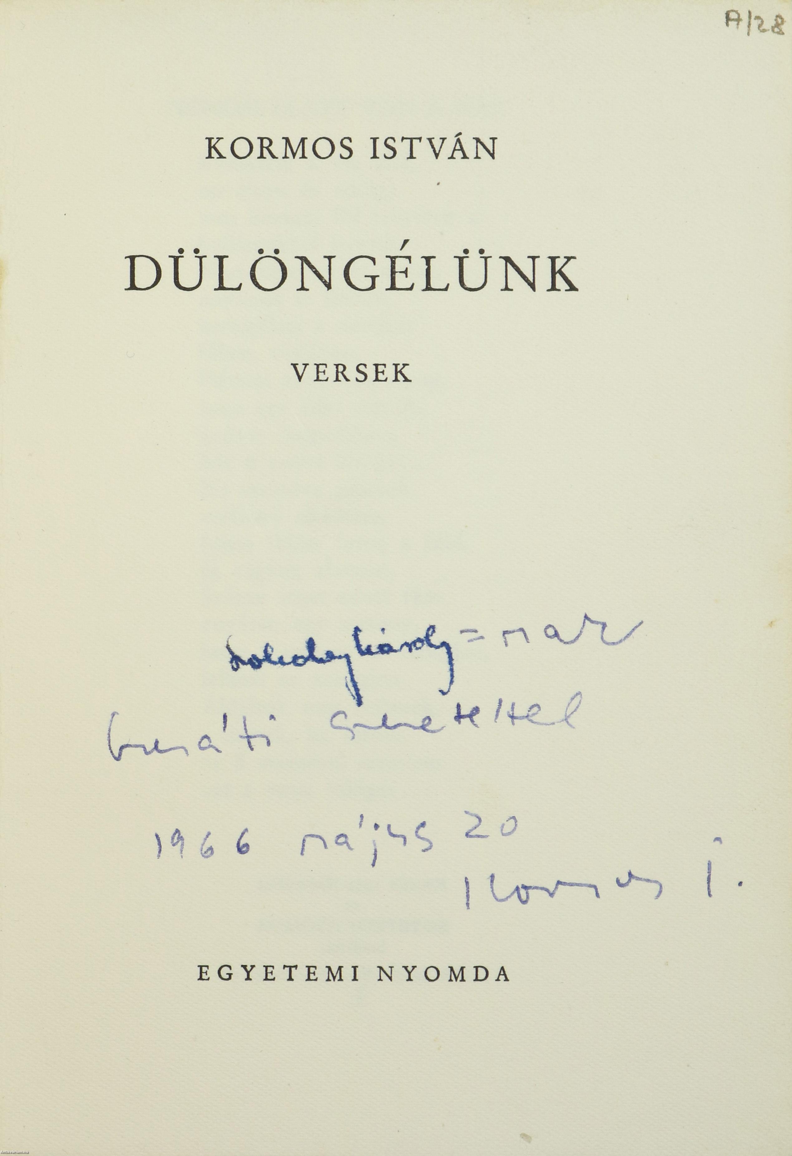 A címlapon a szerző, Kormos István tollal írt, névre szóló dedikációja olvasható: "Szokolay Károly=nak baráti szeretettel 1966 május 20 Kormos I."