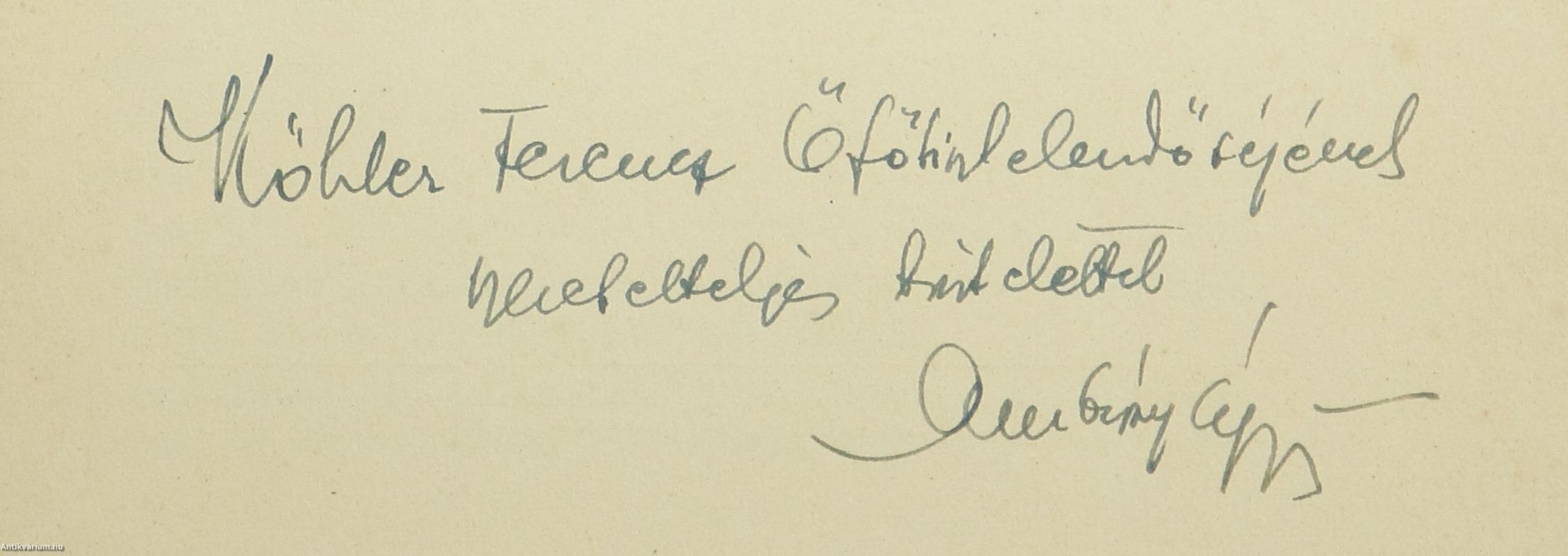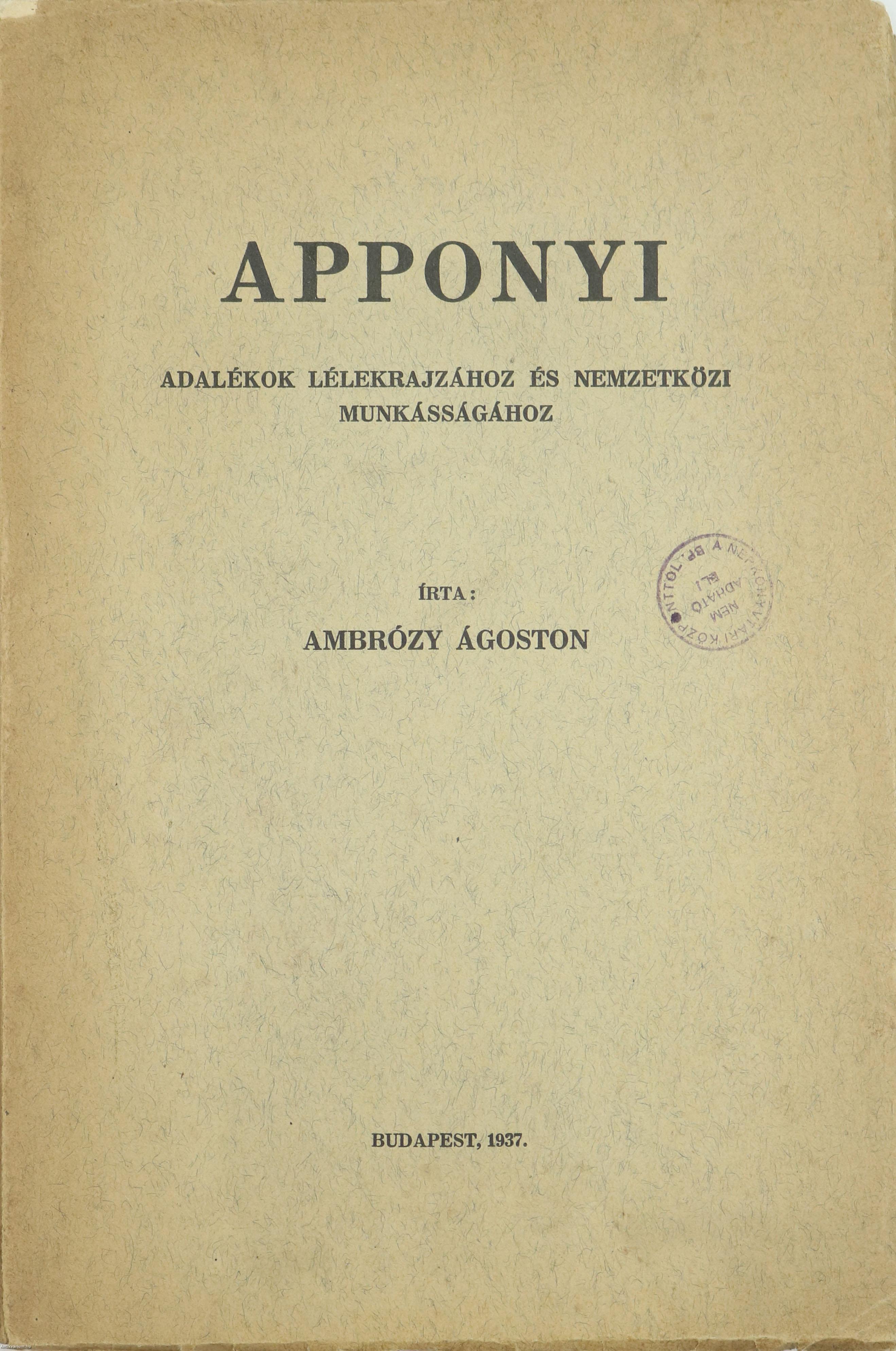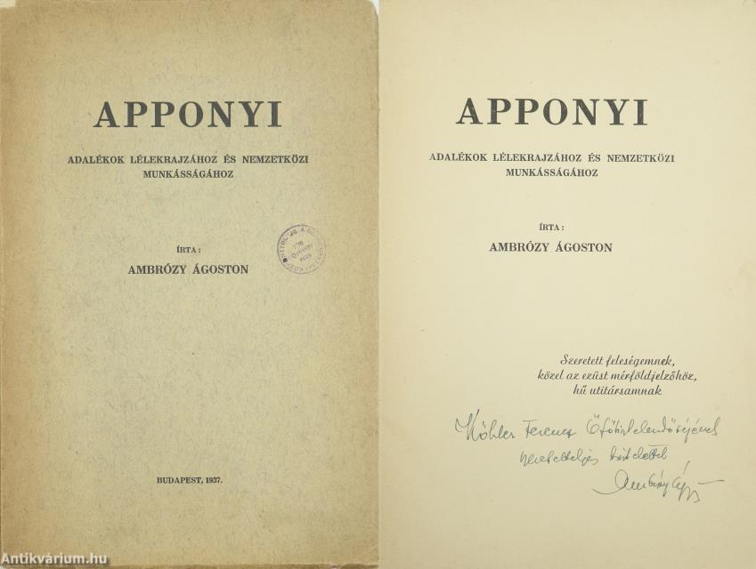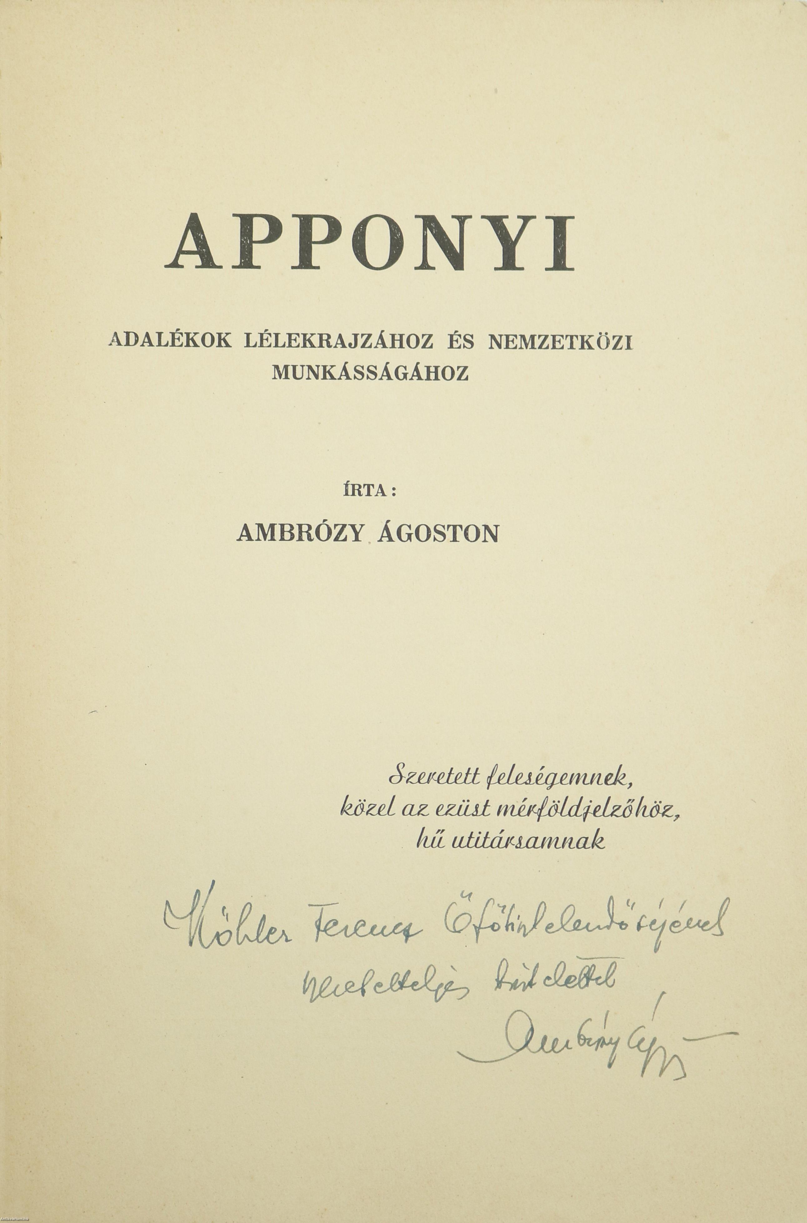 Szerző által dedikált példány. Első kiadás. Apponyi. Adalékok lélekrajzához és nemzetközi munkásságához. Írta: Ambrózy Ágoston. A címlapon a szerző, Ambrózy Ágoston tollal írt, névre szóló dedikációja olvasható: "Köhler Ferencz Őfőtisztelendőségének szeretetteljes tisztelettel Ambrózy Ágoston." A dedikáció címzettje Köhler Ferenc (1886-1962) római katolikus pap. Esztergomban, majd a bécsi Pazmaneumban tanult. 1909-ben szentelték pappá. A fővárosi Actio Catholica karitász szakosztályának igazgatója, valamint a Szent Vince Egyesületek országos igazgatója volt. 1944-ben a budapesti gettóban istentiszteletet tartott a római katolikus vallású üldözöttek számára, valamint Hegyeshalomból pápai menlevelekkel számos deportáltat sikerült visszahoznia és megmentenie. Előszóval és tartalomjegyzékkel kiegészített kötet. A címfedélen tulajdonosi bélyegzés látható. Nyomtatta a „Grafika” Nyomdavállalat Újpesten. Kiadói varrott papírkötésben lévő példány; feliratos címfedéllel; feliratozatlan, sérült könyvgerinccel; hátlapon a nyomda feltüntetésével; az egyik oldalon színes ceruzás jelöléssel; hiánytalan állapotban. A szerző Ambrózy Ágoston (1879–1968) ügyvéd, törvényszéki bíró. Jogi tanulmányait Budapesten, Grácban és Genfben végezte, majd 1907-től Sátoraljaújhelyen praktizált ügyvédként. 1924 és 1940 között Budapesten törvényszéki, később ítélőtáblai bíróként dolgozott, nyugdíjazása után pedig a Pestvidéki Törvényszék Vegyes Döntőbíróságán és a Teleki Pál Tudományos Intézetben működött.