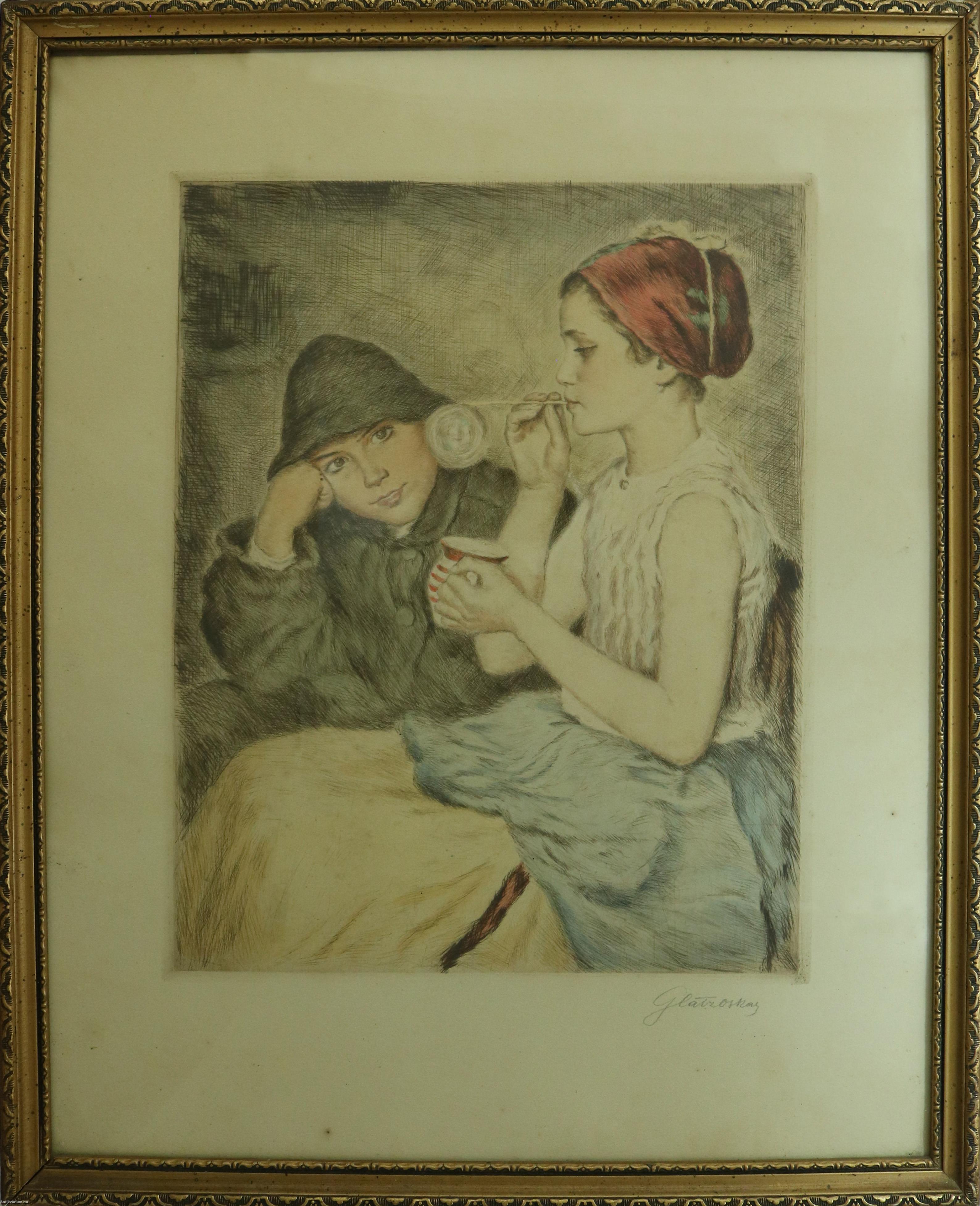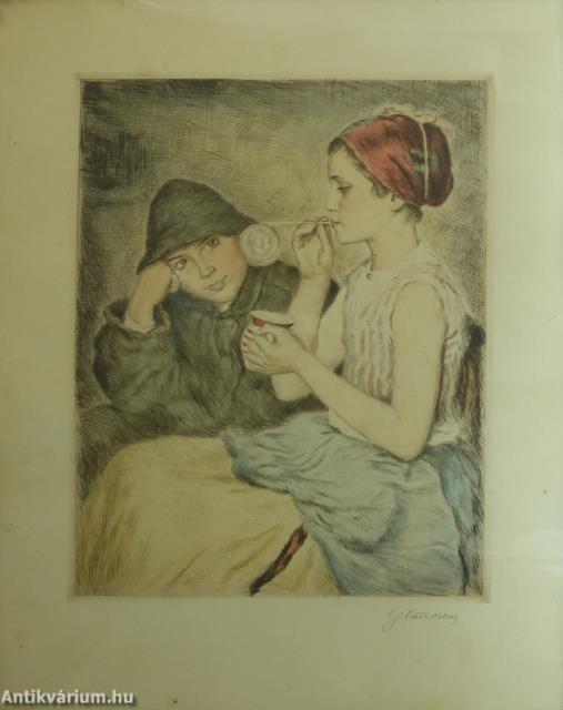 Jelzés jobbra lent (ceruzával): Glatz Oszkár, akvarellel színezett rézkarc.