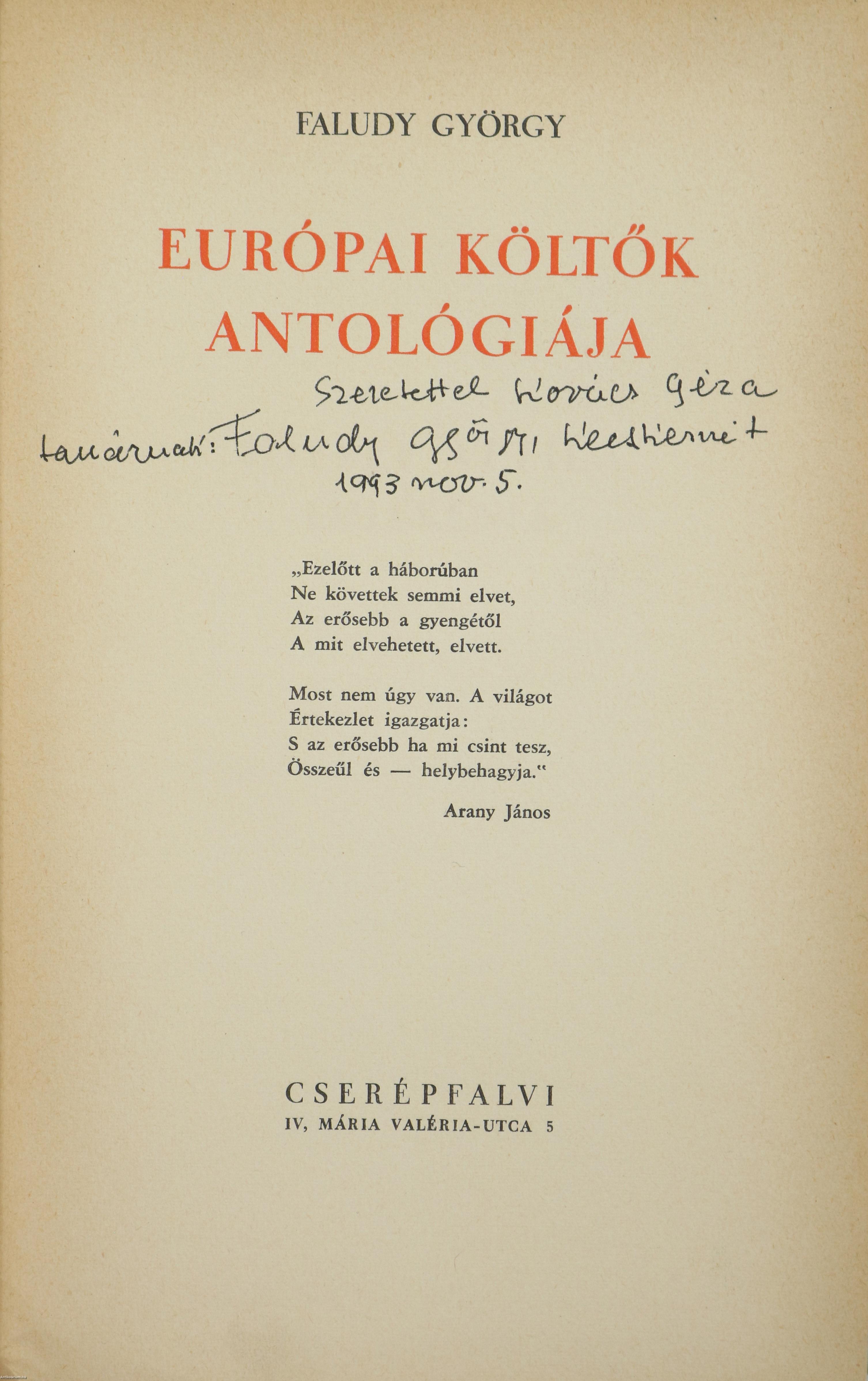 Szerkesztő által dedikált példány. Első kiadás. Európai költők antológiája. Szerkesztette: Faludy György.