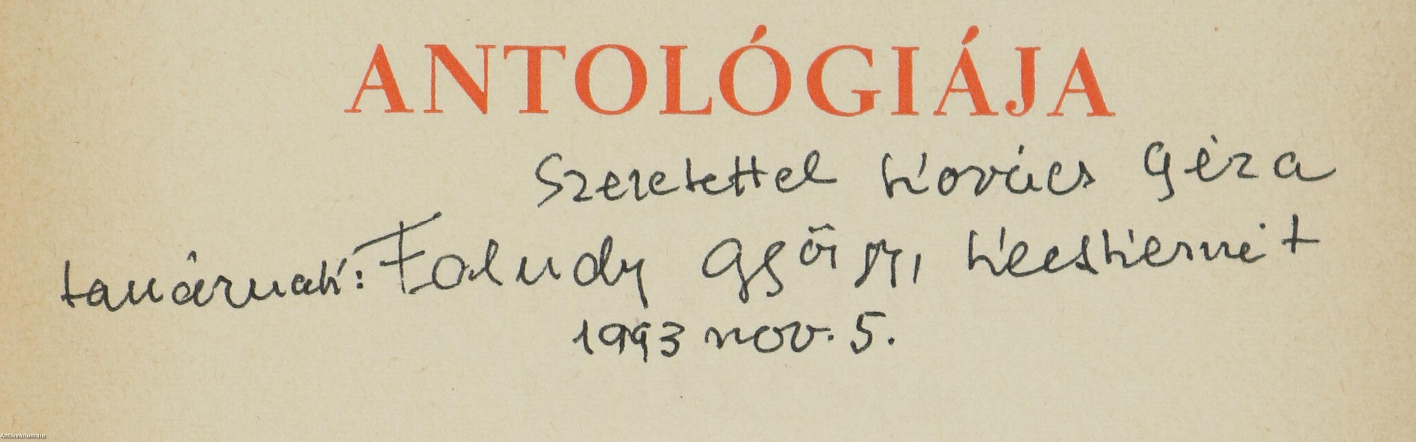 A címlapon a szerkesztő, Faludy György tollal írt, névre szóló dedikációja olvasható: "Szeretettel K. G. tanárnak: Faludy György, Kecskemét 1993 nov. 5."