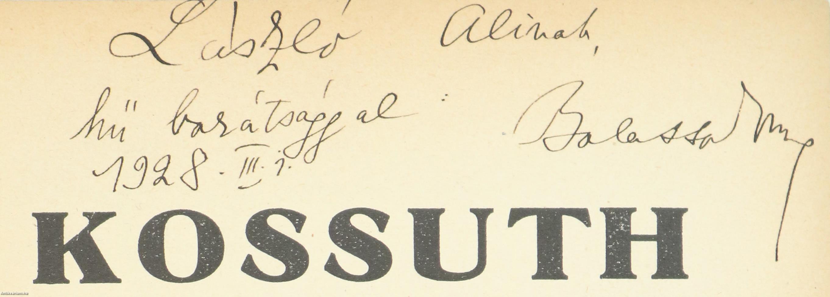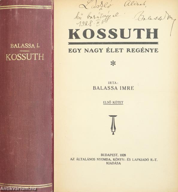 Szerző által dedikált példány.Első kiadás. Kossuth I-II. (két kötet egy könyvben) Egy nagy élet regénye. Írta: Balassa Imre. Az I. kötet címlapján a szerző, Balassa Imre tollal írt, névre szóló dedikációja olvasható: "L. A.-nak hű barátsággal: Balassa Imre 1928. III. 1." Szöveg közti, fekete-fehér rajzokkal illusztrált kötet. Nyomtatta az Általános Nyomda R.-T. Budapesten. Könyvkötői félvászon kötésben lévő példány; feliratozatlan, mintás címfedéllel és hátlappal; aranyozott feliratozású könyvgerinccel; mintázott felső lapélekkel; hiánytalan állapotban. A szerző Balassa Imre (Szeged, 1886. november 25. – Nógrád, 1974. február 4.) író, újságíró, dramaturg, zenekritikus. Az Országos Magyar Királyi Színművészeti Akadémián szerzett rendezői és színész oklevelet. Olyan lapok munkatársaként dolgozott, mint az Újság, a Nemzeti Újság, a Pesti Hírlap, az Új Nemzedék és a Reggel. Nevéhez fűződik az Esti Élet megalapítása, mely az első magyar művészeti napilap volt. A II. világháború után az egyik legnagyobb hatású zenei kommentátornak számított. 1949-től az Operaház sajtófőnökeként és dramaturgjaként tevékenykedett. 1952 és 1972 között rendszeresen ismertetett hangversenyeket, valamint mikrobarázdás hanglemezbemutatókat tartott. Ezenkívül a Magyar Írók Egyesületének főtitkára volt, illetve a Lafontaine-társaság és a Pen Club kritikus-szekciójának alelnöki tisztségét is betöltötte.