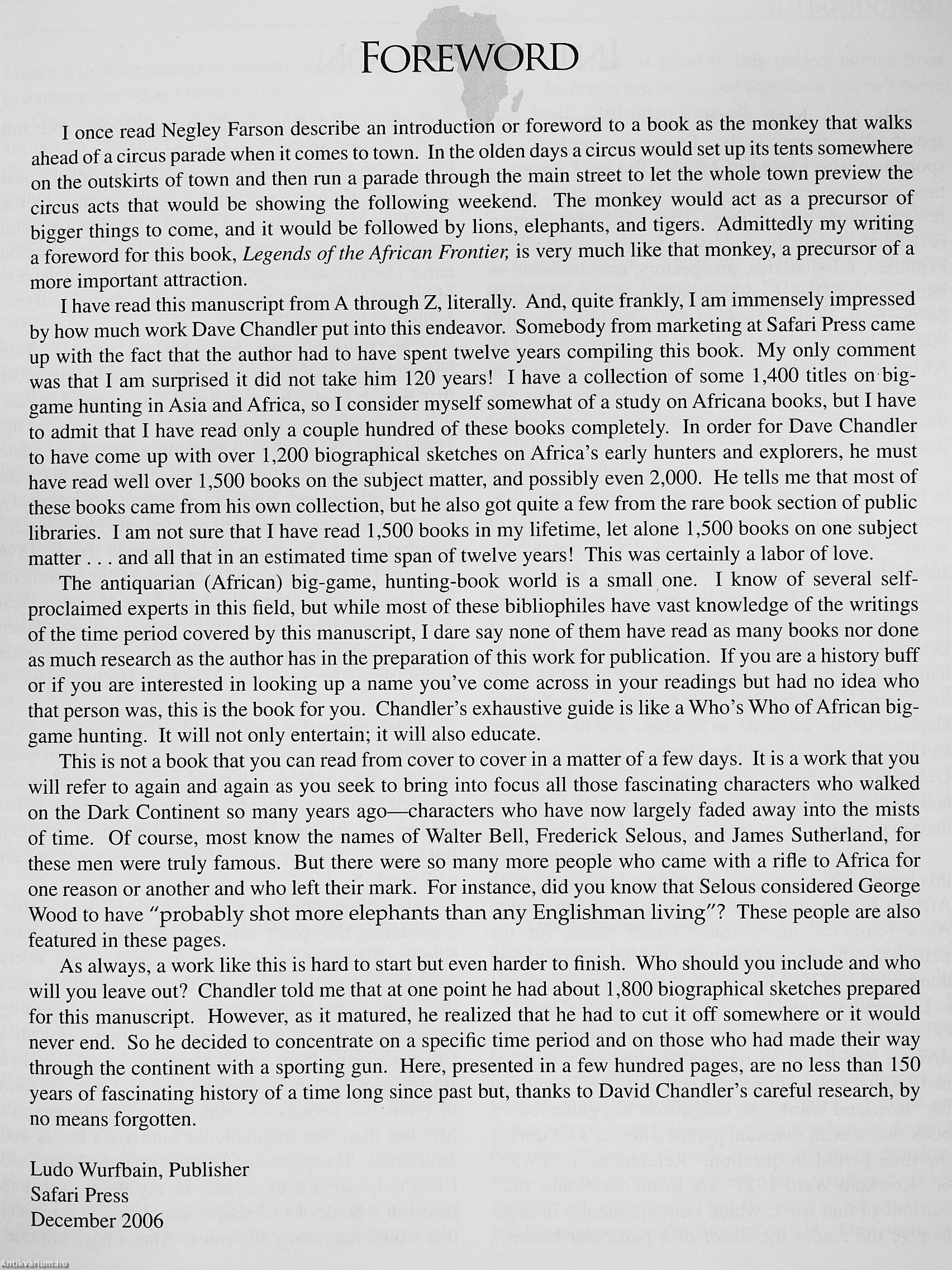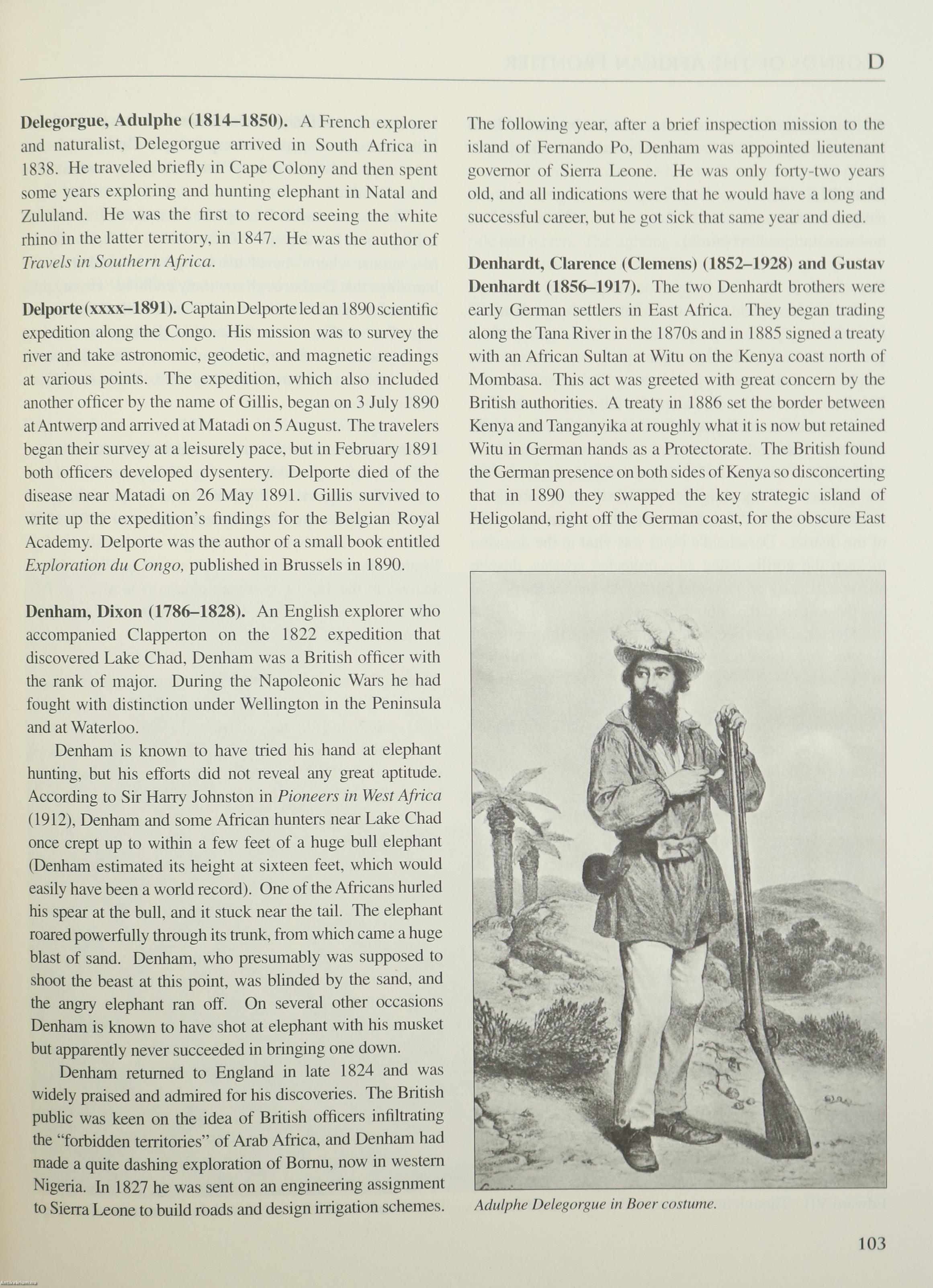 David Chandler tizenkét év munkájával egyedülálló lexikális kötetet állított össze Afrika korai kalandorairól, felfedezőiről, vadászairól és elefántcsont-orvvadászairól, összesen 1200 szereplő bemutatásával William Louis Abbott-tól Ernst Zwillingig. A kötet különös figyelmet fordít olyan tragikus sorsokra, mint Ota Benga története, akit Kongóban elfogtak, majd az Egyesült Államokba hurcoltak, ahol a világkiállításon és később a New York-i Bronx Állatkertben embertelen körülmények között mutattak be. A könyv részletes életrajzi vázlatokon keresztül tárja fel e személyek vadászati, irodalmi és történelmi szerepét, miközben hitelesen kezeli a forrásokban jelen lévő vitákat és ellentmondásokat.