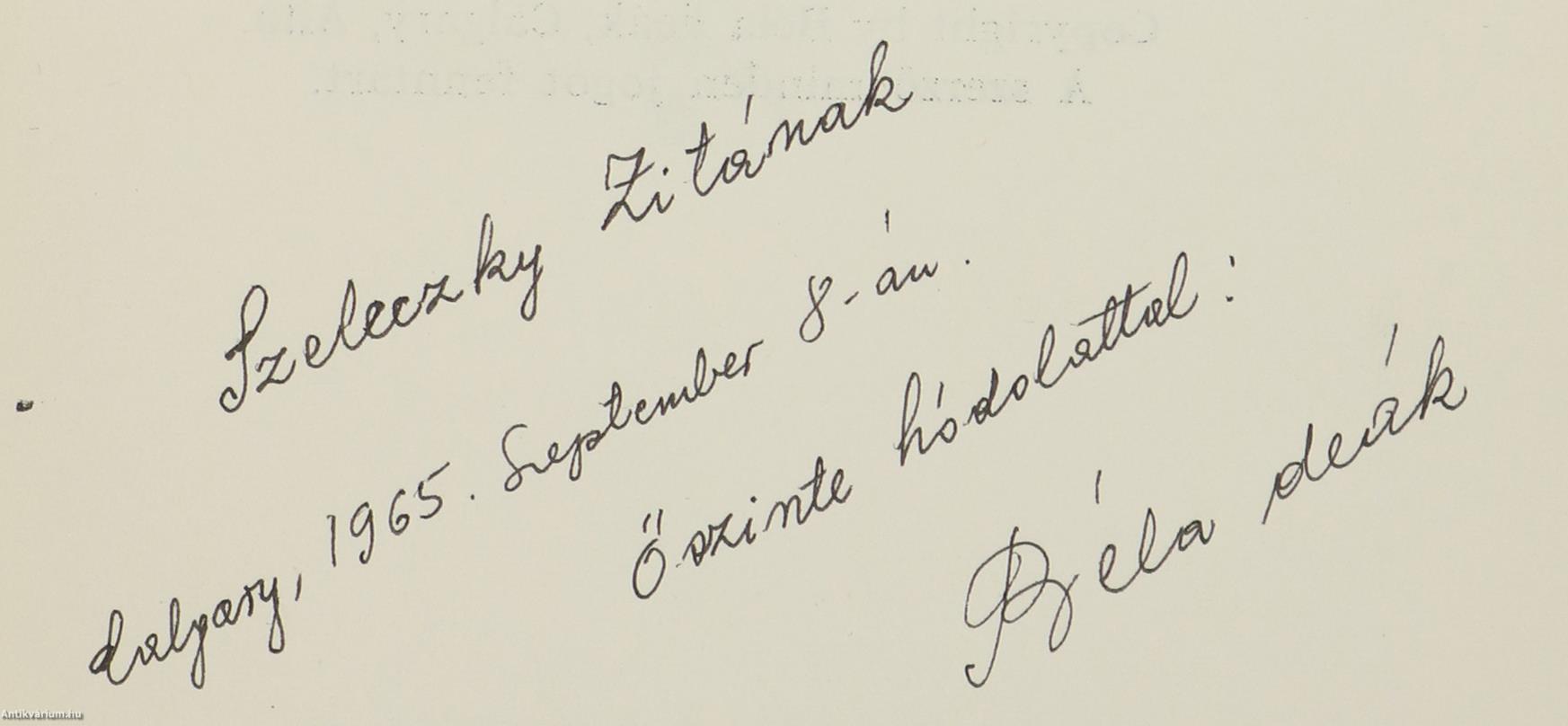 Az előlapon a szerző, Béla deák tollal írt, névre szóló dedikációja olvasható: "Szeleczky Zitának Calgary, 1965. szeptember 8-án. Őszinte hódolattal: Béla deák."
