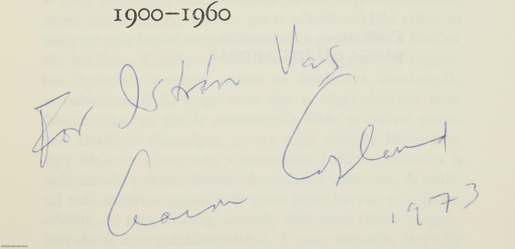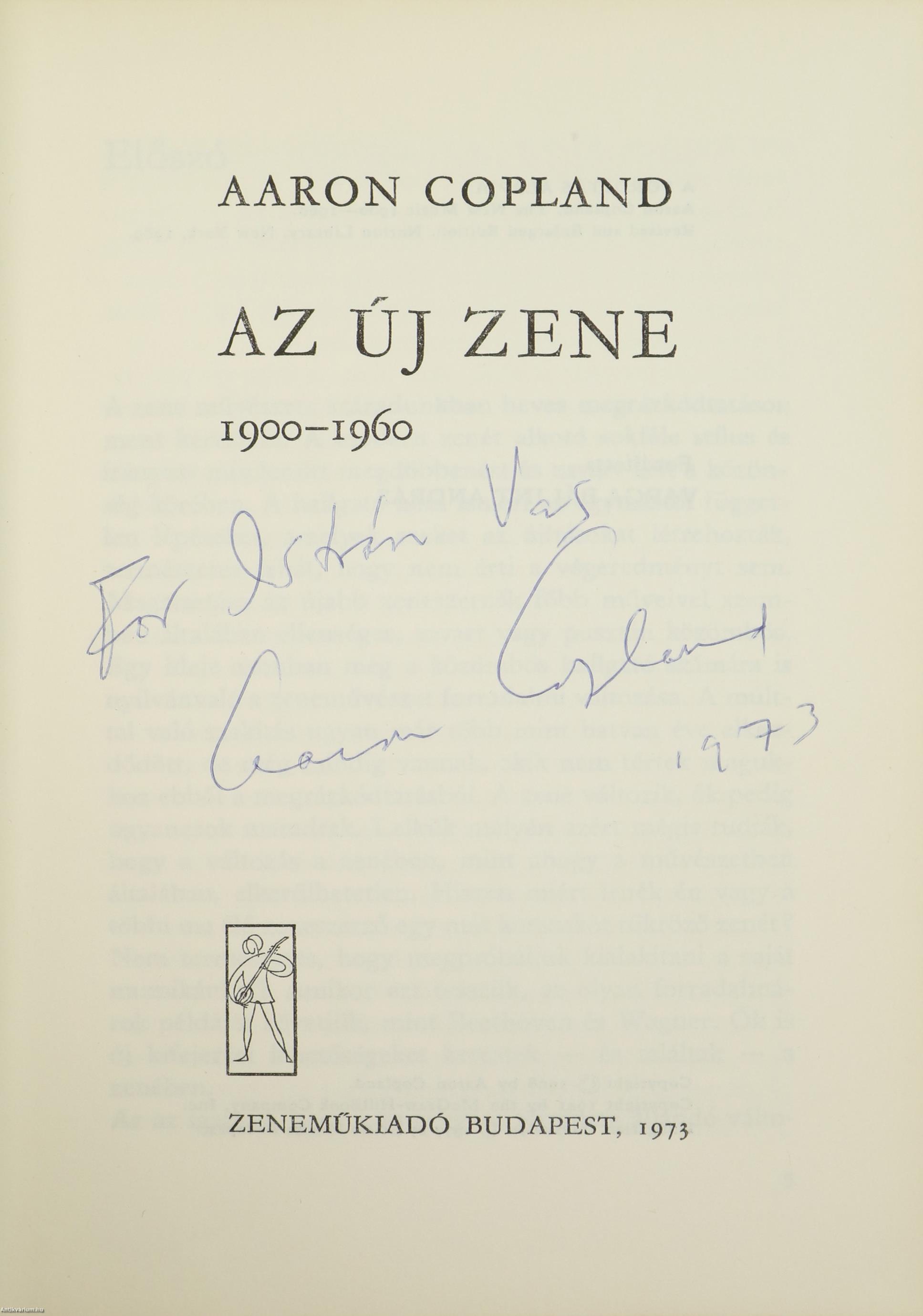 Szerző által dedikált példány. Első magyar nyelvű kiadás. Az új zene. 1900-1960. Írta: Aaron Copland. Fordította: Varga Bálint András. A címlapon a szerző, Aaron Copland tollal írt, névre szóló dedikációja olvasható: "For I. V. Aaron Copland 1973." Előszóval, név- és tárgymutatóval, illetve tartalomjegyzékkel ellátott kötet. Fedélterv: Csavlek András. Nyomtatta az Egyetemi Nyomda Budapesten. Kiadói egészvászon kötésben lévő példány, aranyozott feliratozású címfedéllel és könyvgerinccel, feliratozatlan hátlappal, hiánytalan állapotban, feliratos, színes illusztrációval ellátott, fülszöveges kiadói borítófedélben. A kötet szerzője Aaron Copland (Brooklyn, 1900. november 14. – New York, 1990. december 2.) Oscar-, Pulitzer- és Grammy-díjas amerikai zeneszerző, zenepedagógus és karmester, a 20. századi amerikai zene egyik meghatározó alakja. Korai stílusára Debussy és Stravinsky hatott, később a jazz és az amerikai népzene elemeit is beépítette műveibe. Copland életműve rendkívül sokrétű volt: szimfóniák, balettek és filmzenék egyaránt helyet kaptak benne. Olyan ikonikus alkotásai, mint a Fanfare for the Common Man és az Appalachian Spring nemcsak szakmai elismerést hoztak számára, hanem a nagyközönség körében is széles körű népszerűséget szereztek neki. Zeneszerzői tevékenysége mellett pedagógusként is működött. Tanított a New York-i Juilliard School of Music intézményében, és számos későbbi zeneszerző pályájára volt meghatározó hatással.