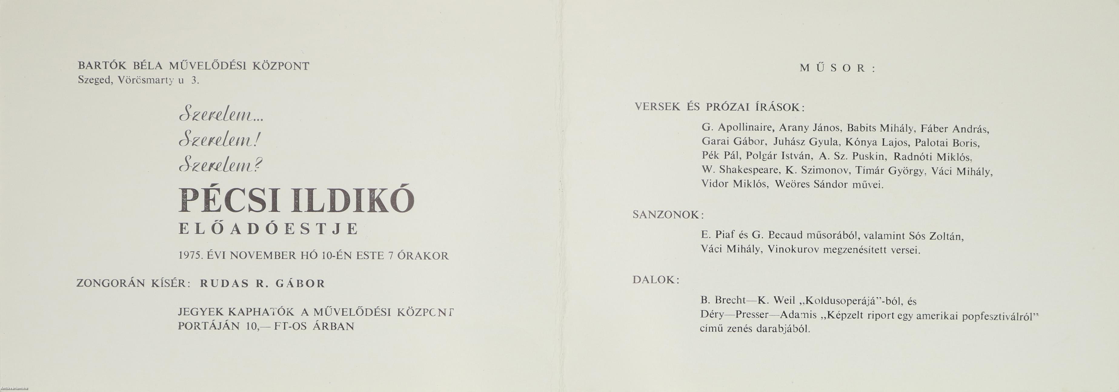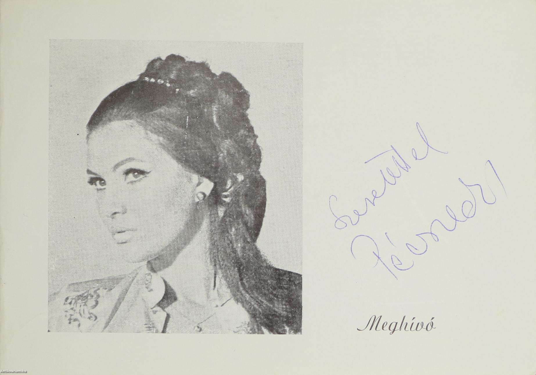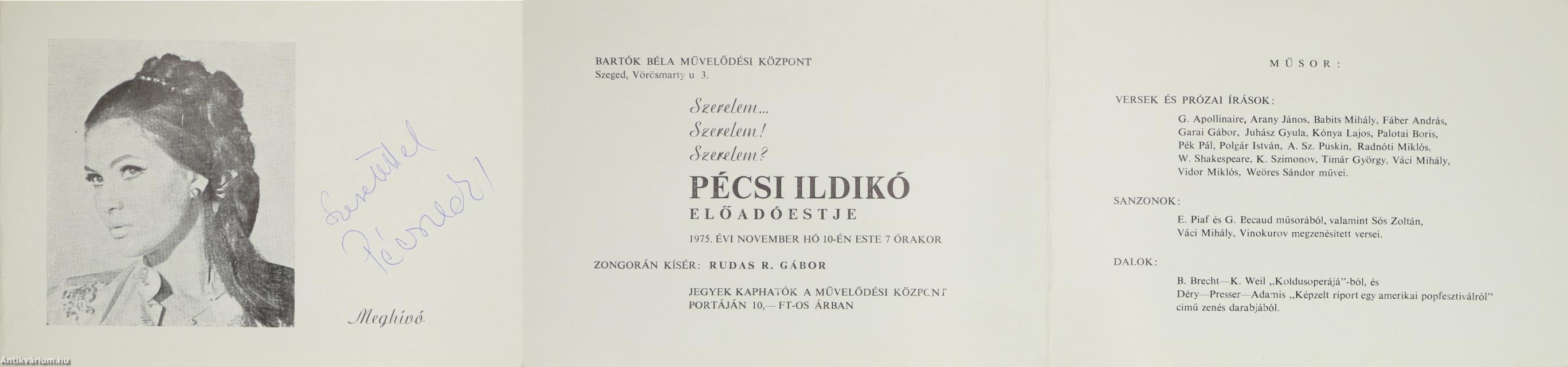 Pécsi Ildikó színművésznő által aláírt példány. Pécsi Ildikó előadóestjére szóló meghívó. A meghívó fedlapján Pécsi Ildikó tollal írt, jól olvasható aláírása látható. Jelen dokumentum a szegedi Bartók Béla Művelődési Központ meghívója az 1975. évi november hó 10-én, 19 órától megrendezett, Pécsi Ildikó színművésznő "Szerelem... Szerelem! Szerelem?" című előadóestjére. Zongorán kísér: Rudas R. Gábor. Nyomtatta a Szegedi Nyomda. Jó állapotban megőrzött, Pécsi Ildikó színművésznő fekete-fehér portréjával ellátott példány.