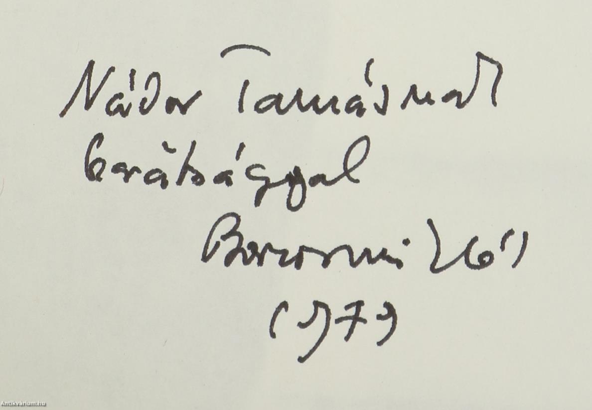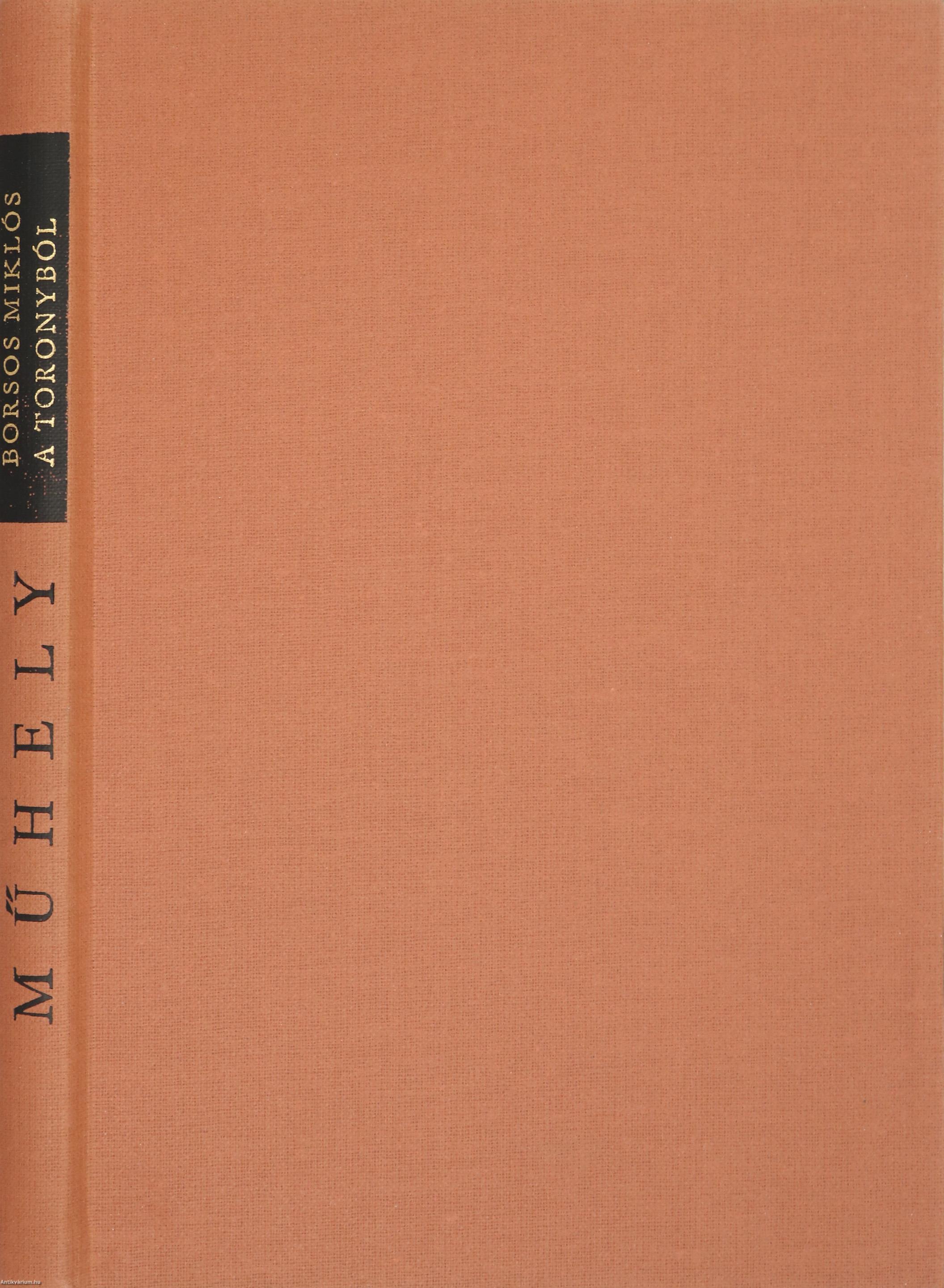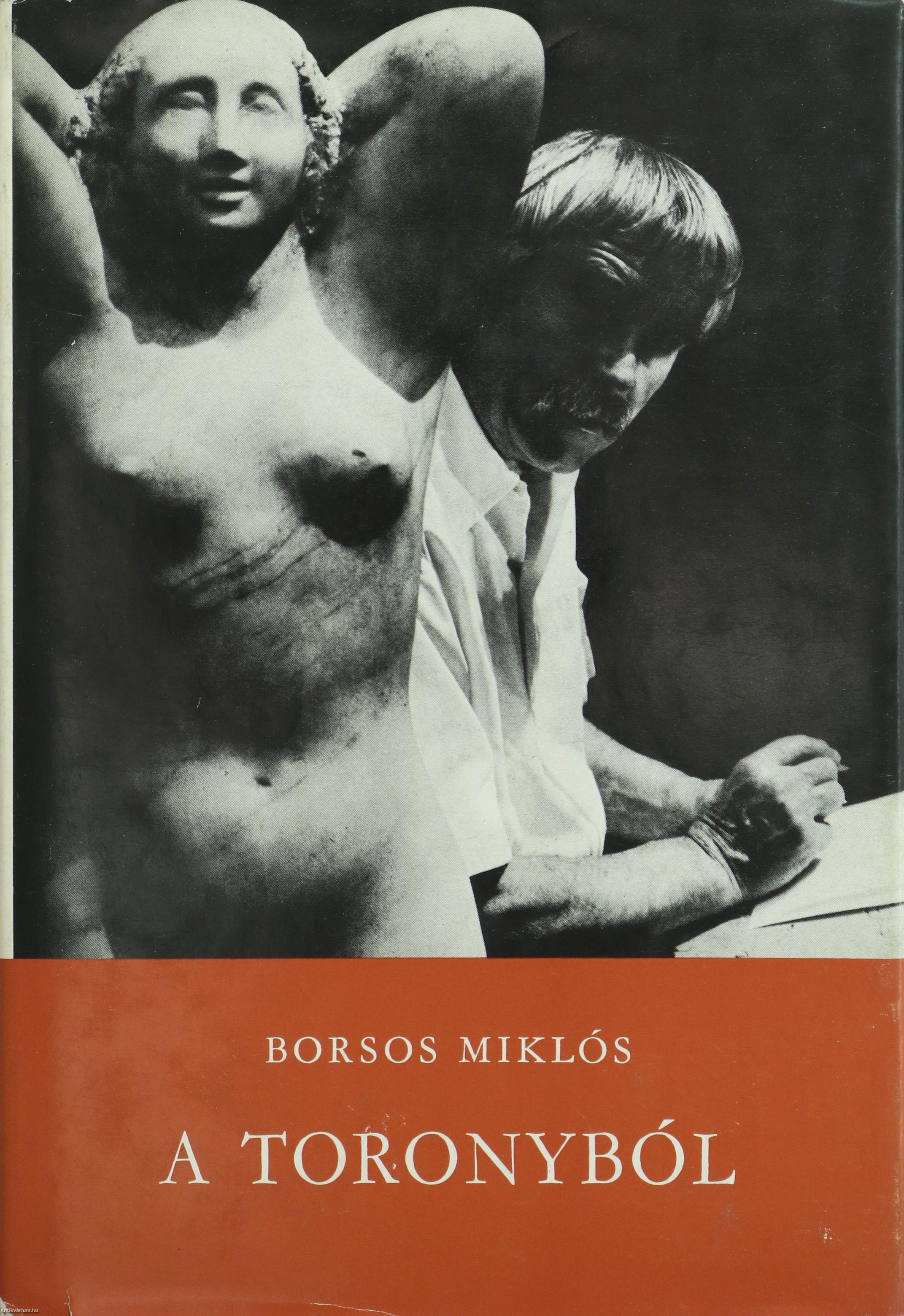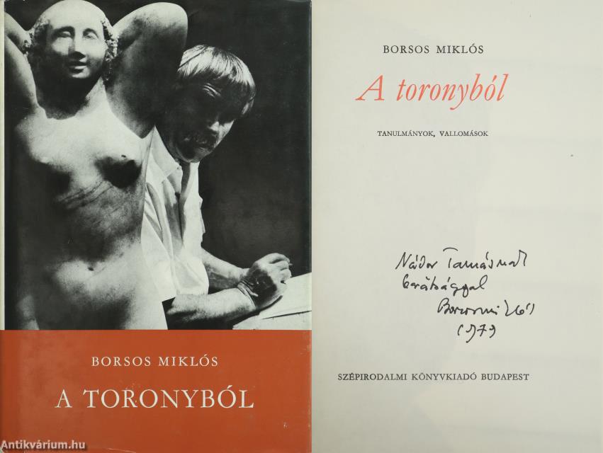 Szerző által dedikált példány. Első kiadás. A Műhely c. sorozatban (számjelzés nélkül) megjelent mű. A toronyból. Tanulmányok, vallomások. Írta: Borsos Miklós. A címlapon a szerző, Borsos Miklós tollal írt, névre szóló dedikációja olvasható: "Nádor Tamásnak barátsággal Borsos Miklós 1979." A dedikáció címzettje, Nádor Tamás (1934-2008) író, újságíró, pedagógus. 1972-től a Rádió- és Televízió Újság olvasószerkesztője, később főszerkesztője, 1991-től a Szabad Európa Rádió külső munkatársa, 1992-től pedig a Magyar Rádió vezető szerkesztője volt. Pályája kezdetén verseit az Új Hang, kritikáit az Új Írás, interjúit a Magyar Ifjúság közölte, később pedig számos folyóiratban, rádióműsorban és antológiában jelentek meg írásai. Több kötetnyi publicisztikát és több ezer interjút publikált, köztük sok százat az Új Könyvpiac hasábjain. A szerző portréjával és rajzaival illusztrált, tartalomjegyzékkel ellátott kötet. A fényképeket Gink Károly készítette. Nyomtatta a Kossuth Nyomda Budapesten. Kiadói egészvászon kötésben lévő példány, feliratozatlan címfedéllel és hátlappal, aranyozott feliratozású könyvgerinccel, tiszta belívekkel, hiánytalan, jó állapotban, feliratos, illusztrált, fülszöveges kiadói borítófedélben. A szerző, Borsos Miklós (Nagyszeben, 1906. augusztus 13. – Budapest, 1990. január 27.) szobrász, éremművész, grafikus. 1941-ben a Tamás Galériában rendezett tárlata feltűnően nagy sikert aratott. Tagja lett a Képzőművészek Új Társaságának. 1943-ban az Ernst Múzeumban szerepelt egy csoportos kiállításon Barcsay Jenővel, Dési Huber Istvánnal, Gadányi Jenővel és Pálffy Péterrel. 1946 és 1960 között az Iparművészeti Főiskola elismert tanára volt, később Tihanyra költözött és csak a művészetének élt.