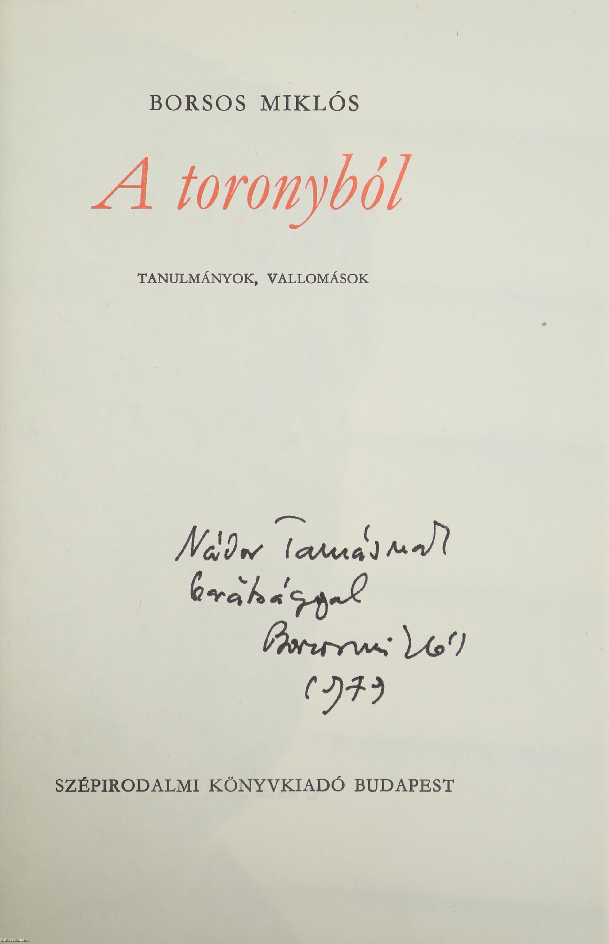 Borsos Miklós: A toronyból (Nádor Tamás író, újságírónak dedikált példány)