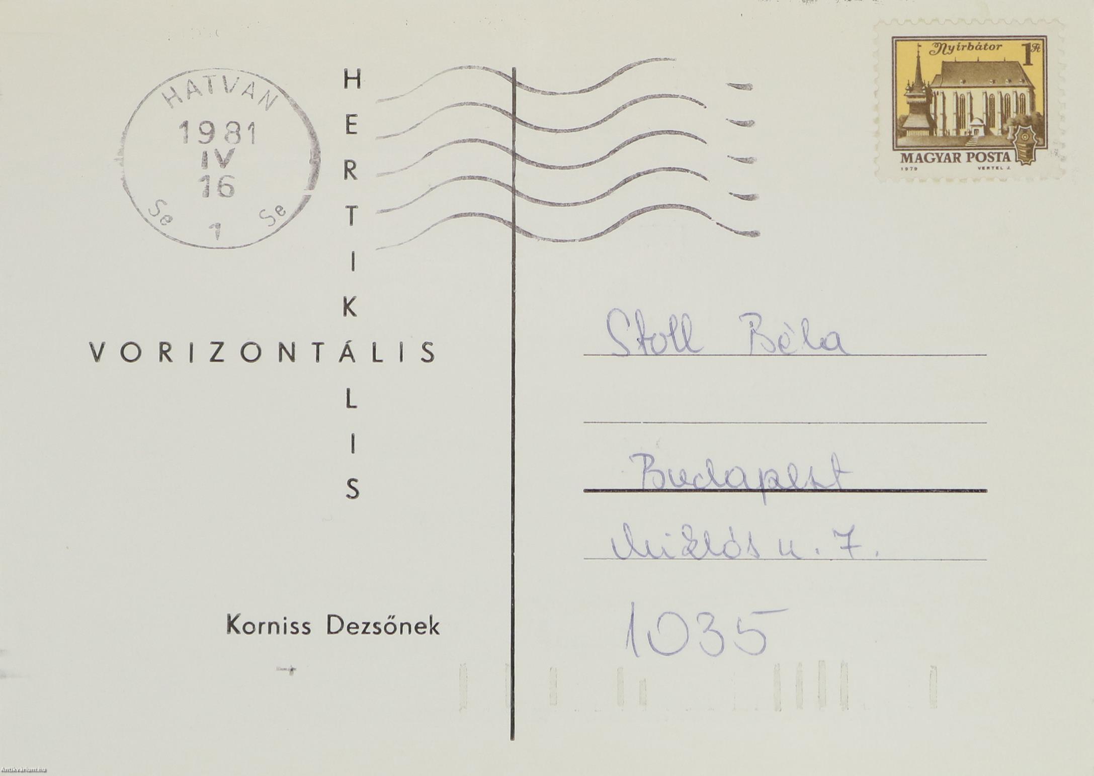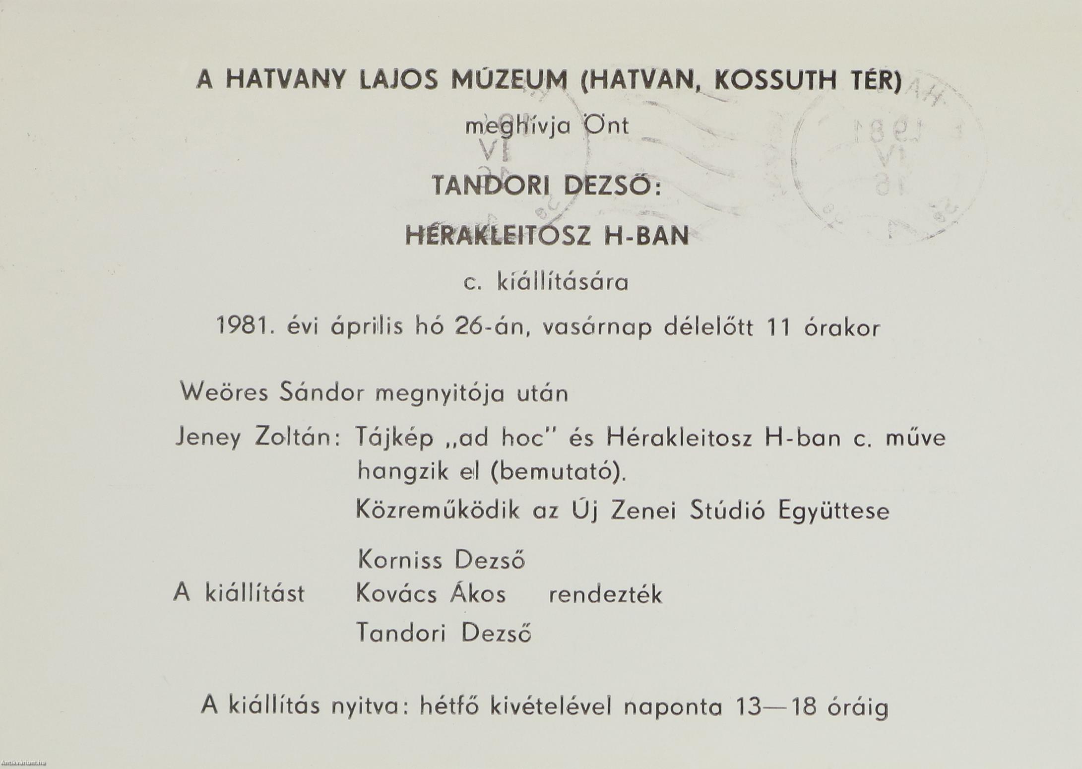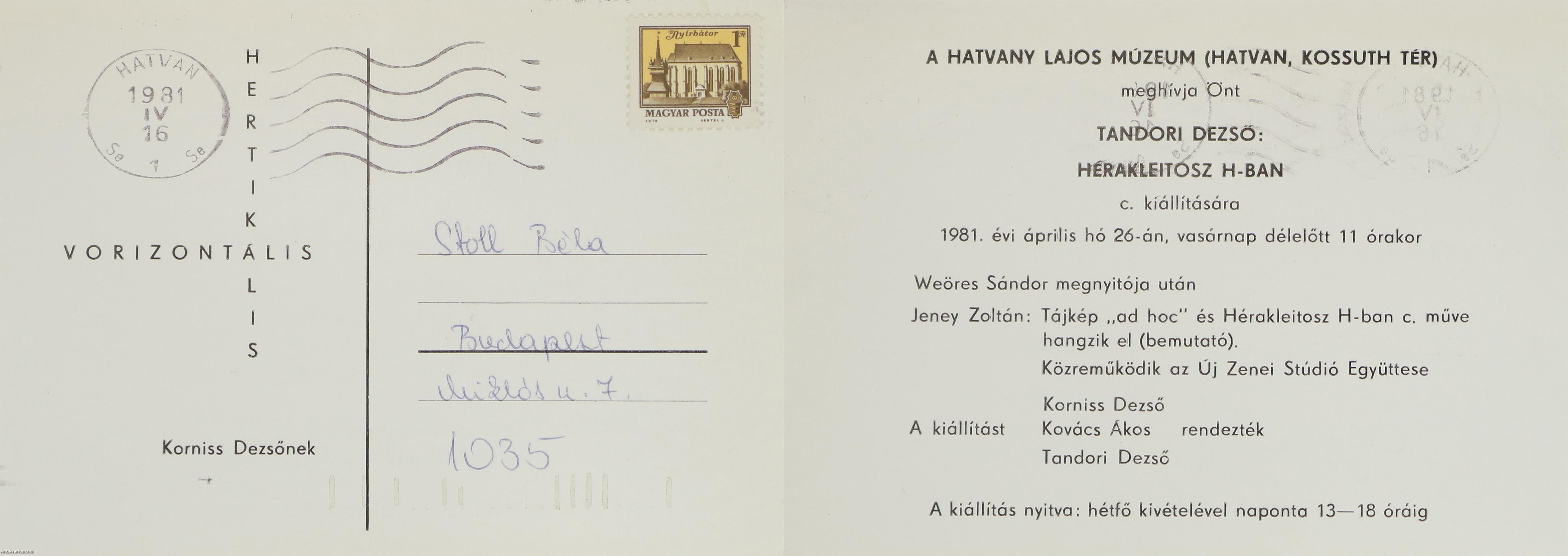 - Hatvany Lajos "Hérakleitosz H-ban" c. kiállítására készített, postai bélyeggel és bélyegzővel ellátott meghívó.