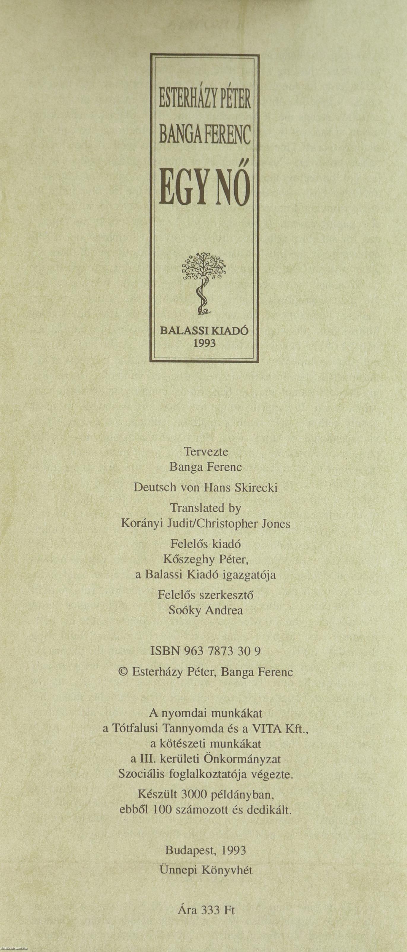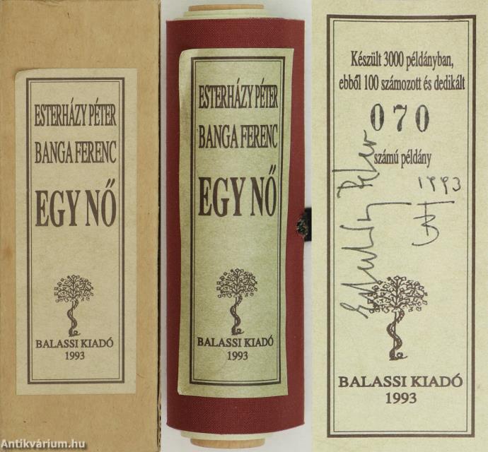 Számozott kiadás. Egy nő. Írta: Esterházy Péter. Tervezte: Banga Ferenc.